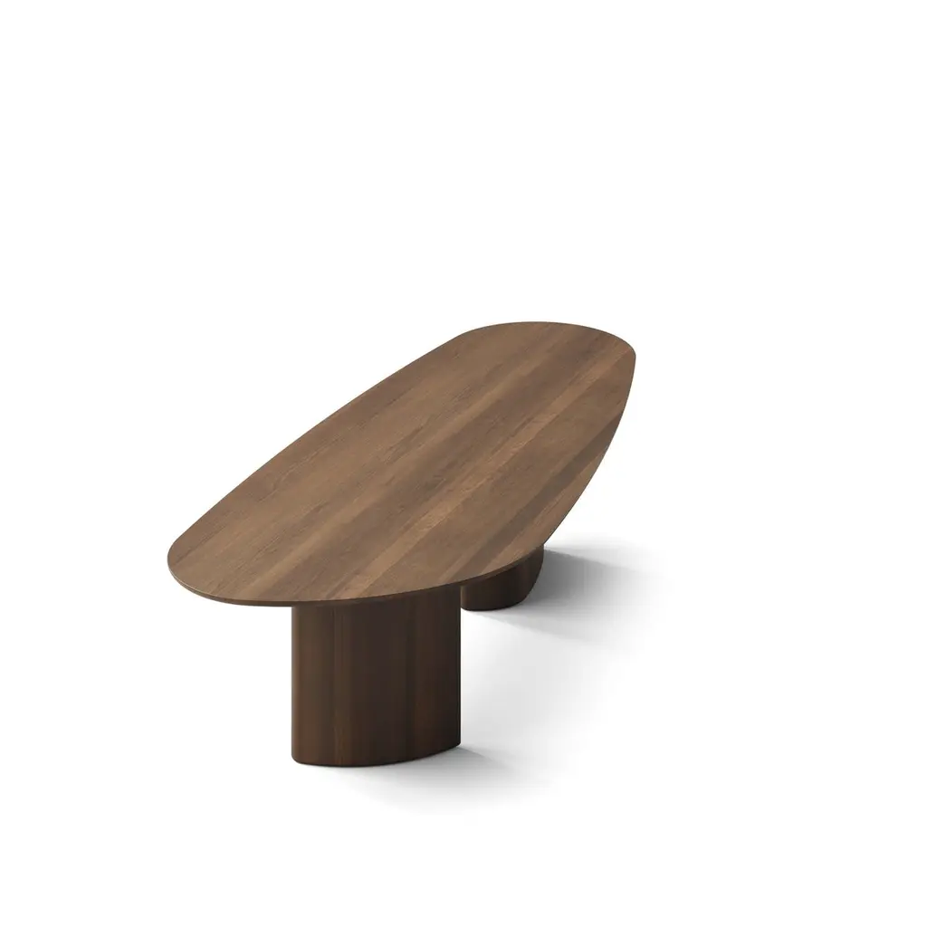 Contemporary Rectangular Dining Table 'Tangent' designed by Anne Boysen for DK3Handmade in DenmarkDimensions:- H.72 x 400 x 110 cm - Big leg: 60 x 24,3 cm / Small leg: 54,8 x 11,8 cm- 3 cm thicknessModel shown on main picture:- Top: Rectangular- Wood: Smoked Oak- Size: 400 cmWood finishes available:- Oak- Lacquered Oak- Smoked Oak- Walnut- Lacquered WalnutSizes: - 240 cm- 270 cm- 300 cm- 340 cm- 370 cm- 400 cmTop shapes available:- Round- RectangularPossibility of putting an extension leaf of 50 cm----The Tangent Table is created for dk3 by Danish architect and designer Anne Boysen. The table balances form, function and craftsmanship in a design that appears modern and timeless at the same time. It comes in a rectangular and a round version, each interpreting the distinct and original design characterized by its unique base and asymmetrical tabletop.The form is built entirely from tangential arcs that flow seamlessly into each other, creating a sculptural, well-balanced whole with subtle asymmetry. The tabletop is made of wide solid wood sticks running lengthwise, which gives the table a calm and refined look. The curved edge of the tabletop adds a light and almost floating expression to the table.The dk3 collection combines exclusive classic and contemporary furniture from renowned Danish architects and designers such as Jeppe Utzon, Poul Cadovius, and others. The brand is represented by furniture retailers in more than 30 countries around the world.80% of the dk3 collection is crafted in carpentries in Denmark, while the remainder is produced in workshops across Europe.dk3 creates and produces furniture pieces shaped and crafted by true enthusiasts, always with the ambition to unite the finest carpentry traditions with both modern and classic furniture design, blending timeless steel or brass with high-quality wood. The love for organic materials and the uncompromising focus on quality are evident throughout the entire process, from the initial design sketches to manufacturing in the carpentries, where most pieces are hand-finished and surface-treated