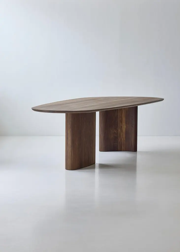 Contemporary Rectangular Dining Table 'Tangent' designed by Anne Boysen for DK3Handmade in DenmarkDimensions:- H.72 x 270 x 110 cm - Big leg: 60 x 24,3 cm / Small leg: 54,8 x 11,8 cm- 3 cm thicknessModel shown on main picture:- Top: Rectangular- Wood: Walnut- Size: 270 cmWood finishes available:- Oak- Lacquered Oak- Smoked Oak- Walnut- Lacquered WalnutSizes: - 240 cm- 270 cm- 300 cm- 340 cm- 370 cm- 400 cmTop shapes available:- Round- RectangularPossibility of putting an extension leaf of 50 cm----The Tangent Table is created for dk3 by Danish architect and designer Anne Boysen. The table balances form, function and craftsmanship in a design that appears modern and timeless at the same time. It comes in a rectangular and a round version, each interpreting the distinct and original design characterized by its unique base and asymmetrical tabletop.The form is built entirely from tangential arcs that flow seamlessly into each other, creating a sculptural, well-balanced whole with subtle asymmetry. The tabletop is made of wide solid wood sticks running lengthwise, which gives the table a calm and refined look. The curved edge of the tabletop adds a light and almost floating expression to the table.The dk3 collection combines exclusive classic and contemporary furniture from renowned Danish architects and designers such as Jeppe Utzon, Poul Cadovius, and others. The brand is represented by furniture retailers in more than 30 countries around the world.80% of the dk3 collection is crafted in carpentries in Denmark, while the remainder is produced in workshops across Europe.dk3 creates and produces furniture pieces shaped and crafted by true enthusiasts, always with the ambition to unite the finest carpentry traditions with both modern and classic furniture design, blending timeless steel or brass with high-quality wood. The love for organic materials and the uncompromising focus on quality are evident throughout the entire process, from the initial design sketches to manufacturing in the carpentries, where most pieces are hand-finished and surface-treated