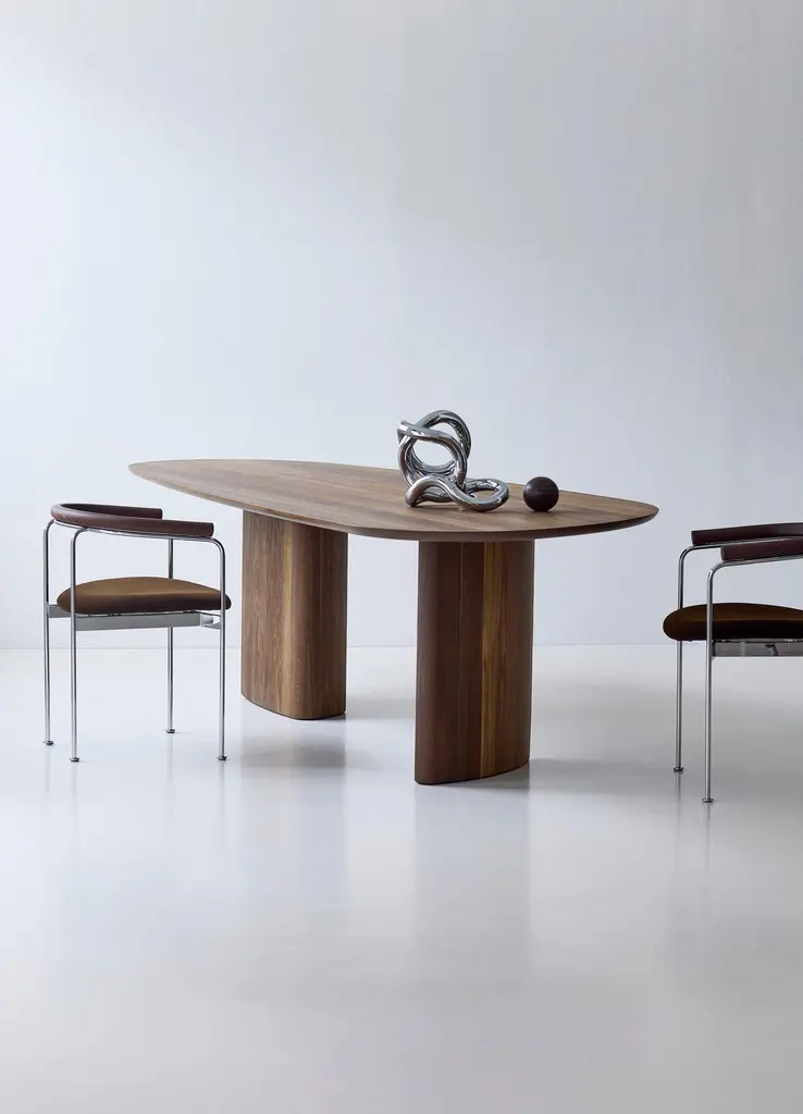 Contemporary Rectangular Dining Table 'Tangent' designed by Anne Boysen for DK3Handmade in DenmarkDimensions:- H. 72 x 300 x 110 cm - Big leg: 60 x 24,3 cm / Small leg: 54,8 x 11,8 cm- 3 cm thicknessModel shown on main picture:- Top: Rectangular- Wood: Walnut Lacquered- Size: 300 cmWood finishes available:- Oak- Lacquered Oak- Smoked Oak- Walnut- Lacquered WalnutSizes: - 240 cm- 270 cm- 300 cm- 340 cm- 370 cm- 400 cmTop shapes available:- Round- RectangularPossibility of putting an extension leaf of 50 cm----The Tangent Table is created for dk3 by Danish architect and designer Anne Boysen. The table balances form, function and craftsmanship in a design that appears modern and timeless at the same time. It comes in a rectangular and a round version, each interpreting the distinct and original design characterized by its unique base and asymmetrical tabletop.The form is built entirely from tangential arcs that flow seamlessly into each other, creating a sculptural, well-balanced whole with subtle asymmetry. The tabletop is made of wide solid wood sticks running lengthwise, which gives the table a calm and refined look. The curved edge of the tabletop adds a light and almost floating expression to the table.The dk3 collection combines exclusive classic and contemporary furniture from renowned Danish architects and designers such as Jeppe Utzon, Poul Cadovius, and others. The brand is represented by furniture retailers in more than 30 countries around the world.80% of the dk3 collection is crafted in carpentries in Denmark, while the remainder is produced in workshops across Europe.dk3 creates and produces furniture pieces shaped and crafted by true enthusiasts, always with the ambition to unite the finest carpentry traditions with both modern and classic furniture design, blending timeless steel or brass with high-quality wood. The love for organic materials and the uncompromising focus on quality are evident throughout the entire process, from the initial design sketches to manufacturing in the carpentries, where most pieces are hand-finished and surface-treated