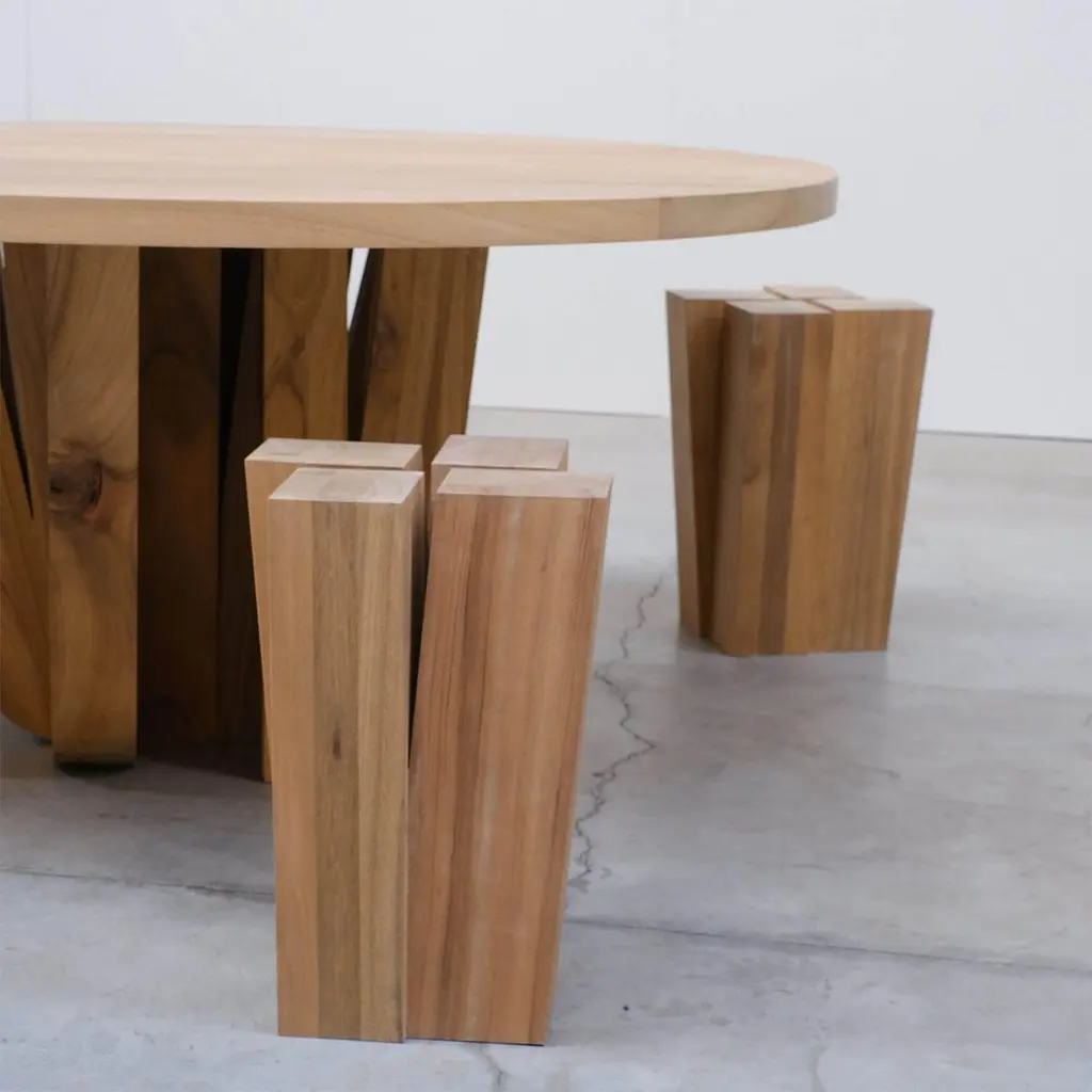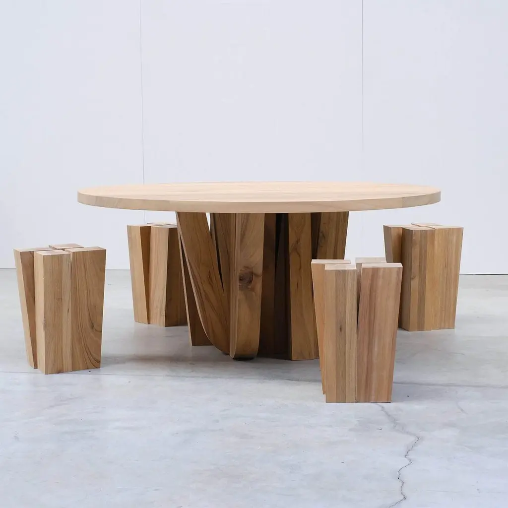 Contemporary round dining table in african walnut - Zoumey by Arno DeclercqDimensions: diameter 160 x height 75 cmMaterial: African walnutA forest of table legs made out of 16 pieces of African walnut.A dining table for 6 personsMade by hand, in Belgium.Crate included in the price.Arno DeclercqBelgian designer and art dealer who makes bespoke objects with passion for design, atmosphere, history and craft. Arno grew up in a family with parents who like to work with beautiful brands and objects.His father studied at the Royal Academy of Arts Fashion Department, he worked for Bikkembergs and made his own fashion brands, but has also collected tribal arts for more than 20 years. His mother, who worked with his father from the beginning, bought a shoe store in 2010 where they sold brands as Rick Owens, Ann Demeulemeester, Maison Martin Margiela. With the interest in beauty he learned from his parents, Arno studied interior design, after learning a lot about materials and with great knowledge of history he designed interiors and opened his own gallery for ethnographic art and design.The collection has come to the idea that there are too few interiors where they no longer have the big and static vases and candlesticks that the people had in big houses over 100 years ago. By focusing on architecture, ancient arts and design, after war buildings, defense buildings (bunkers and fortresses) and tribal arts, he created a collection that became a Classic.Each piece is unique because it is entirely handcrafted by him. Made of tropical hardwood called Iroko this he discovered after one of his many trips to West Africa interested in voodoo arts. In these strange tribal arts, the wood "Iroko" is used in many objects, according to their culture, the ancestors lives in these trees, and they also call this tree "the king of the forest".Arno also combines this with Belgian oak, that dried for more than 30 years, wood that was provided for the many furniture makers in Mechelen.By treating these objects through the Yakusugi technique or another mentioned "Shou Sugi Ban" an ancient Japanese technique where the objects are burned to protect the wood from weathering and subsequently fixed to get a patina look as long as possible. This gives each object a unique texture.