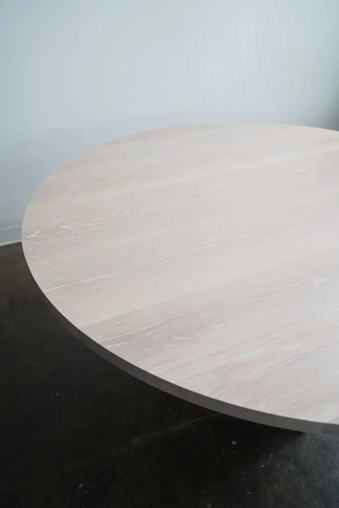 Contemporary round dining table with a solid wood top and legs by Last Workshop.New, and made-to-orderCustomers can choose from:Wood species, finishes, and overall dimensions.Dimensions shown: 65” diameter x 30" height.Finish shown: white oiled oak.