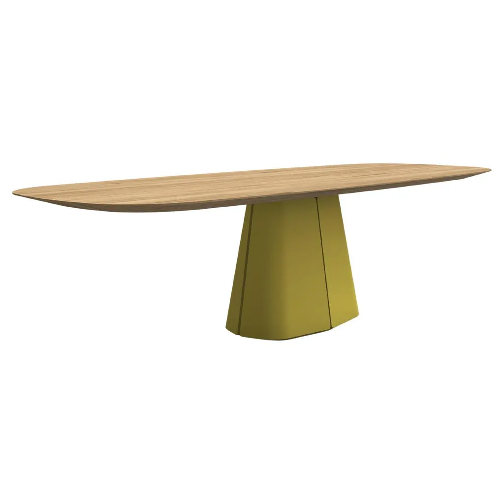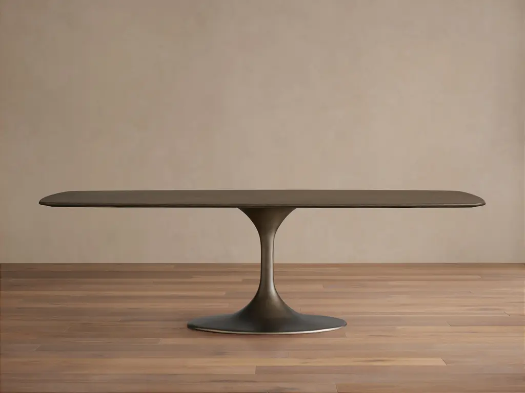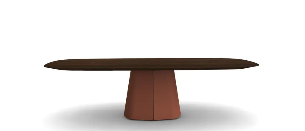 A refined statement piece, this sculptural dining table features a softly contoured rectangular top resting on a bold, tapered plinth base. Crafted in rich walnut, the table showcases a continuous grain flow and seamless transitions between surfaces, emphasizing craftsmanship and materiality. The pedestal-style base offers generous legroom and creates a clean, architectural silhouette from every angle. Ideal for contemporary interiors, this table blends organic elegance with modern simplicity, making it a striking centerpiece for dining rooms or design-forward spaces.Note: Pricing reflects the finish and material shown in the primary image. Alternate finishes and customizations are available upon request.Customization:The tabletop is offered in wood, marble, or combination.The customizable nature of the tabletop and base materials ensures that it can complement a wide range of interior styles and color schemes.Whether used in a formal dining room or a more casual setting, the table's design and quality construction make it a versatile addition to any home.Quality and Craftsmanship:Handcrafted with attention to detail and a commitment to high-quality materials and construction techniques.Please contact us if you have any questions about customization and pricing. We will be glad to check with the factory’s technical team if sizes, finishes, and colors can be customized. We do our best to expedite production and to ship and deliver product within the listed lead time, however current lead times might be longer due to global shipping backlog and delays. These delays are out of our control and cannot be a reason to cancel an order.