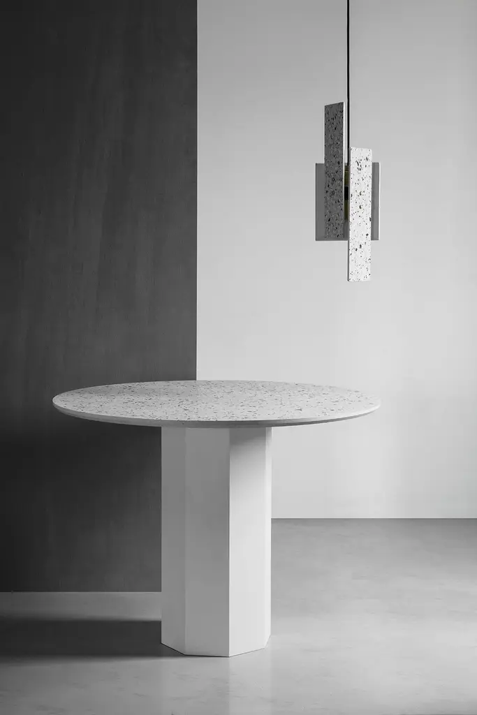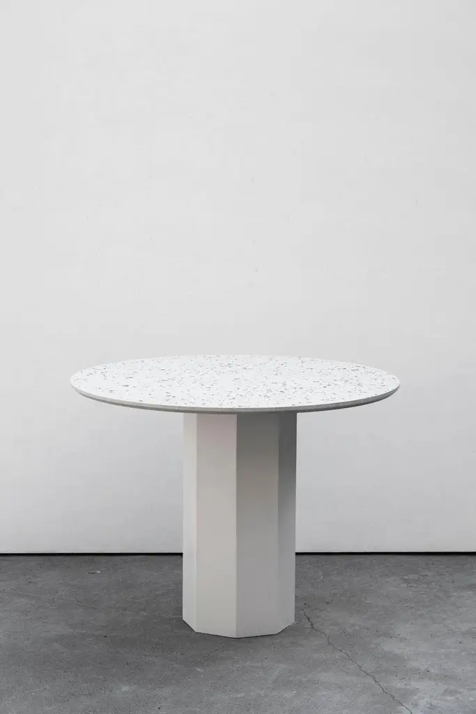 'GONG' is a dining table made of terrazzo and steel.by Bentu DesignIndoor or outdoor use.Dimensions: Ø100cm x H75 cmBentu Design's furniture derives its uniqueness from the simplicity of its forms and its materials. Designed and manufactured by the designers of Studio Bentu themselves, these lamps, coffee tables, cup-boards and seats all have in common the use of concrete. This material that is usually reserved for construction use, finds here a certain nobility. The patterns that are created by the grains of this material once it flowed and unmolded is what gives the creations of Studio Bentu their originality. Accompanied at times finishing’s that are more valuable like marble or polished brass, making concrete a more suitable material for furniture.BENTU Design Studio was founded in 2012 as an independent design brand. They engage in product design and innovation. With a basic method of design, they are committed to make different materials return to their essence, present their unique texture and produce the products that suit our daily demand.