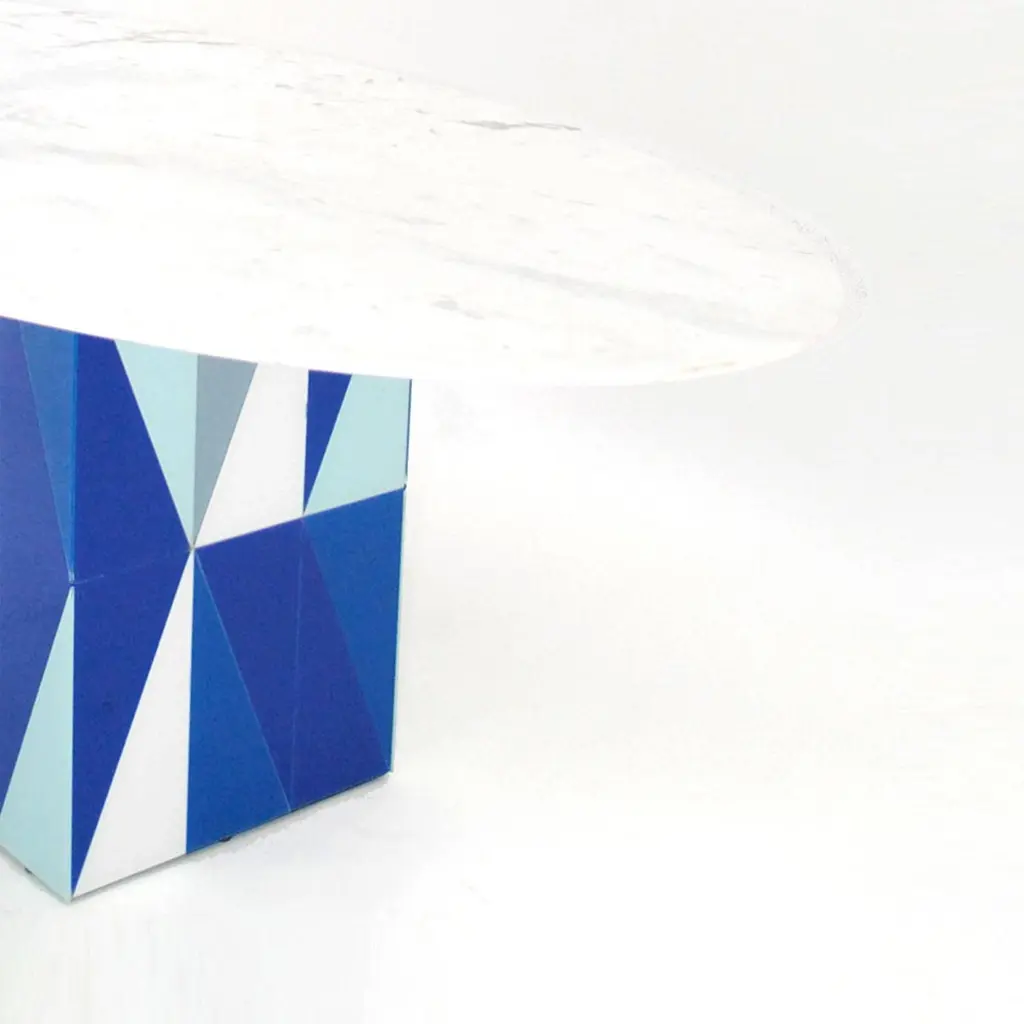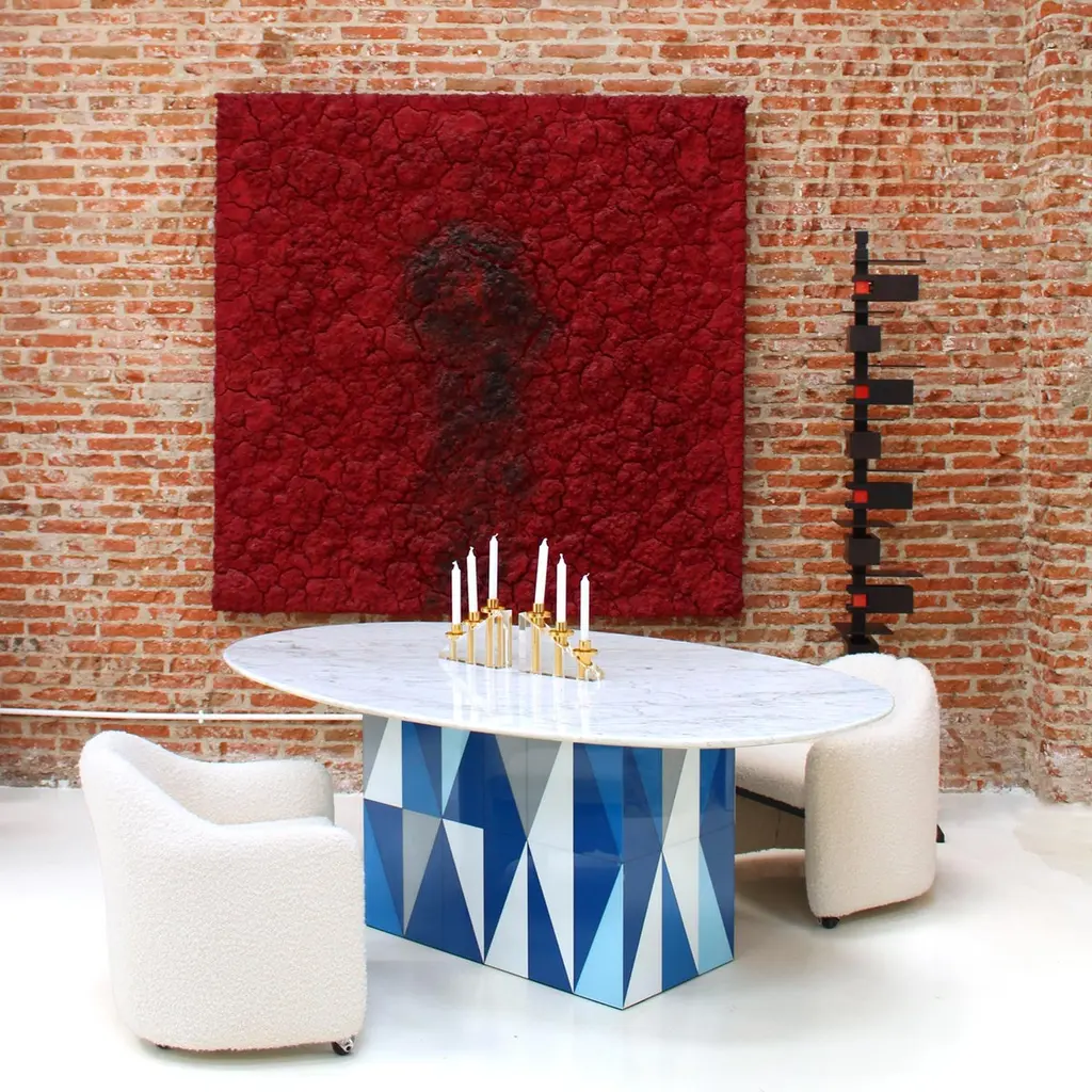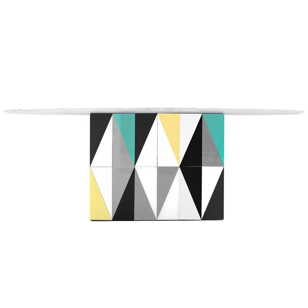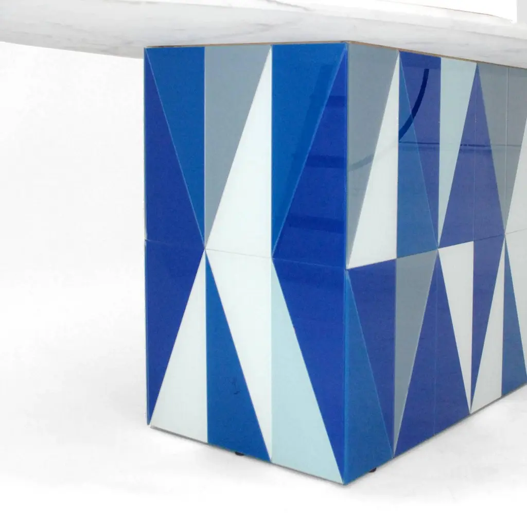 Contemporary dining table inspired on Gio Ponti's pattern. Made in wood covered in painted lacobel crystal with marble on top.Every item LA Studio offers is checked by our team of 10 craftsmen in our in-house workshop. Special restoration or reupholstery requests can be done. Lighting can be electrified to the required voltage. Every piece design of LA Studio or new production as they are made with natural materials or made by artisans they may vary in wood color, marble color or wood grain, etc.Take into account that the colors on the furniture may vary depending on the type of lighting and the type of screen from which you see the images.