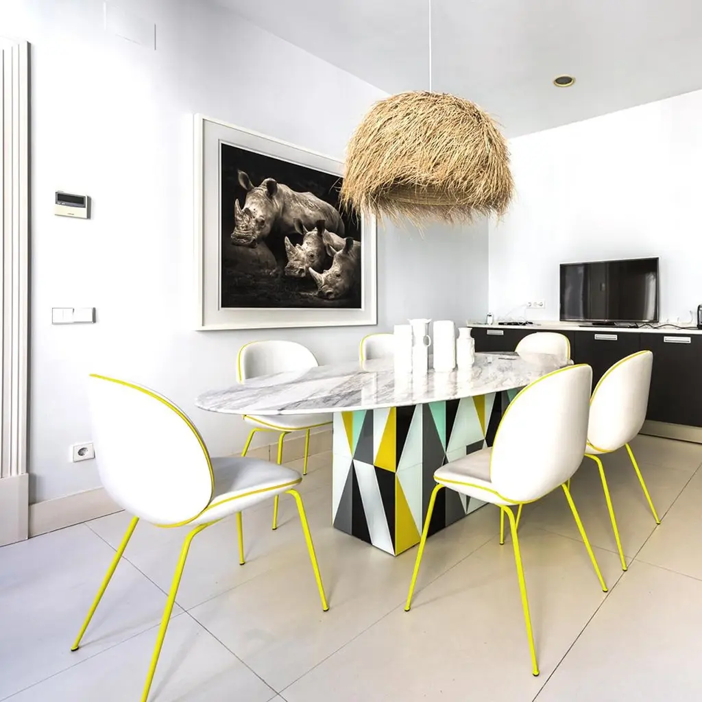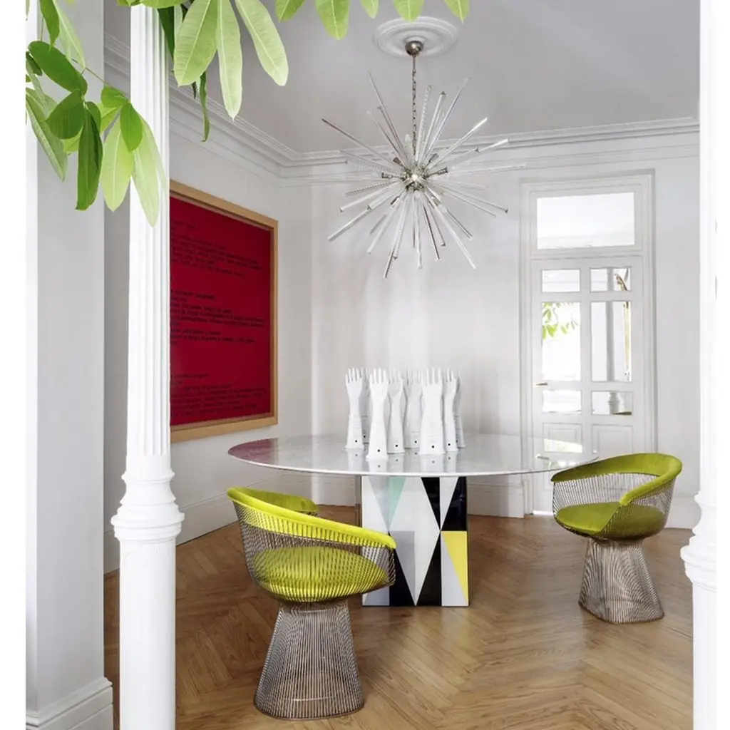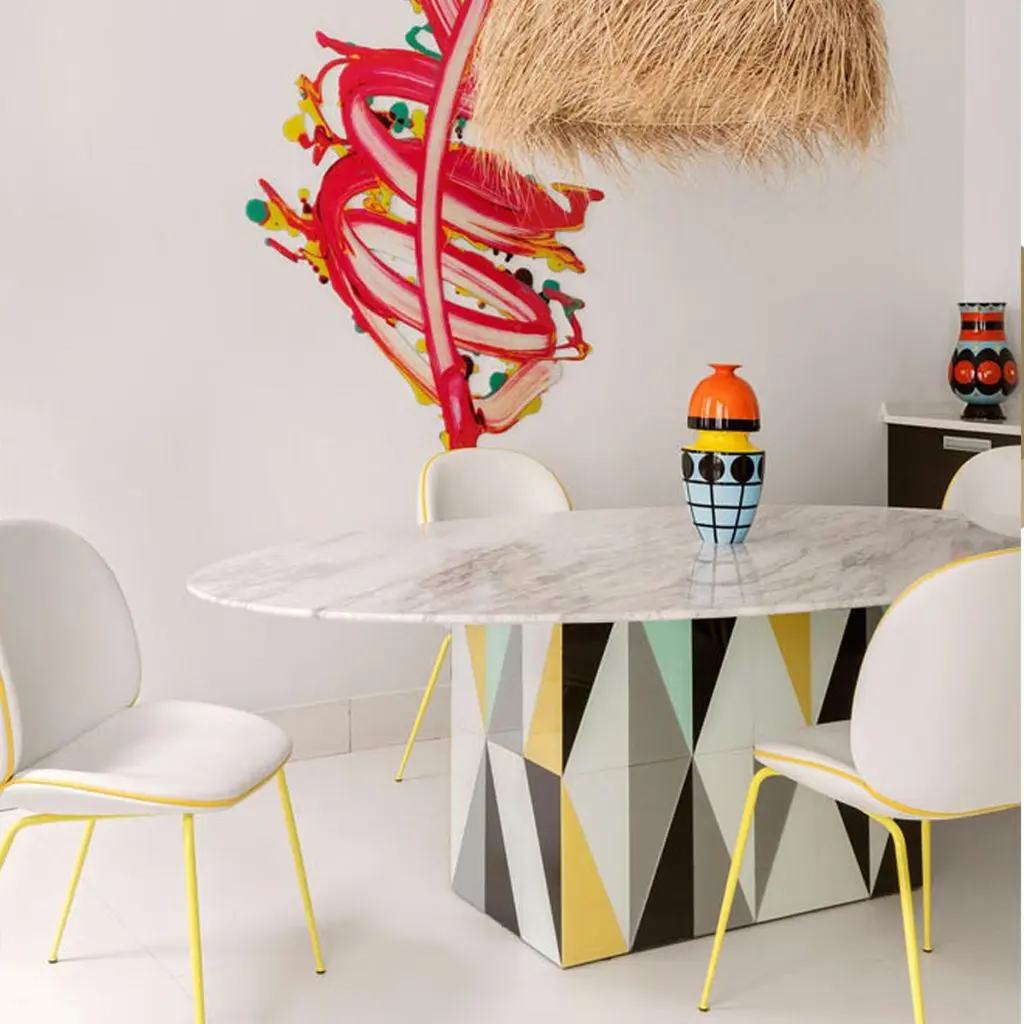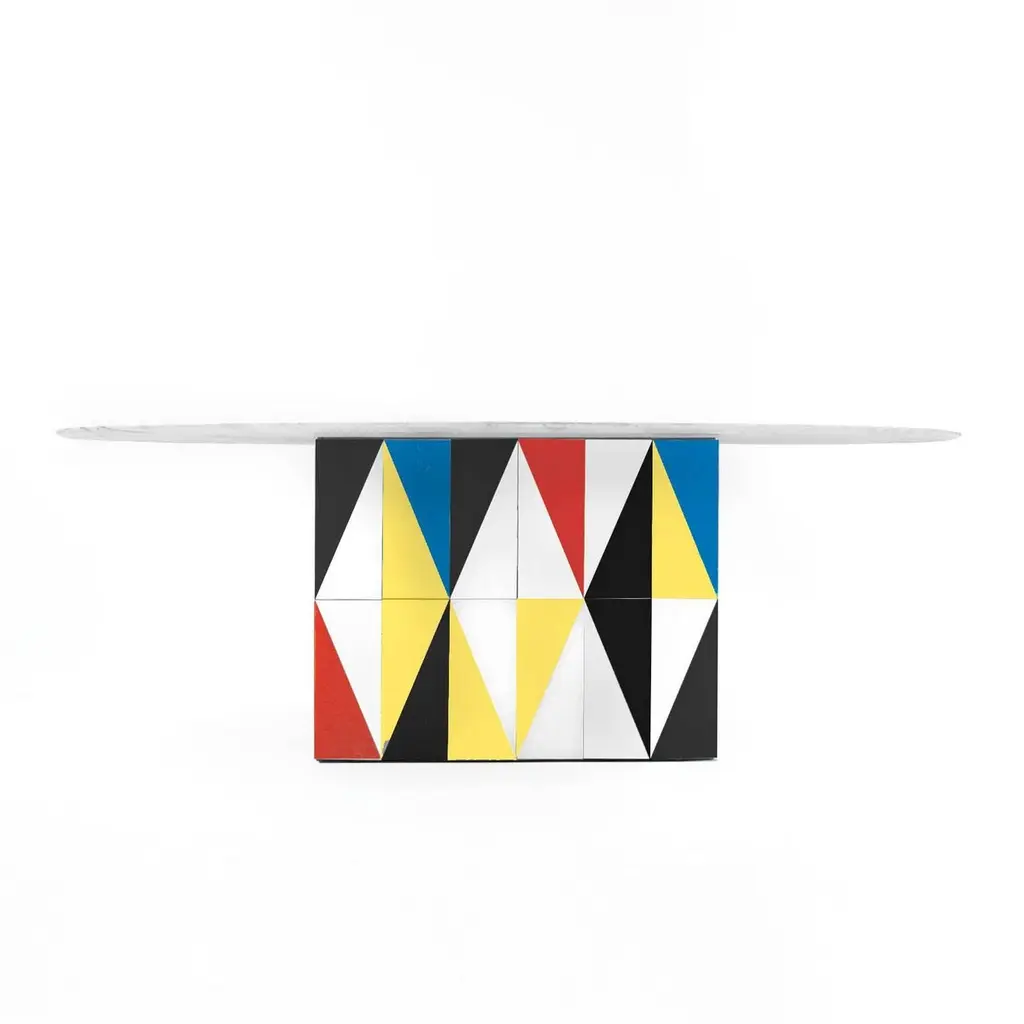 Contemporary dining table inspired on Gio Ponti's pattern. Made in wood covered in painted lacobel crystal with marble on top.Every item LA Studio offers is checked by our team of 10 craftsmen in our in-house workshop. Special restoration or reupholstery requests can be done. Lighting can be electrified to the required voltage. Every piece design of LA Studio or new production as they are made with natural materials or made by artisans they may vary in wood color, marble color or wood grain, etc.Take into account that the colors on the furniture may vary depending on the type of lighting and the type of screen from which you see the images.