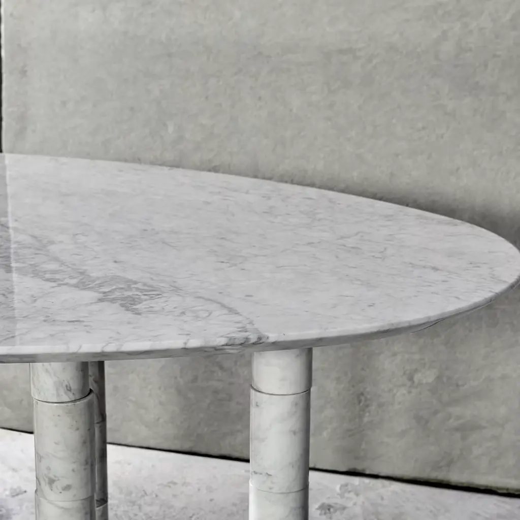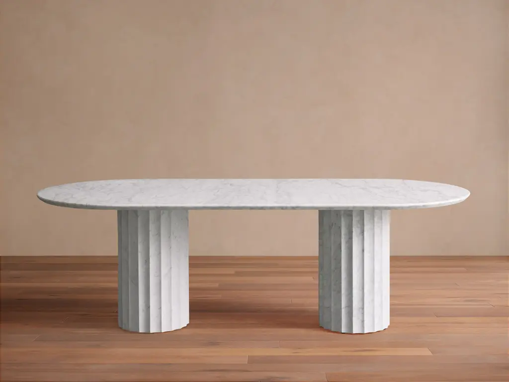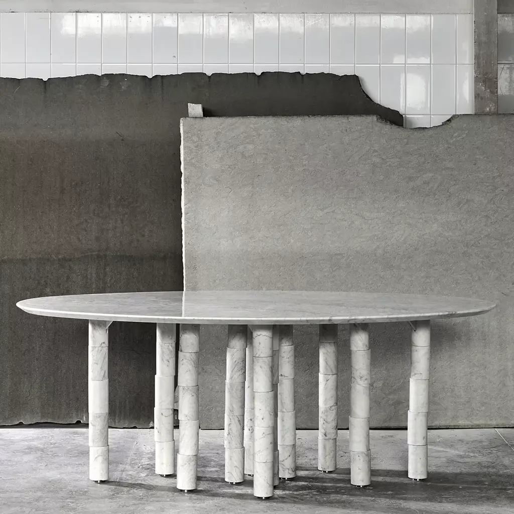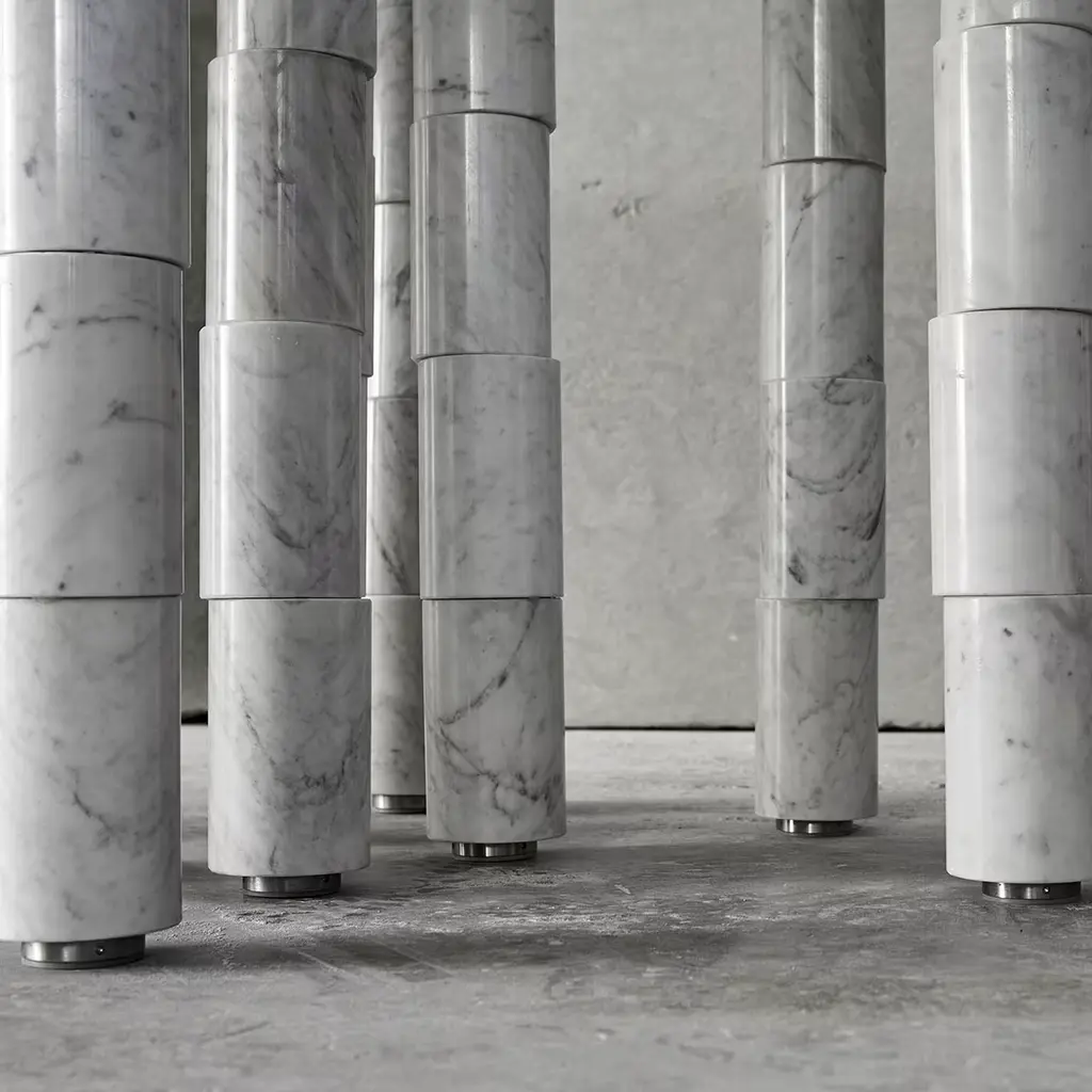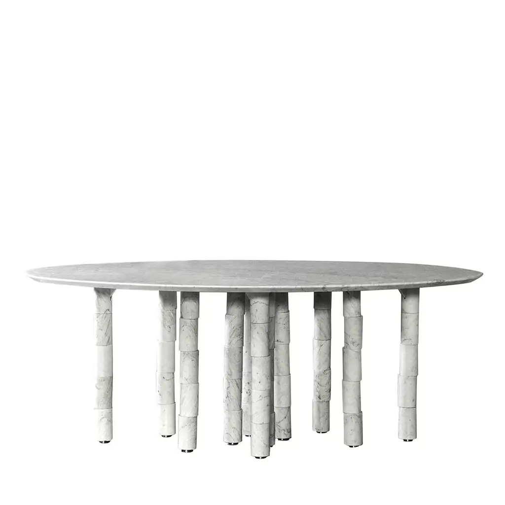 Convivio Bambù is a striking dining table featuring a unique design characterized by twelve asymmetrical cylindrical legs. These distinct supports create a bold visual impression, appearing to defy gravity while providing stable support for the impressive Carrara marble tabletop measuring 200 cm by 120 cm. This unconventional formation transforms an essential piece of furniture into a captivating centerpiece, showcasing both artistic innovation and functional elegance. Crafted with meticulous attention to detail, this table stands as a testament to contemporary design, seamlessly fitting into any sophisticated dining space.