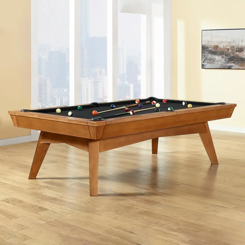 The Copenhagen Slate Pool Table from Playcraft brings modern sophistication to your home with its sleek design and premium solid hardwood construction. Finished in a warm Whiskey caramel tone, its clean lines complement any décor while promising lasting enjoyment. Equipped with inlaid sights and premium K66 gum rubber cushions, it delivers precise, reliable play. Optional accessories include a matching dining top and benches with storage, blending style and functionality for a refined entertainment experience. Highlights