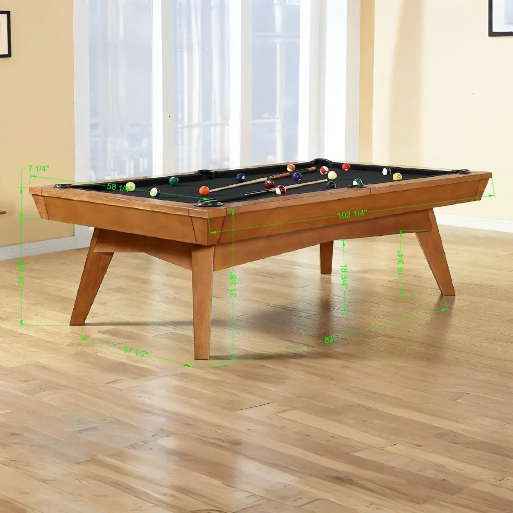 The Copenhagen Slate Pool Table from Playcraft brings modern sophistication to your home with its sleek design and premium solid hardwood construction. Finished in a warm Whiskey caramel tone, its clean lines complement any décor while promising lasting enjoyment. Equipped with inlaid sights and premium K66 gum rubber cushions, it delivers precise, reliable play. Optional accessories include a matching dining top and benches with storage, blending style and functionality for a refined entertainment experience. Highlights