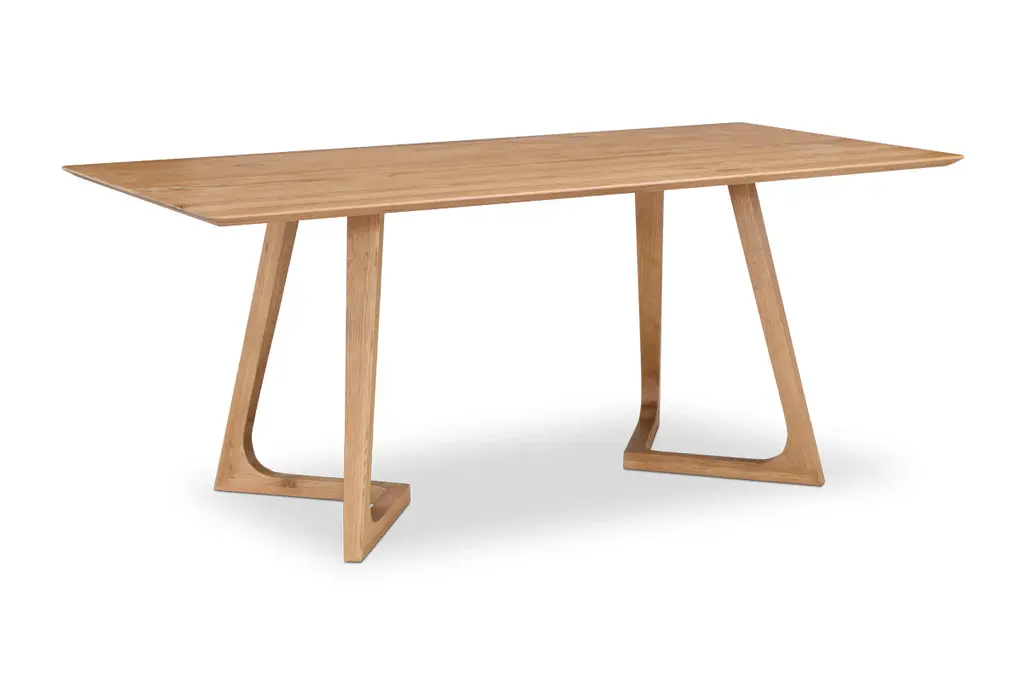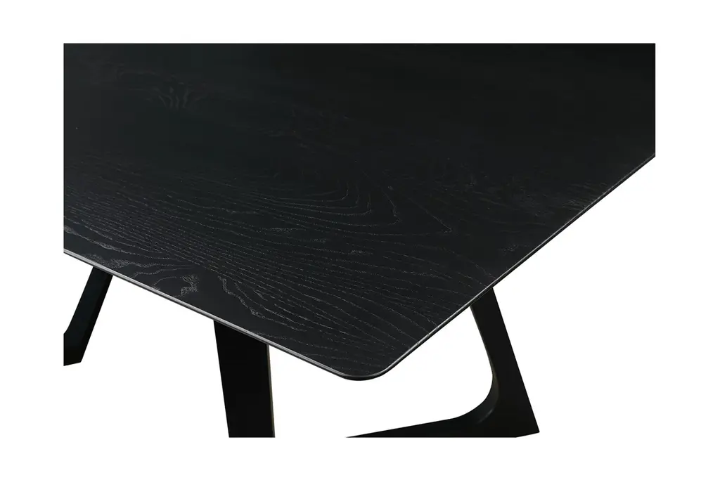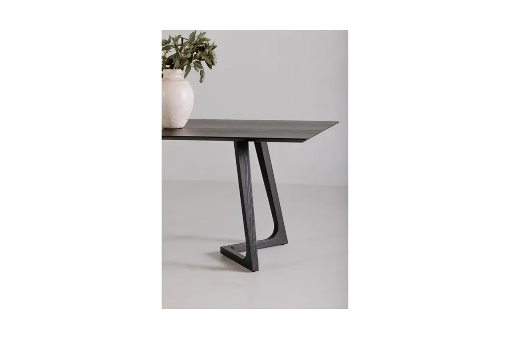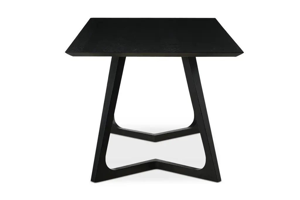 Crafted with solid wood, the Coram Dining Table blends contemporary style with a distinctive Mid-Century twist. Inverted, angular legs add modern flair to a streamlined silhouette and create plenty of legroom. The large rectangular tabletop is perfect for filling larger spaces and comfortably seats up to 8 people. Choose between rich brown walnut, blackened ash, or oak with a natural finish to complement your home.