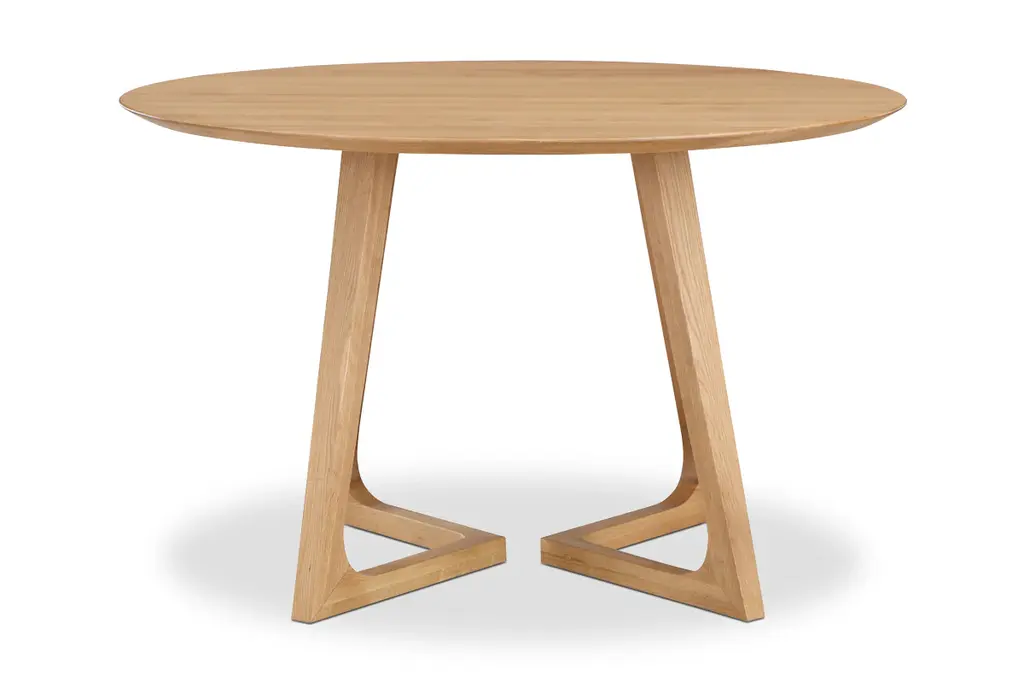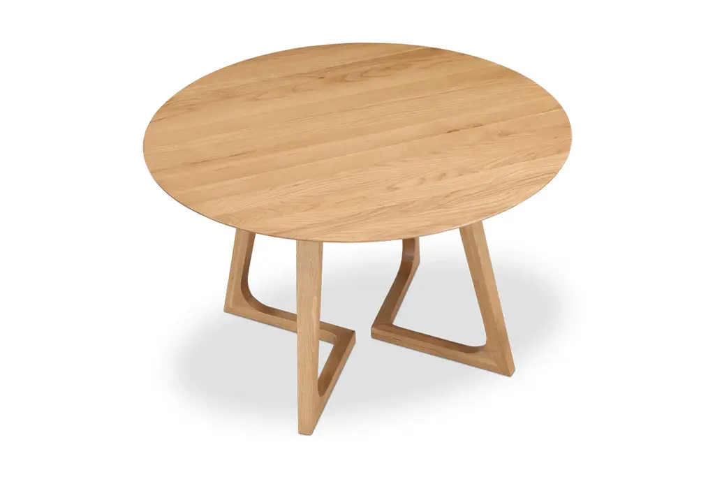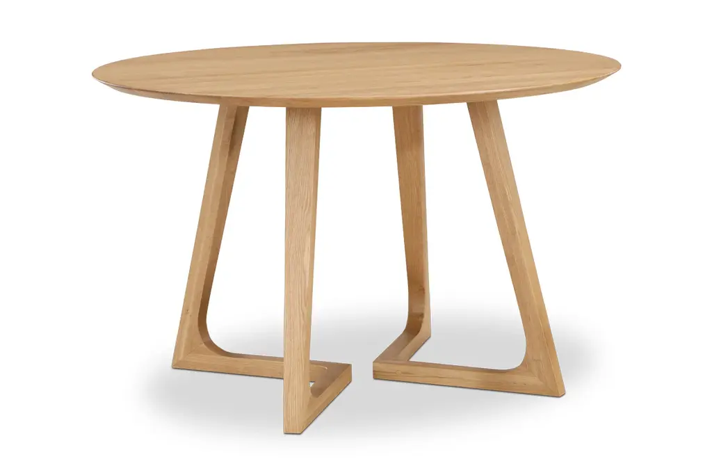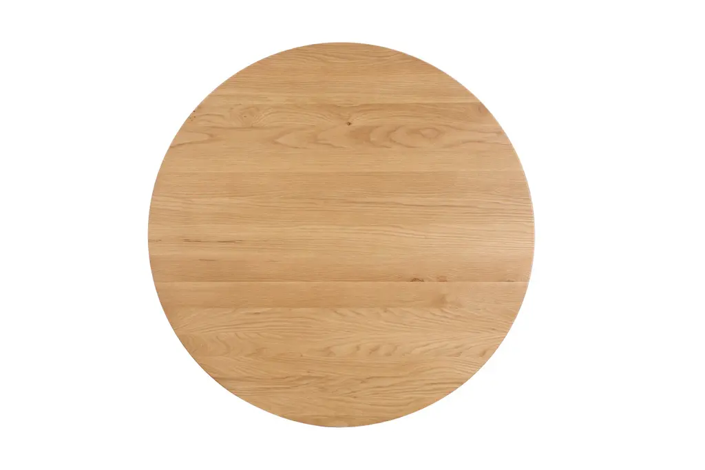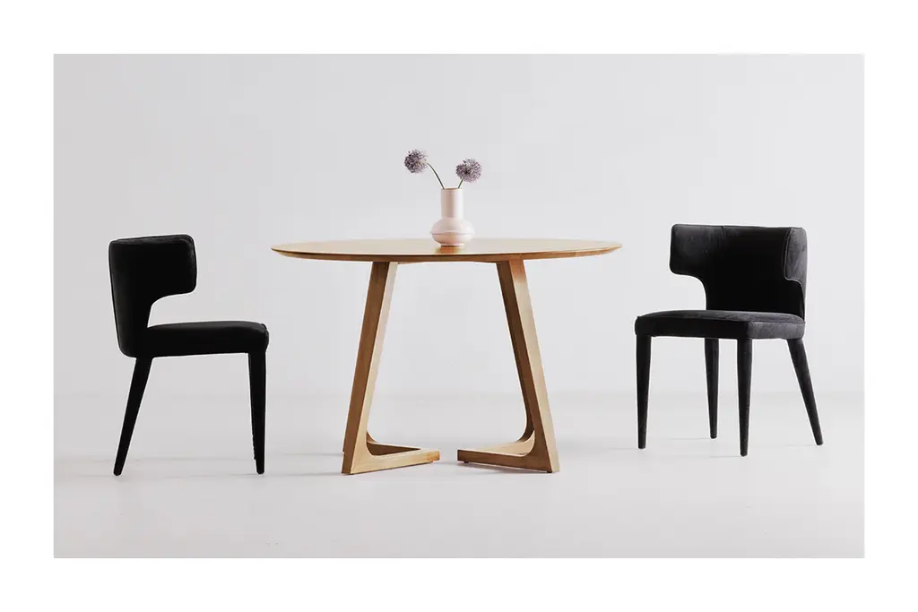The Coram/Jaclyn Round Dining Bundle pairs one oak or walnut Coram Round Dining Table with two or four black Jaclyn Dining Chairs. Crafted with solid wood, the Coram Round Dining Table blends contemporary style with a distinctive Mid-Century twist. Inverted, angular legs add modern flair to a streamlined silhouette and create plenty of legroom. The circular tabletop adds balance to your space and comfortably seats four people. Choose between rich brown walnut, or oak with a natural finish to complement your home. With its sculptural silhouette and all-over upholstery, the Jaclyn Dining Chair in black commands attention, adding a standout modern flair to your living or dining space. The curved, barrel-style backrest and plush foam padding create a comfortable, supportive seat, while a sturdy metal frame ensures durability.