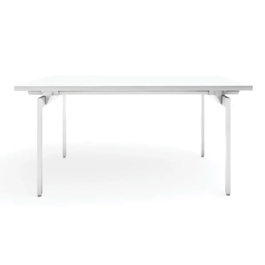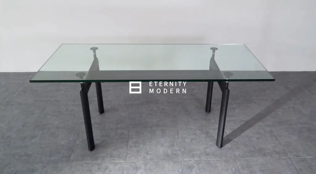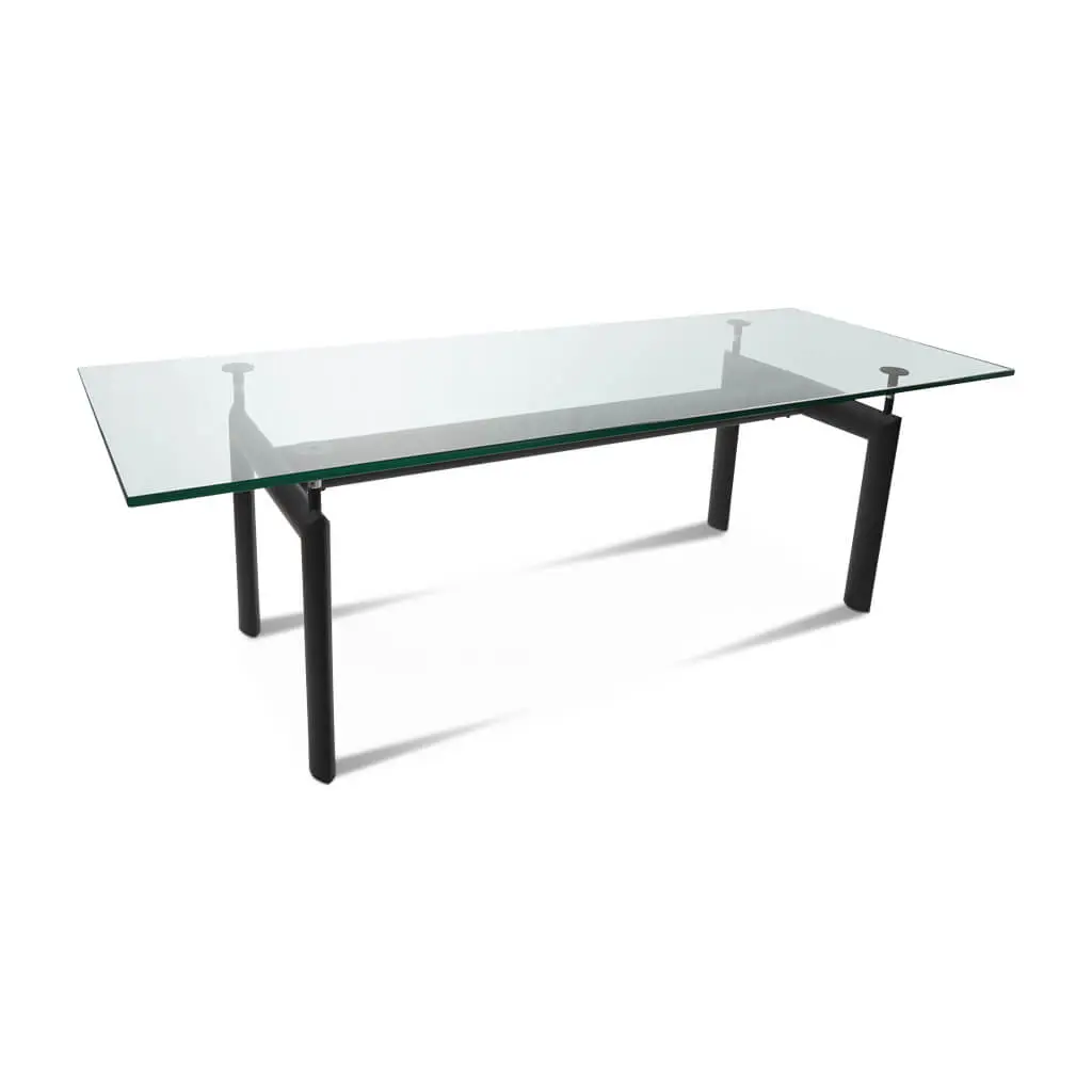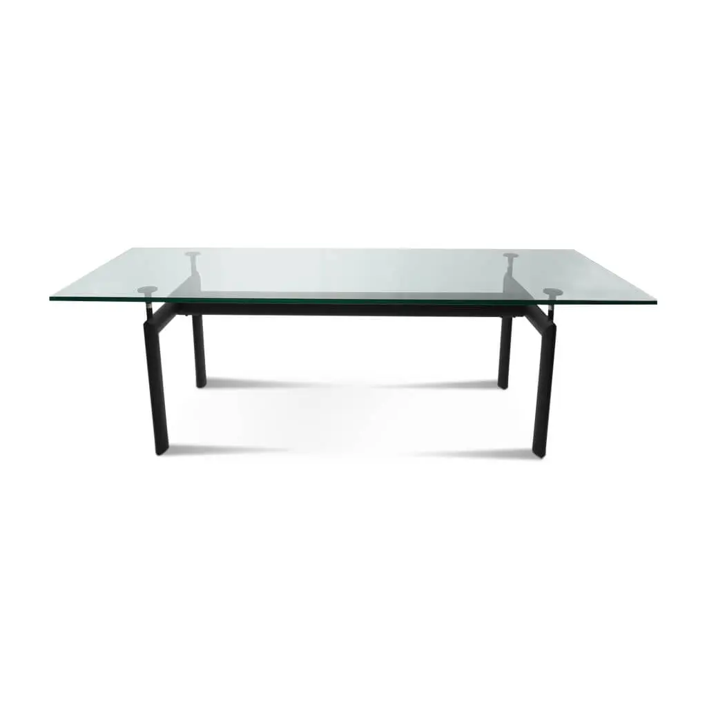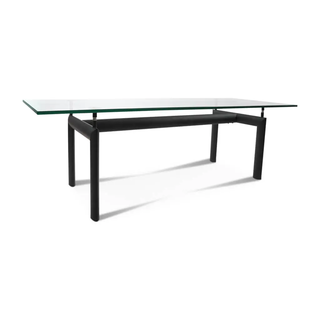 In 1929 at the Salon D'autumne in Paris and his team of designers presented a revolutionary collection of furniture that stunned the city. Among the pieces was the ethereal yet bold Corbusier Dining Table (1928), a mathematically refined structure of steel and glass that has become one of the most important International Style tables of the 20th century. Made of aeronautical steel, the base is welded for a seamless finish with sculpted angles and smooth, mitered corners.The table top is a 19mm-thick rectangle of tempered glass, making the Corbusier Table equally right as a dining table or in the conference room. Together the elements create a sense of line, scale, and proportion unsurpassed by other designs.