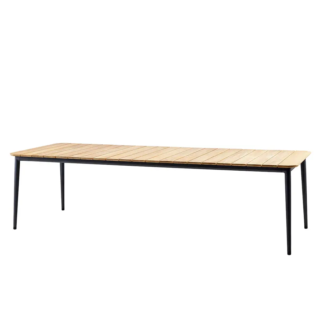 Cane-line's new table Core combines the classic with the modern and lifts the use of teak in outdoor furniture to new levels. The soft curves of the table top are paired with a frame of conical pipes in powder coated aluminum. The result is a table that in spite of its light appearance is very strong and hardwearing. The teak slats are hand-selected and of highest quality, supplied by WWF/GFTN certified members in Indonesia. The Core tables come in three different sizes and two frame colours enabling you to find the right table for your needs. Core is designed by Foersom + Hiort-Lorenzen.