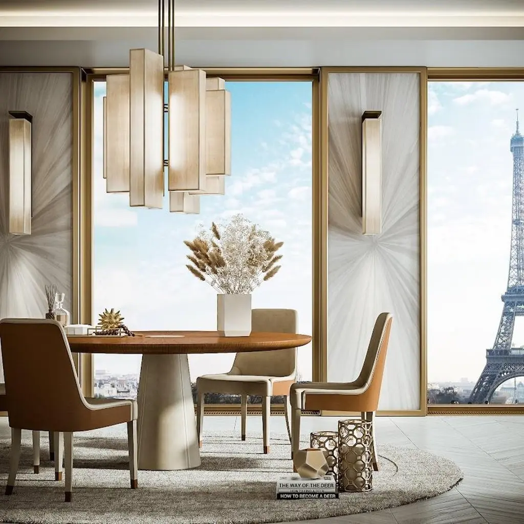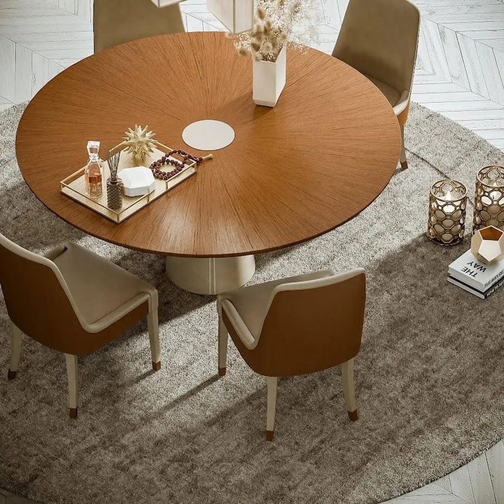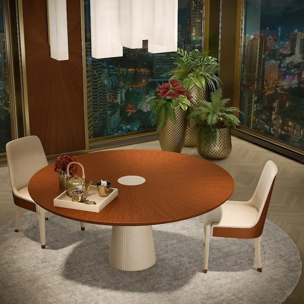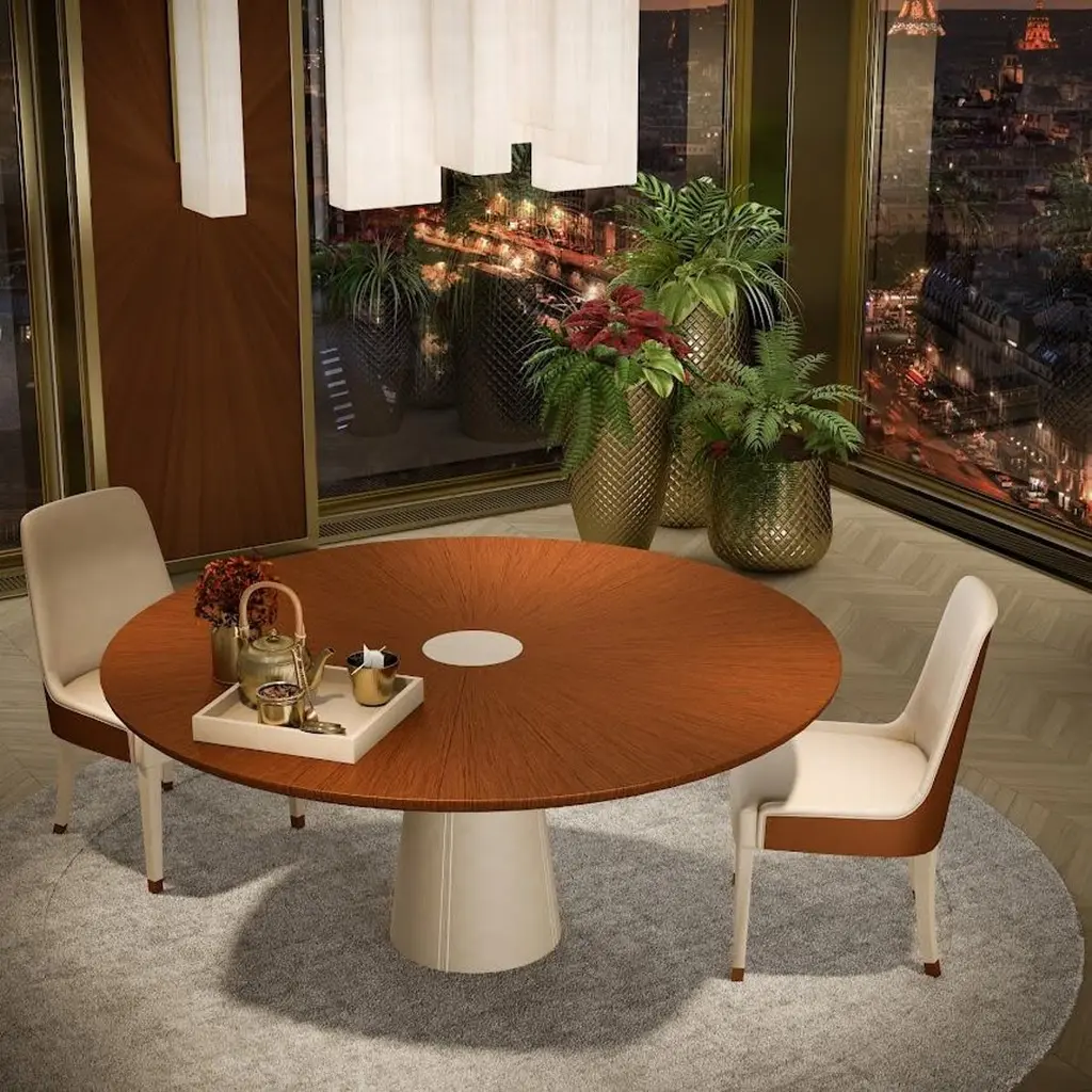 CORNEILLE TABLE by Hugues ChevalierThe Corneille Table is a refined dining or meeting table that embodies contemporary elegance. Featuring a meticulously crafted wood-inlaid tabletop, it is available in matte, satin, or glossy varnish finishes. The centerpiece adds a touch of luxury with options in stitched leather, marble, or bronze and lacquered finishes (customizable in RAL colors).The table’s base mirrors this sophistication, crafted from stitched leather (Category B) or finished in bronze or lacquer. Its sleek design and premium materials make it a striking addition to any modern interior, seamlessly blending functionality with artistry. Whether used for dining or professional meetings, the Corneille Table offers an exquisite balance of form and function, enhancing any space with its timeless appeal...