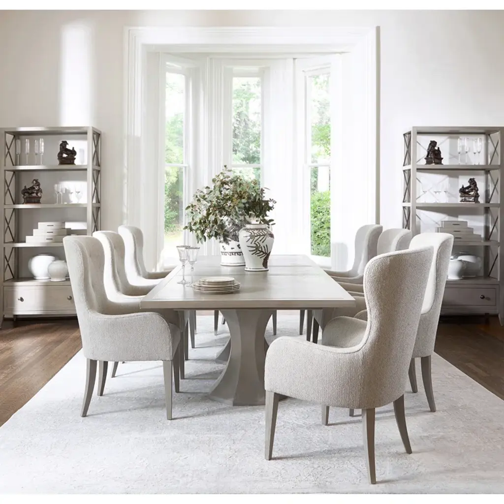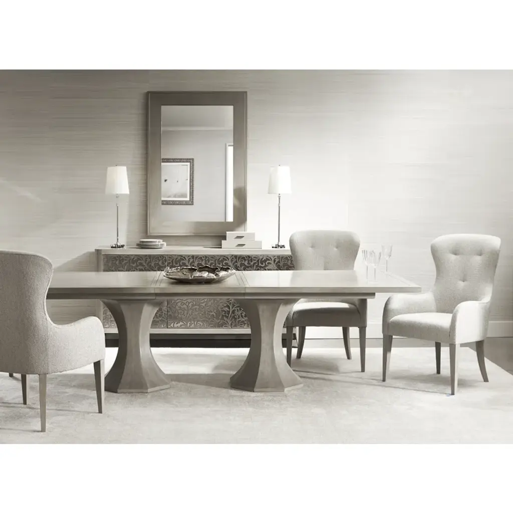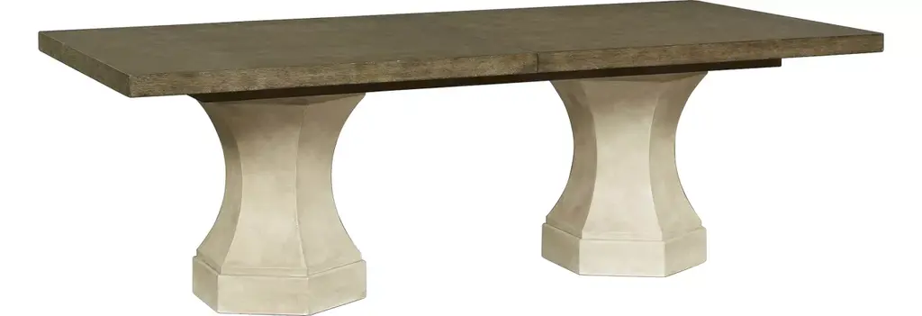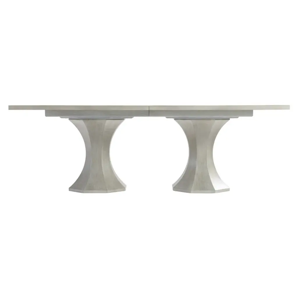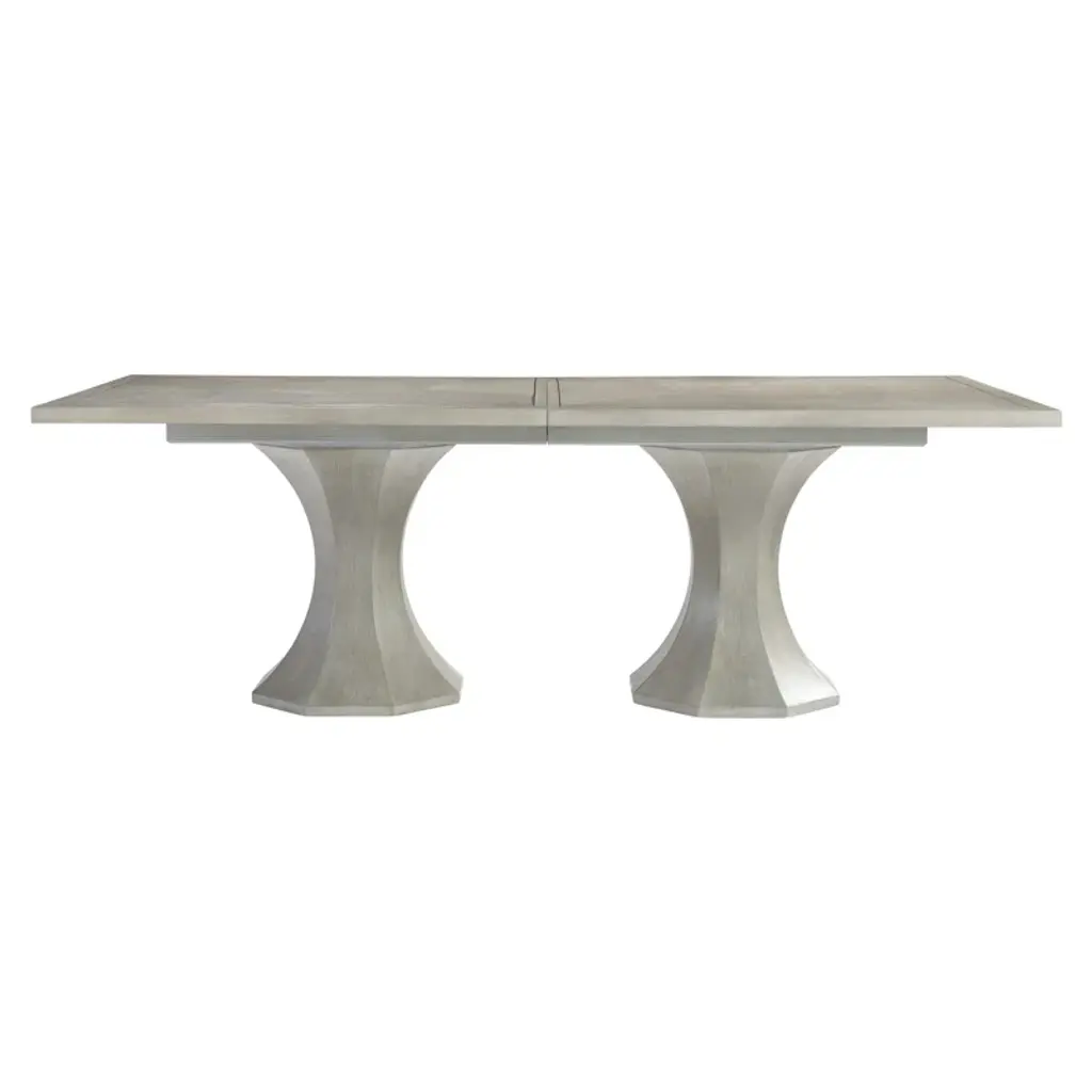 An understated, quiet beauty is showcased at the Cornelia dining table. Two octagonal cast resin pedestals have a wood grain look in the Nebbia finish. They support a beautiful rectangular top featuring a parquetry top outlined with a brushed stainless steel metal inlay.