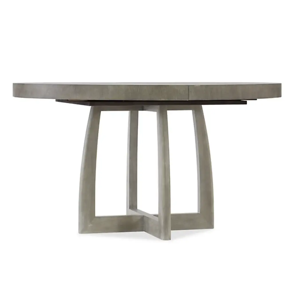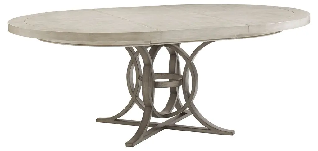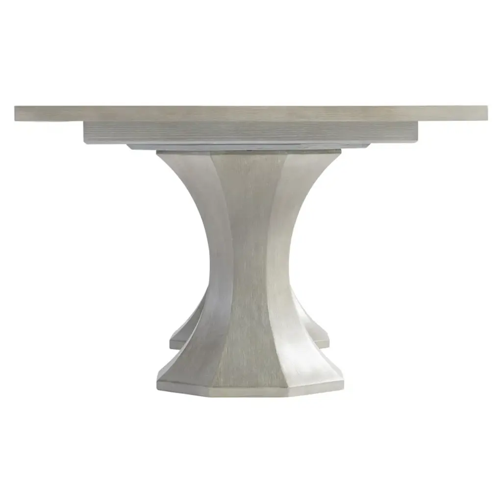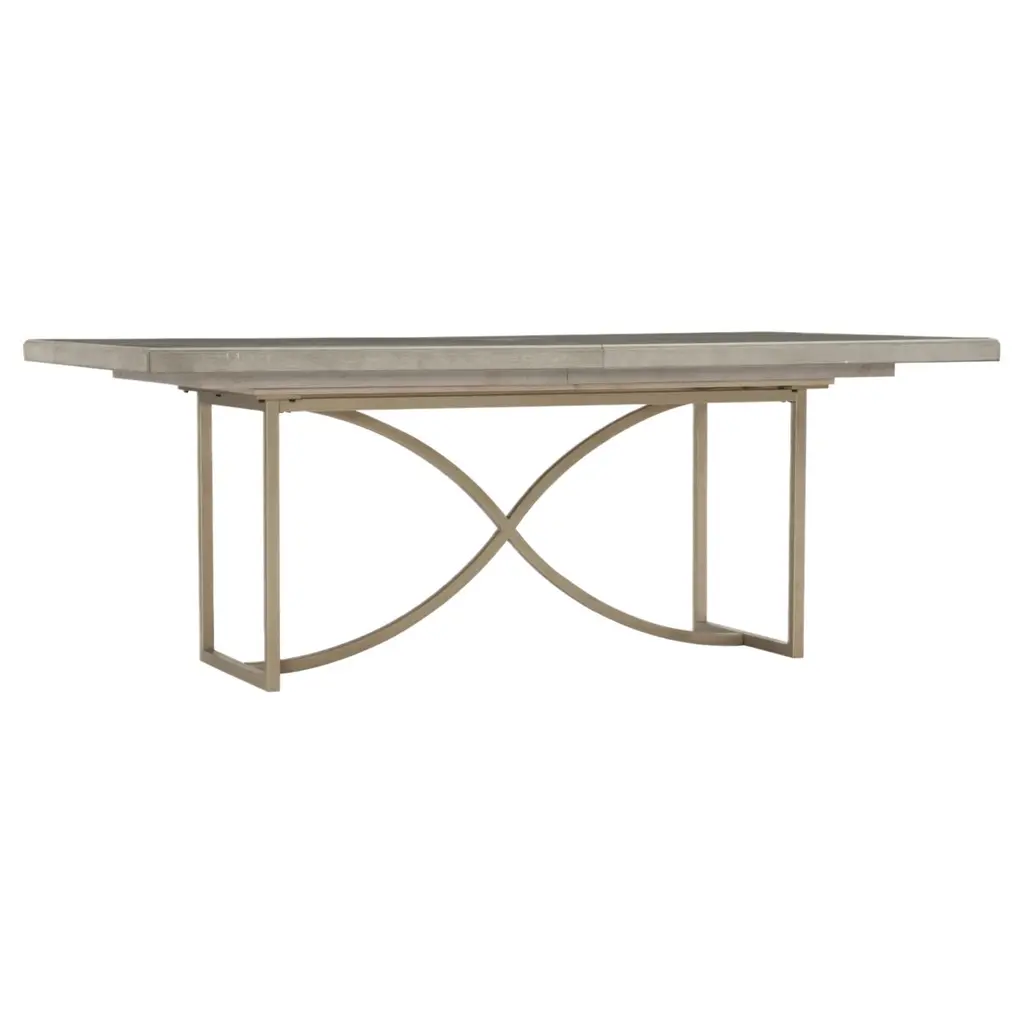 An understated, quiet beauty is showcased at the Cornelia dining table. Two octagonal cast resin pedestals have a wood grain look in the Nebbia finish. They support a beautiful rectangular top featuring a parquetry top outlined with a brushed stainless steel metal inlay.