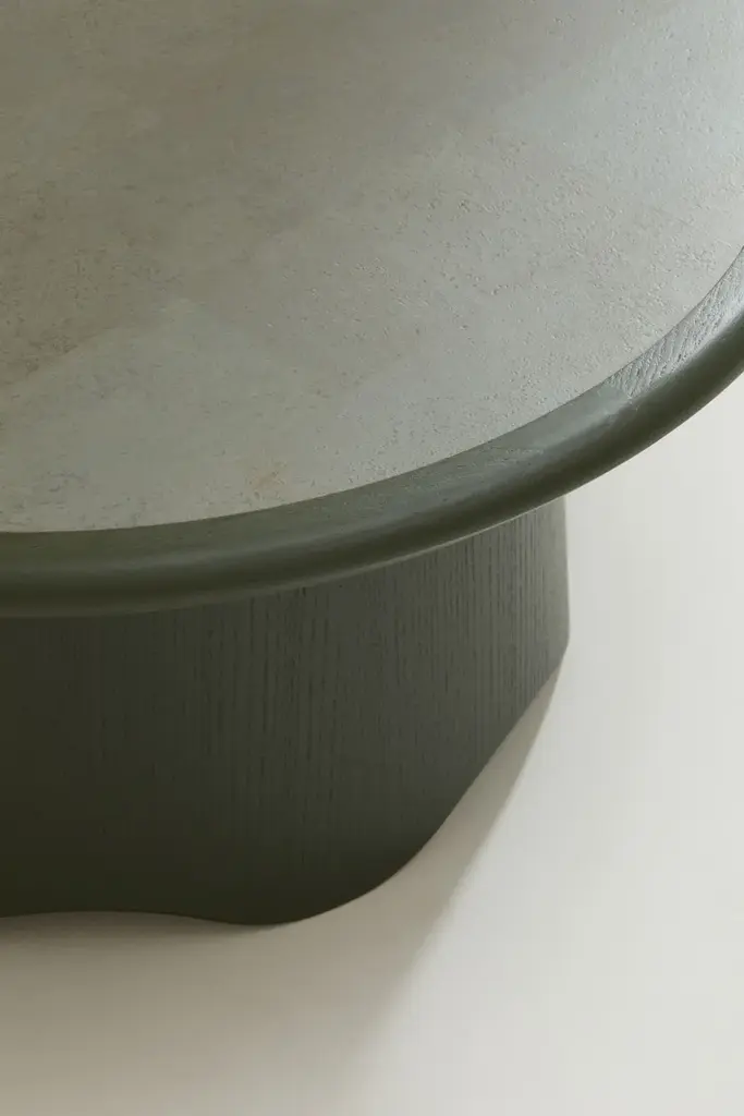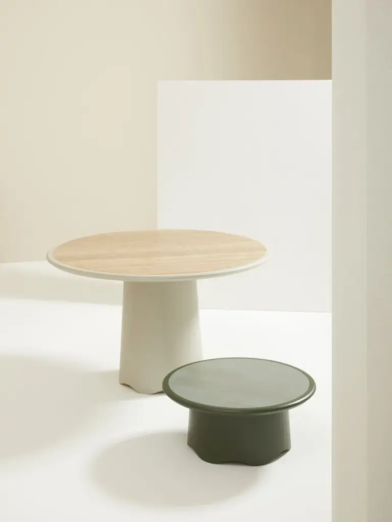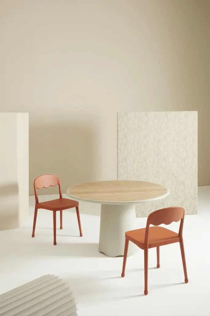 Corolla 282 is a round dining table with a solid ash wood frame and a top available in ash or Travertine stone.Corolla is a collection of seating and tables with soft, harmonious shapes designed by Cristina Celestino.In the armchairs, the rounded volumes are lightened by the crafted wooden base, a signature detail of Billiani.The wavy lines draw inspiration from the fashion world, whose allure is also reflected in the quality of the upholstery—best expressed through the combination of different colors and textures between the frame and cushions.Available in three sizes, the tables combine a conical base featuring characteristic undulations with a round top in various finishes, set within an outer frame.