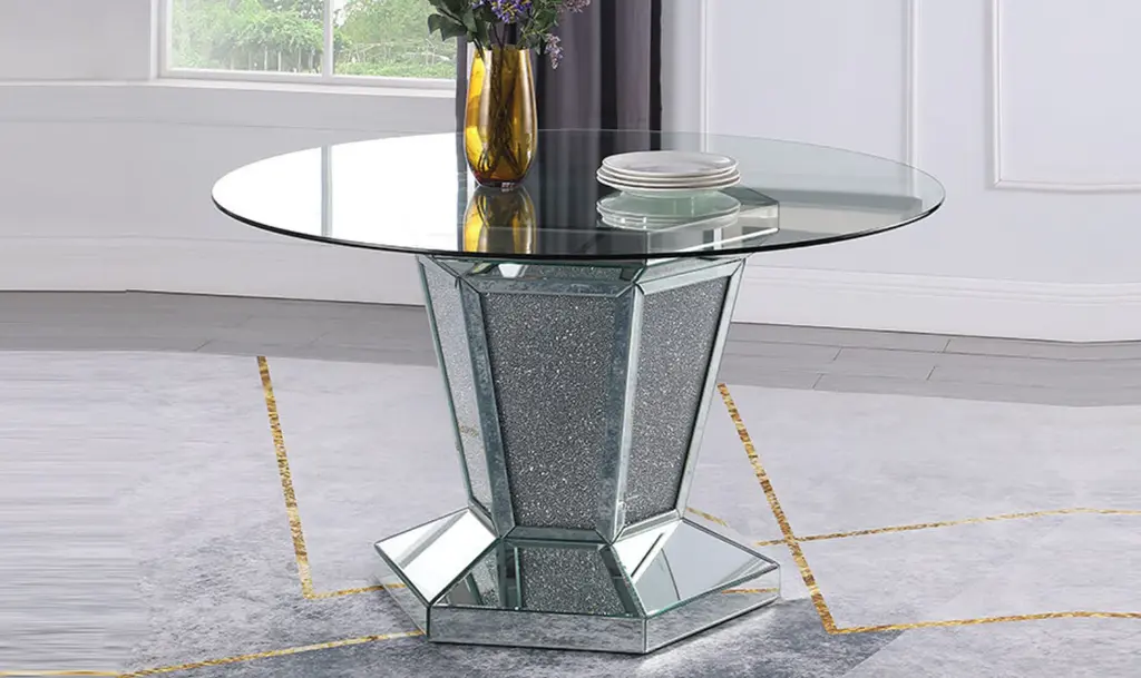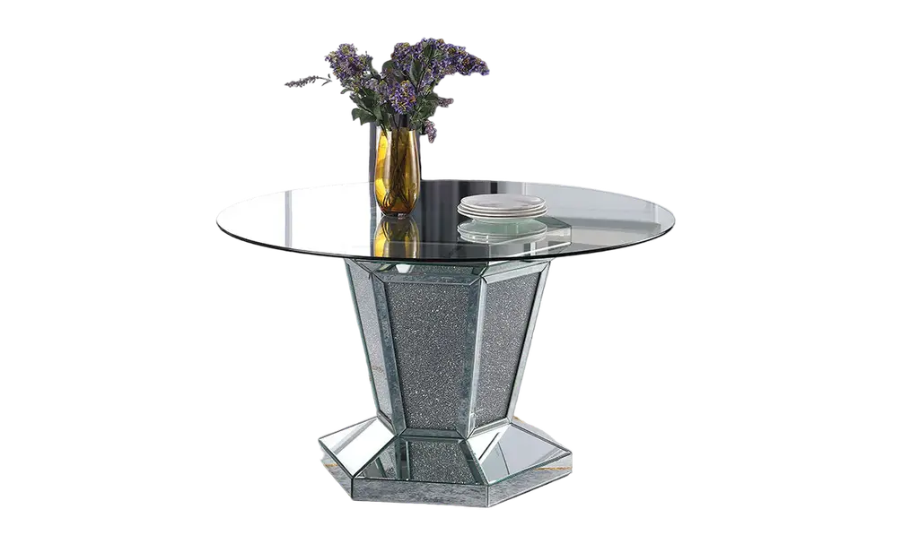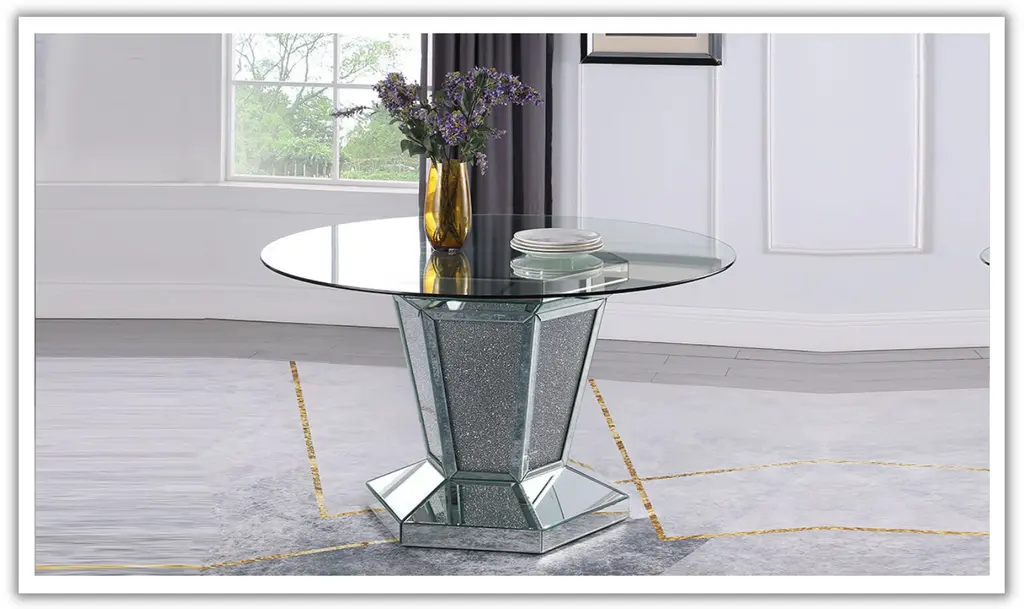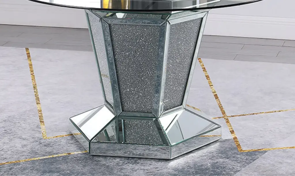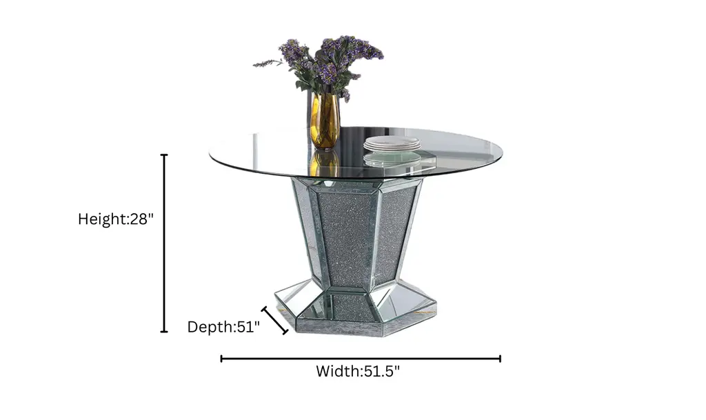 The Diva Modern Dining Table combines sleek design with a bold aesthetic, perfect for contemporary dining spaces. Its angular base, featuring a unique X-shaped pedestal, is adorned with mirror accents and faux diamond inlays, adding a touch of elegance and sparkle. The sturdy geometric base provides both style and support, while the tempered glass top offers a durable and sophisticated surface for everyday use. Crafted from silver-finished materials and glass, this table brings a modern twist to the classic pedestal design. The clear glass top enhances the open, airy feel, making it ideal for brightening up your dining room. Whether hosting a dinner party or enjoying casual meals, the Diva table adds a stylish statement to your home decor.