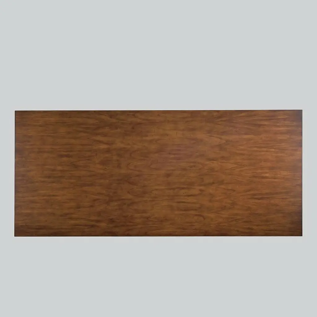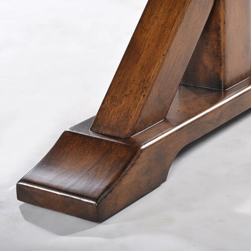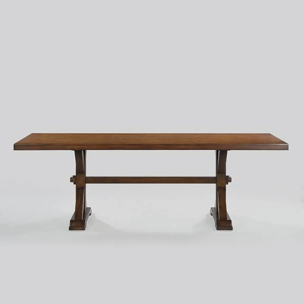 Rustic country trestle dining table with chunky “K” shaped base, smooth, thick top, slightly raised base and strong stretcher has a “rustic” warm brown walnut finish with subtle visual distressing and hand-rubbed finish.Dimensions: 92" W x 40" D x 30" H.