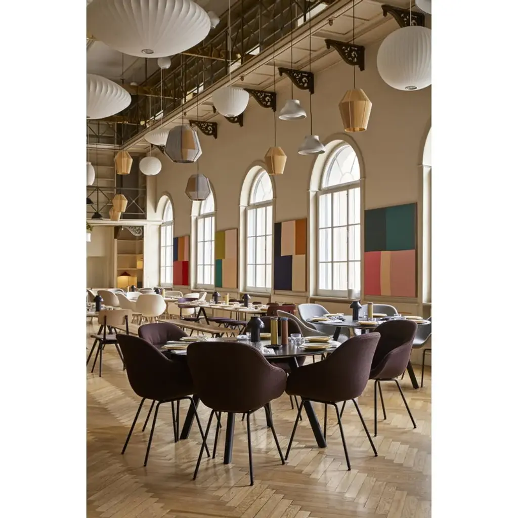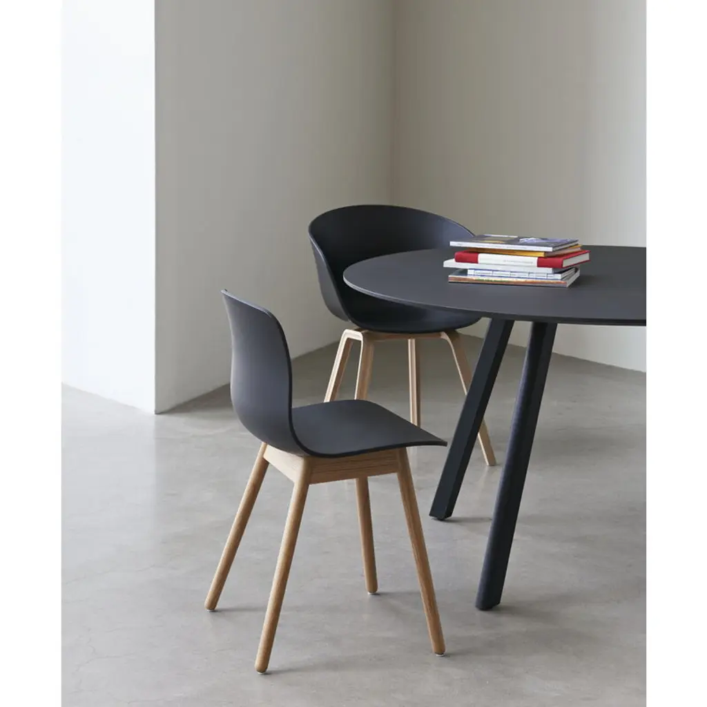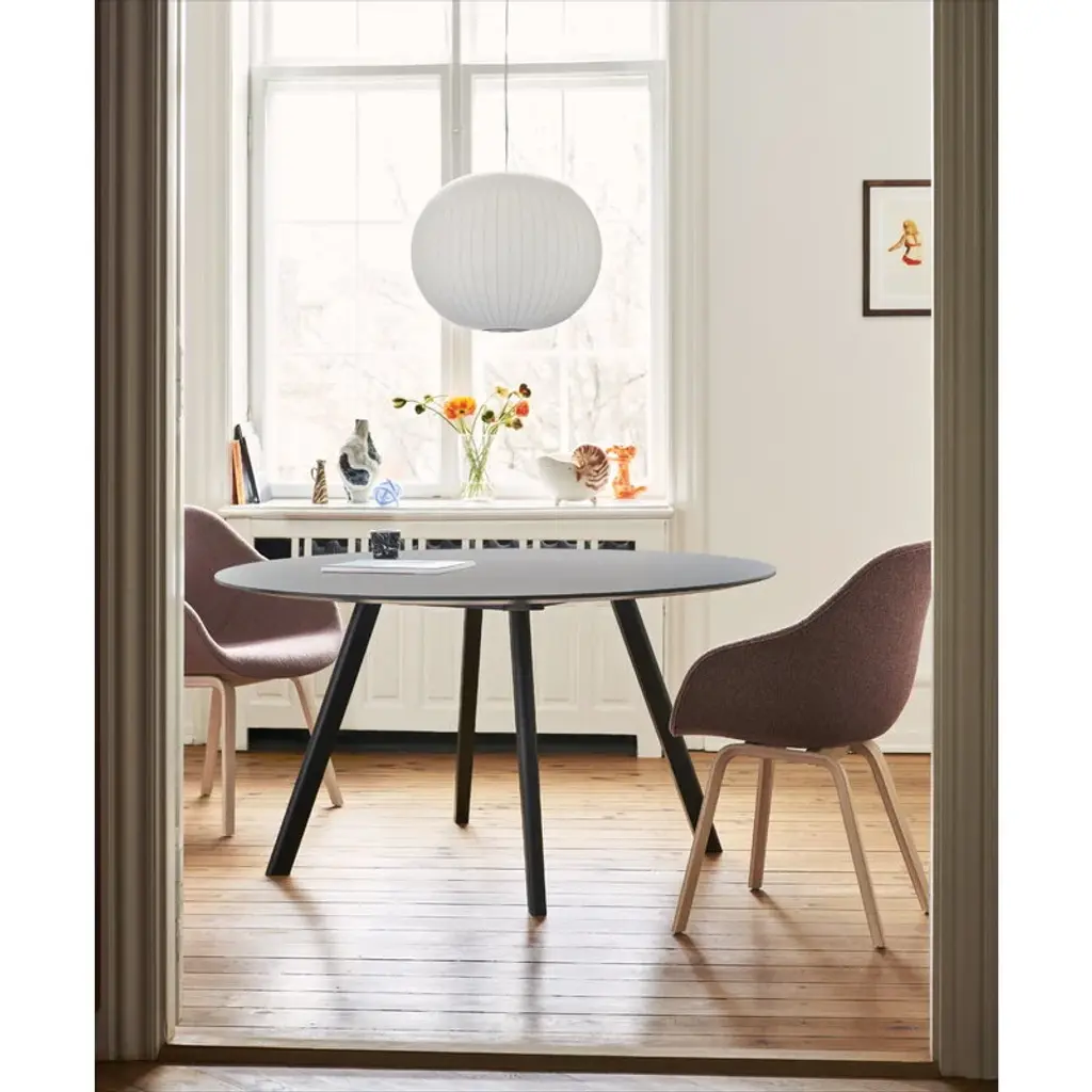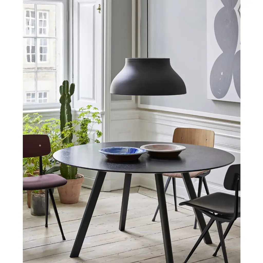 HAY's CPH25 table is part of the Copenhague furniture collection designed by Ronan and Erwan Bouroullec. HAY invited the Bouroullec brothers to design the furniture for the new buildings of the University of Copenhagen (KUA) – hence the collection's name! The Bouroullec brothers wanted to create furniture with greater originality and a more domestic expression than traditional educational furniture. The Copenhague collection fits all kinds of public spaces as well as private use: the sleek round table can be used as a dining table in the home as well as in restaurants. HAY has updated the much-loved CPH collection a couple of times. In 2021, the original lacquer was replaced with a new, more environmentally friendly water-based alternative. In 2024, the material of the tabletop was renewed: the tables are exactly the same shape as before, but instead of plywood, the edge is now made of durable MDF.