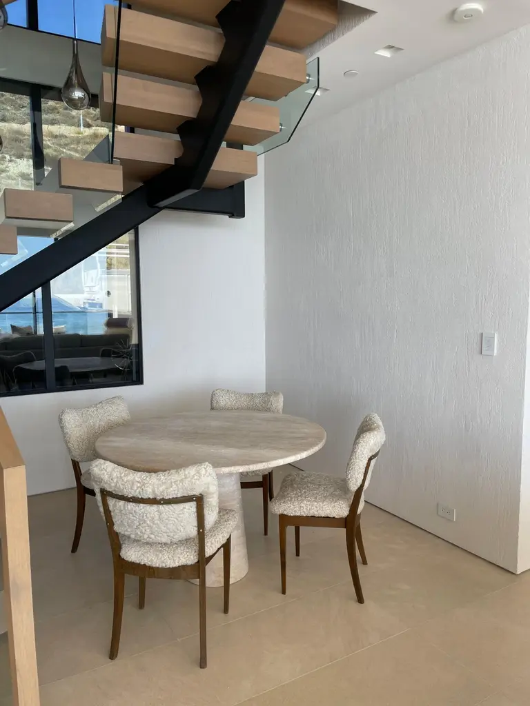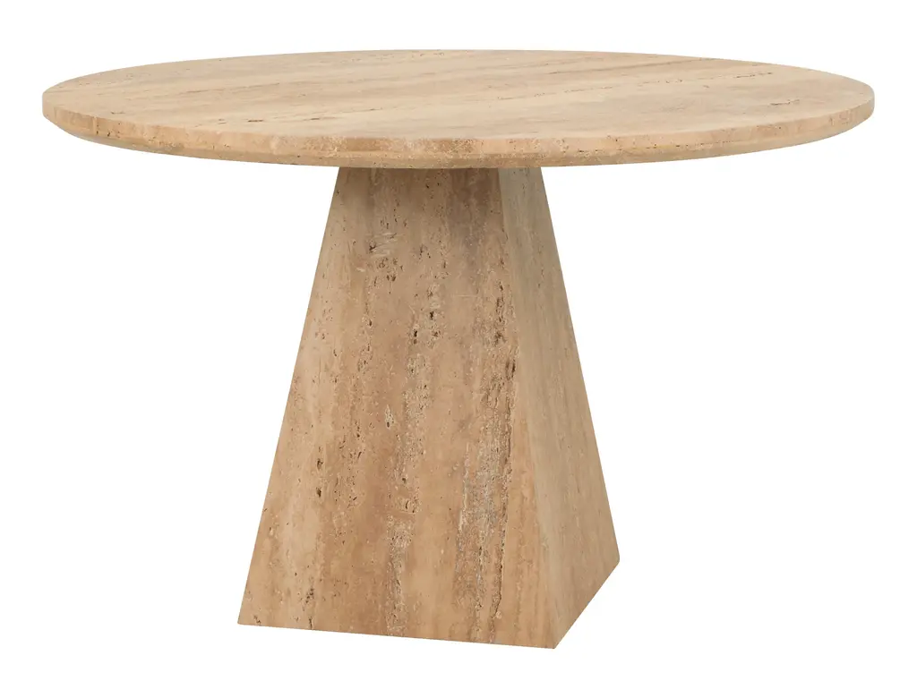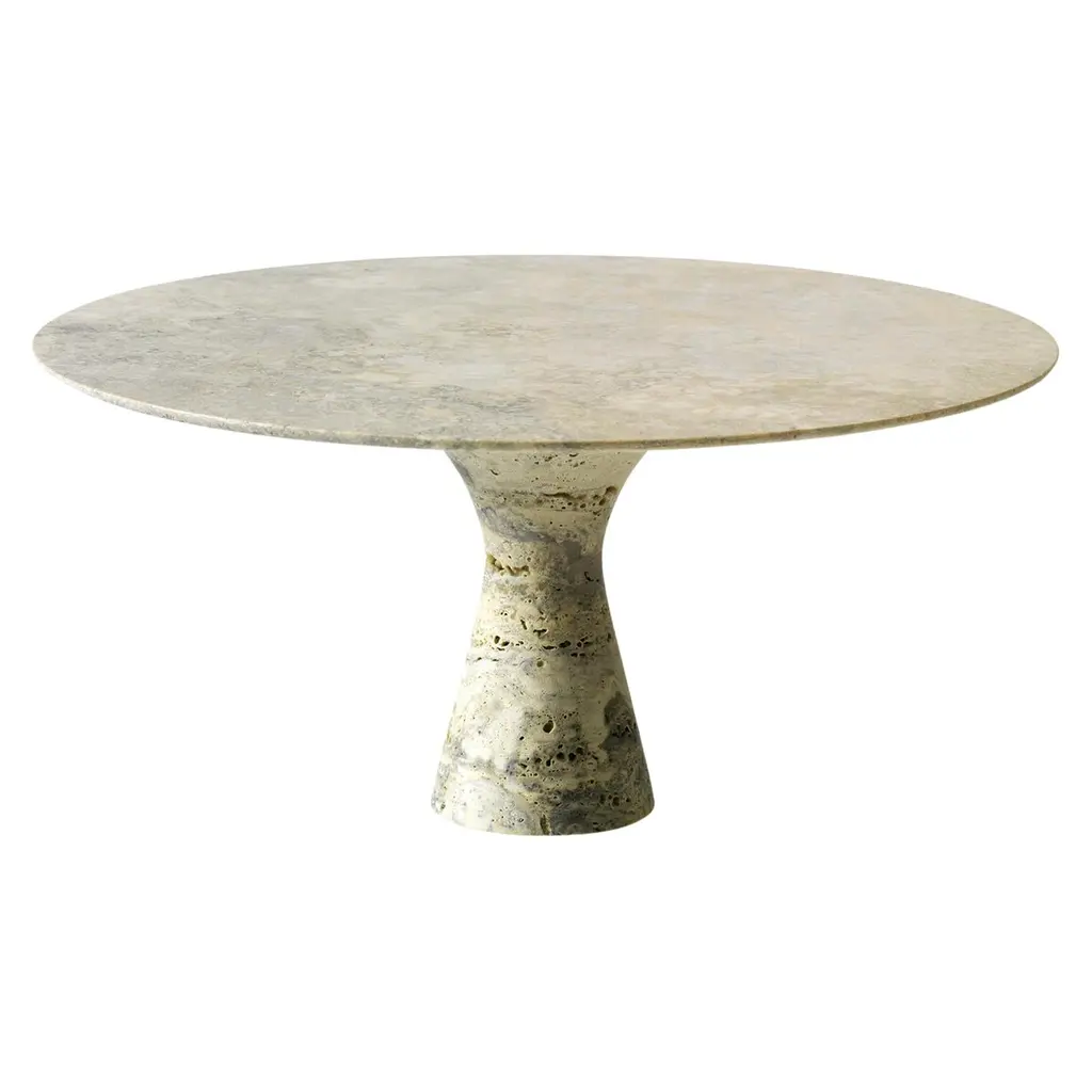 This minimalist table is made from solid tumbled travertine, featuring a circular table top that balances perfectly and securely with its own weight. Drawing inspiration from the vintage pieces of Angelo Mangiarotti, the column leg gives this table a sculptural feel.The top and legs are packed separately for ease of transport and installation.Available made-to-order in custom sizes (diameter: 110/120/130/140/150cm) and in tumbled or filled travertine. Shipping Continental Europe - fixed fee €300 (delivered to ground floor - front door).