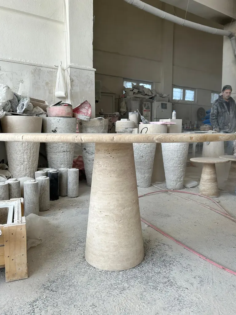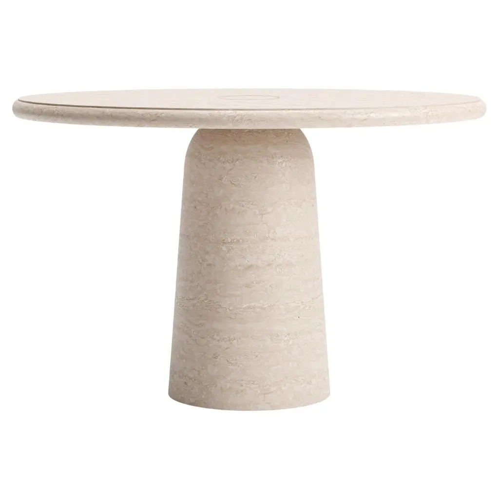 Cream Travertine Round Dining Table, In The Style Of 1970 Angelo Mangiarotti