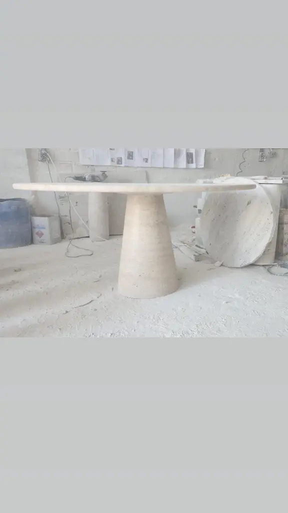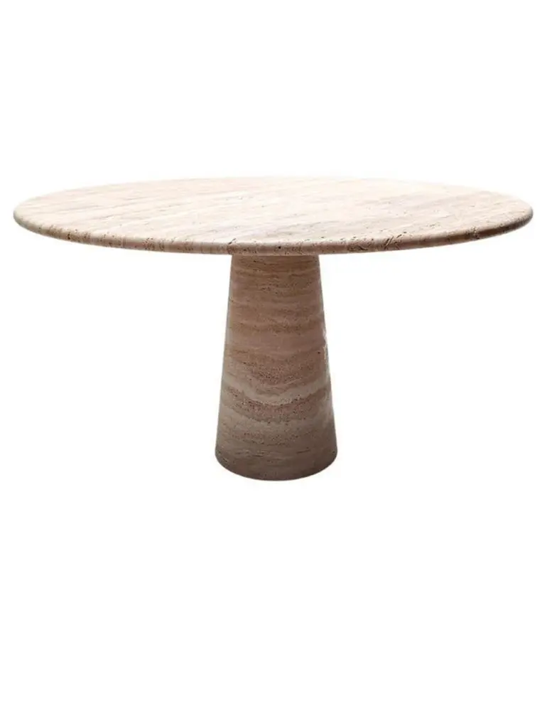 This minimalist table is made from solid tumbled travertine, featuring a circular table top that balances perfectly and securely with its own weight. Drawing inspiration from the vintage pieces of Angelo Mangiarotti, the column leg gives this table a sculptural feel.Not all travertine is created equal - we searched high and low for the perfect blocks to create this collection.Dimensions Pictured Table: H 76 cm x Ø 152 cm.The top and legs are packed separately for ease of transport and installation. Also available made-to-order in custom sizes in honed or filled travertine. The lead time for made-to-order is 4-5 weeks.The collection came to life after designer/founder of MY HABITAT DESIGN found that sourcing the perfect vintage pieces for her clients and projects was becoming increasingly tricky. Getting it ‘just right’ often felt like a miracle, so she set out to create a collection of tables that still upheld the solid forms and sculptural shapes she was always hunting for. MY HABITAT works closely with stone artisans to create a collection of stone tables combining traditional techniques and rare ways of working with solid stone.