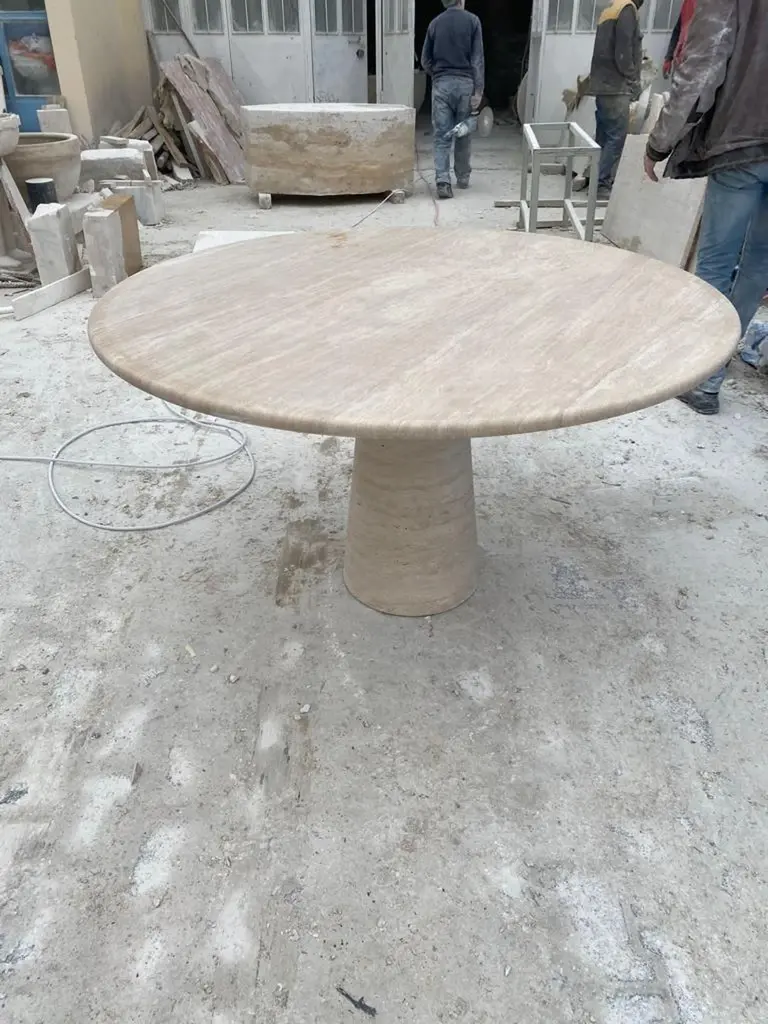 Cream Travertine Round Dining Table, In The Style Of 1970 Angelo Mangiarotti