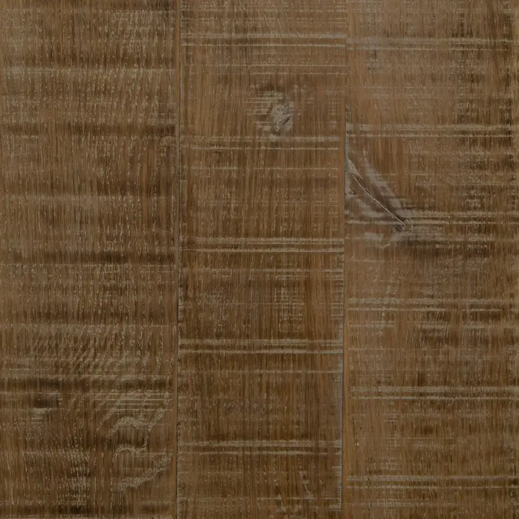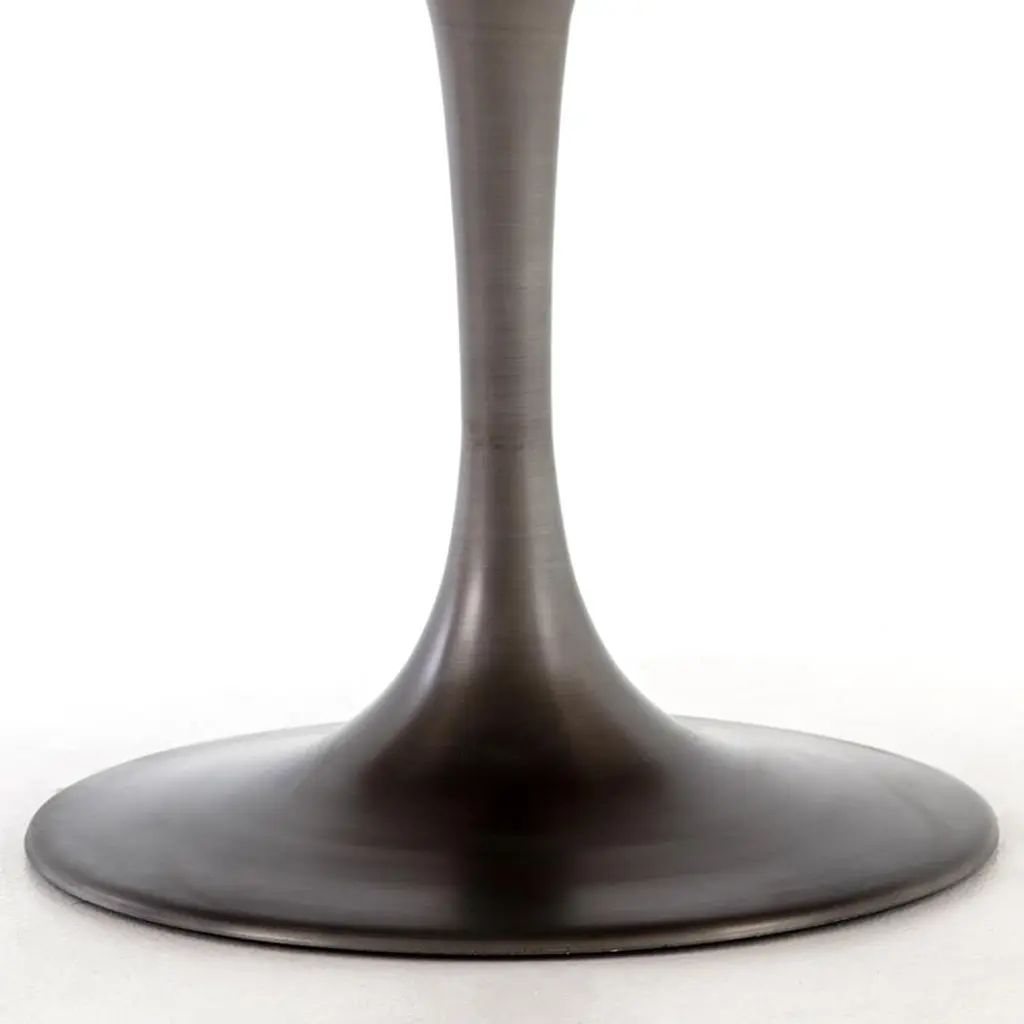 The Cressley dining table features a classic tulip shape reimagined in a clever mix of materials. Its grey pedestal iron base supports a round tabletop made from reclaimed oak in a burnt brown finish. Polished brass stainless steel with exposed nailheads accents the edge of the tabletop, lending a touch of industrial style to the silhouette.