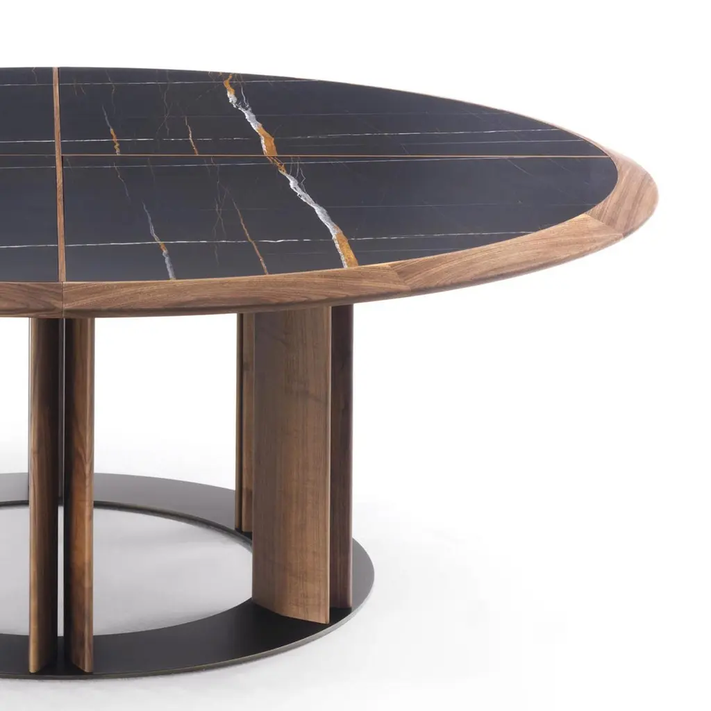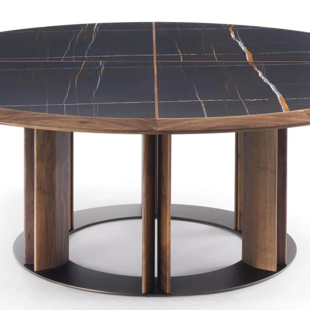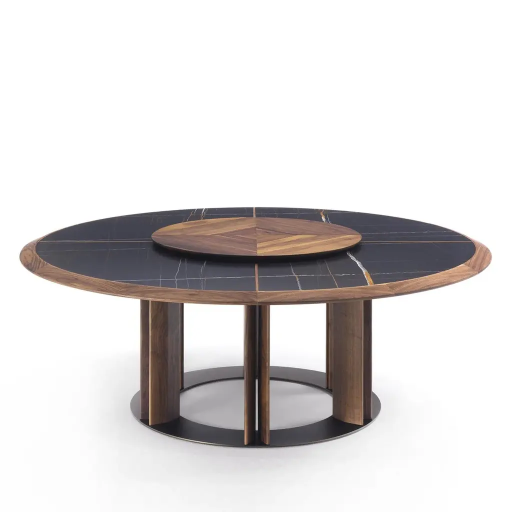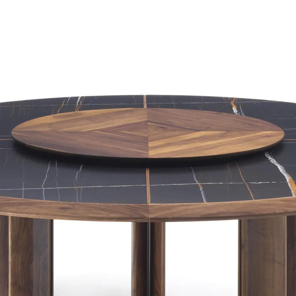 Round dining table Crosby Sahara black with solid walnut wood base structure and top frame, with Sahara black marble top divided in four parts. With swivel walnut wood round tray.Available in:Diameter 160cm x Height 74cm, price: 29500,00€.Diameter 200cm x Height 74cm, price: 42500,00€.Diameter 250cm x Height 74cm, price: 58500,00€.Also available with solid walnut wood top orbrown emperador dark top or grey marble topor white calacatta gold marble top, on request.