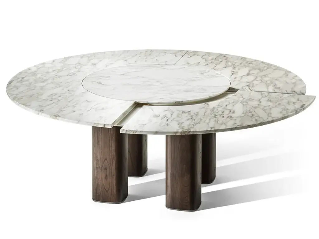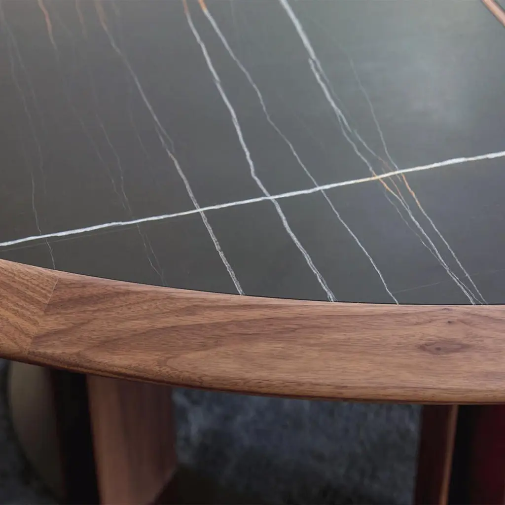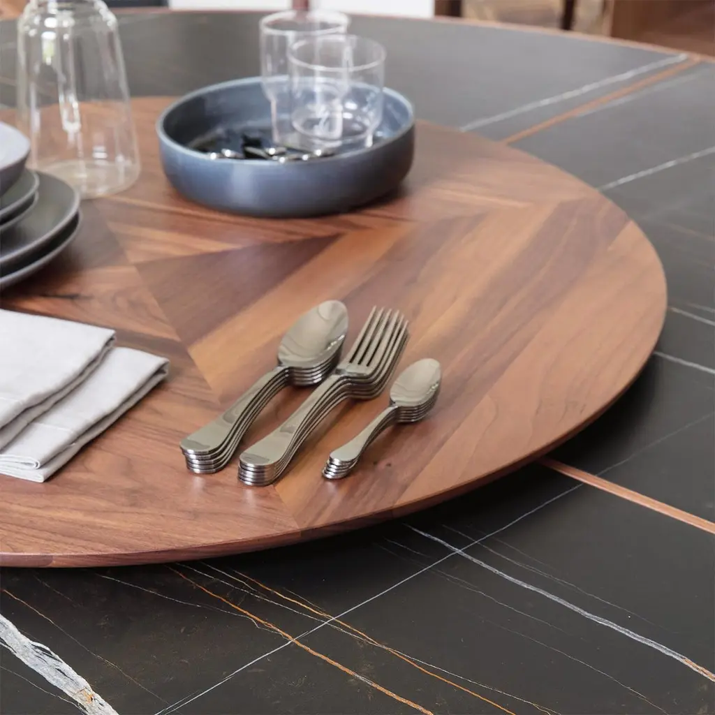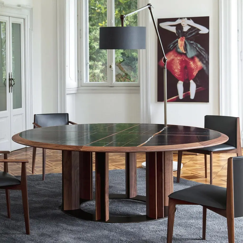 Round dining table Crosby Sahara black with solid walnut wood base structure and top frame, with Sahara black marble top divided in four parts. With swivel walnut wood round tray.Available in:Diameter 160cm x Height 74cm, price: 29500,00€.Diameter 200cm x Height 74cm, price: 42500,00€.Diameter 250cm x Height 74cm, price: 58500,00€.Also available with solid walnut wood top orbrown emperador dark top or grey marble topor white calacatta gold marble top, on request.