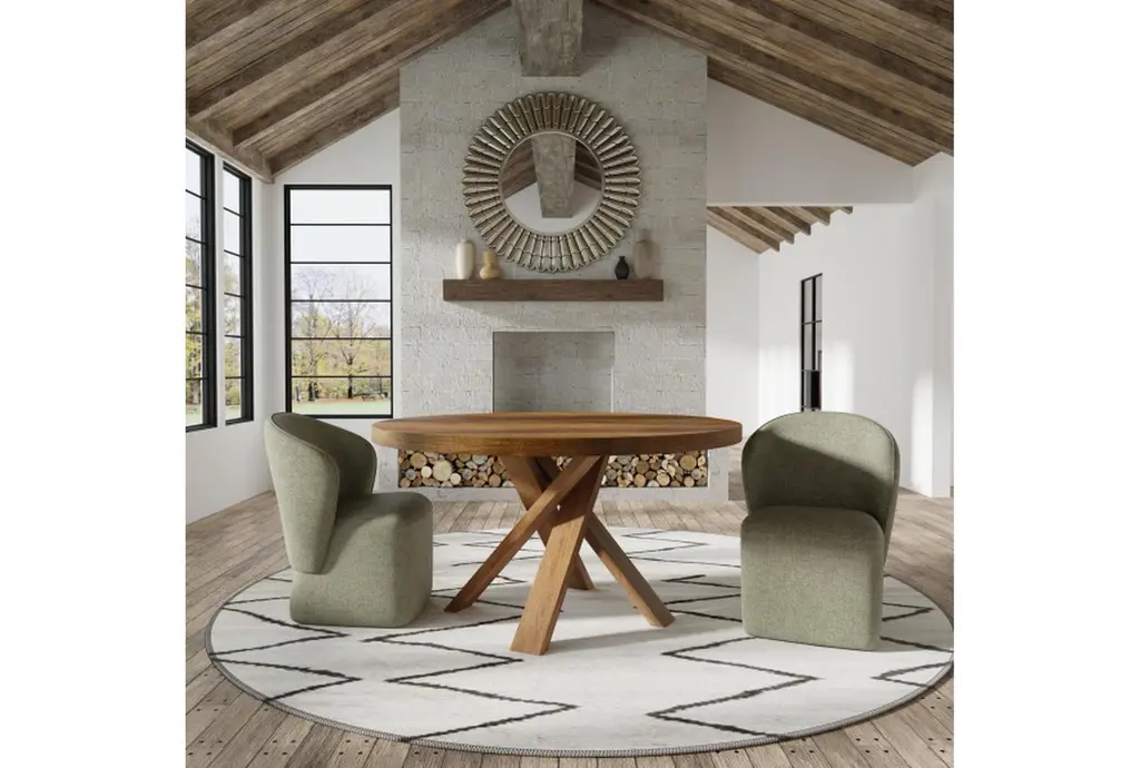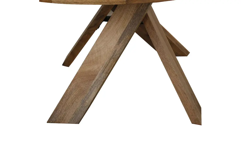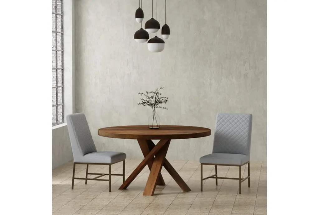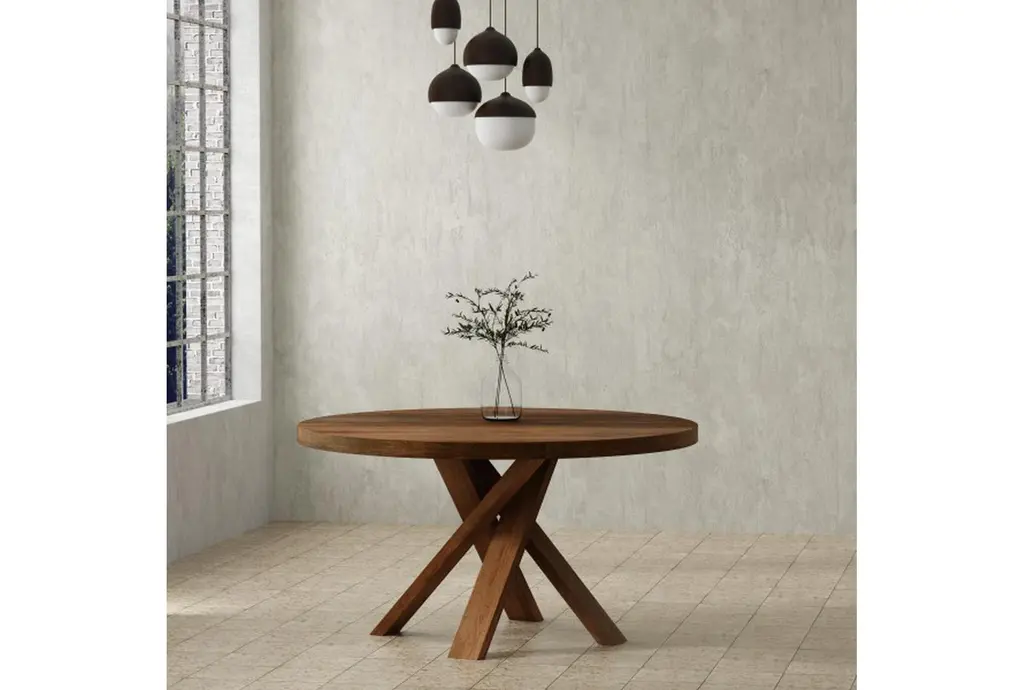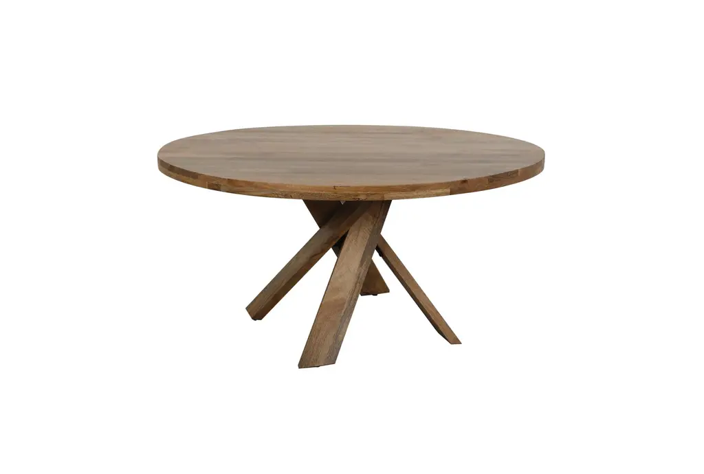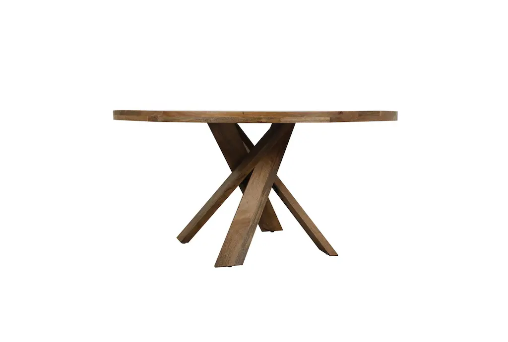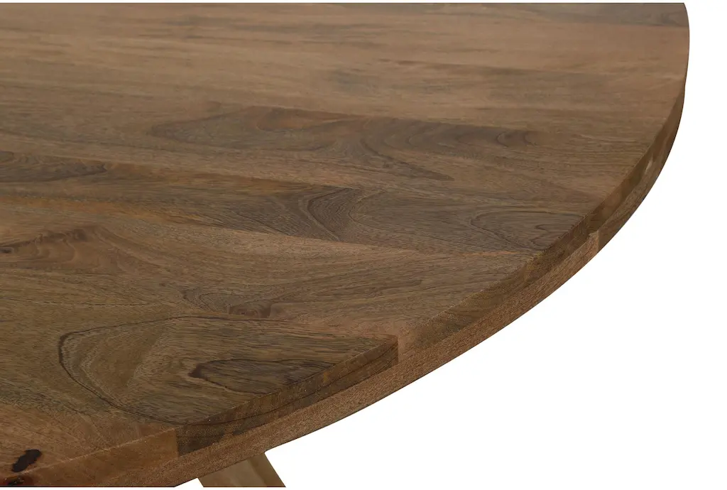 The Cross 60" Round Dining Table is a casual style, brown dining table made of 100% solid mango wood. Its curved design and amber color make it a unique addition to any dining room.