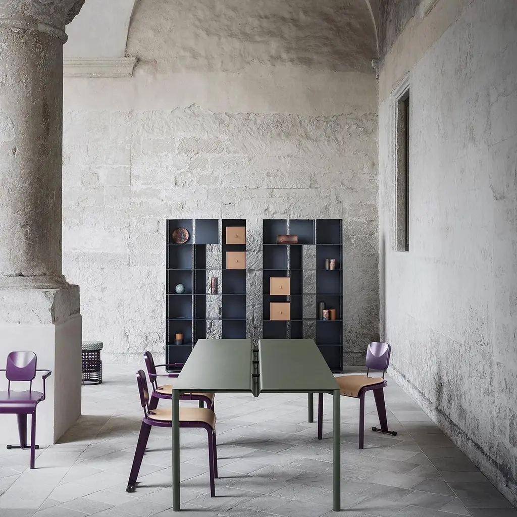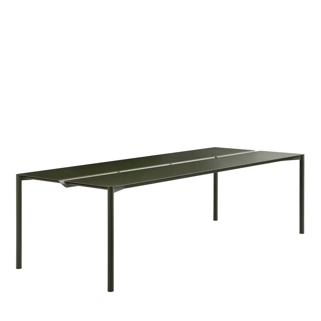 A simple and welcoming piece of functional decor, this dining table will enliven any occasion, whether held in an outdoor or indoor area. Entirely made of green-lacquered steel, its sleek silhouette is composed of slim but solid legs sustaining a rectangular top marked by a central fissure. This piece is customizable in a wide range of colors.