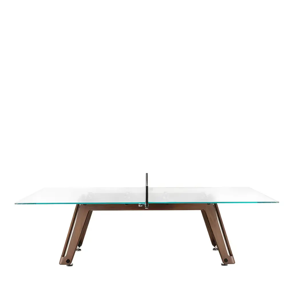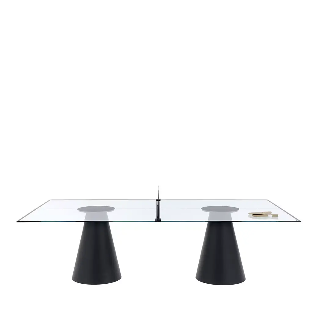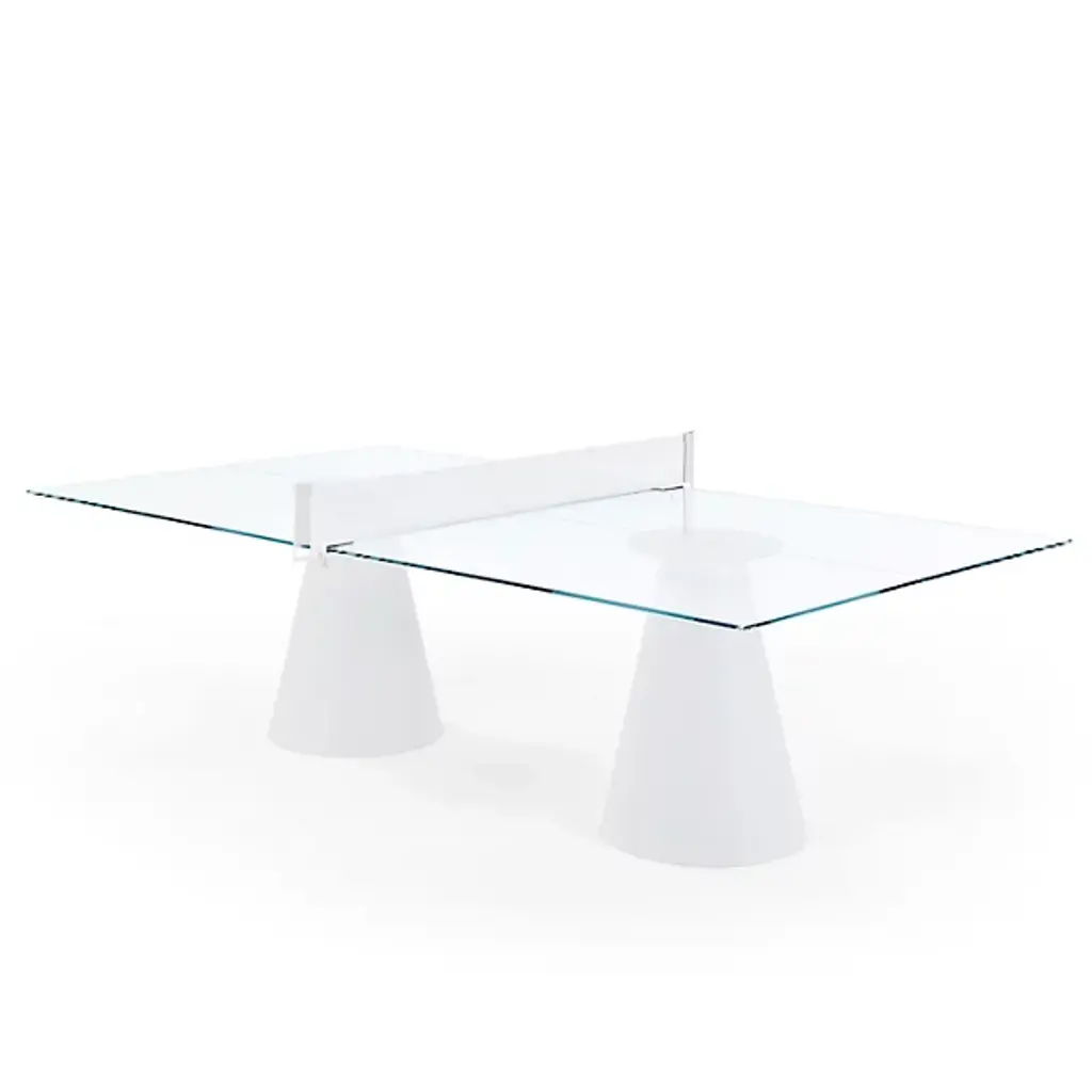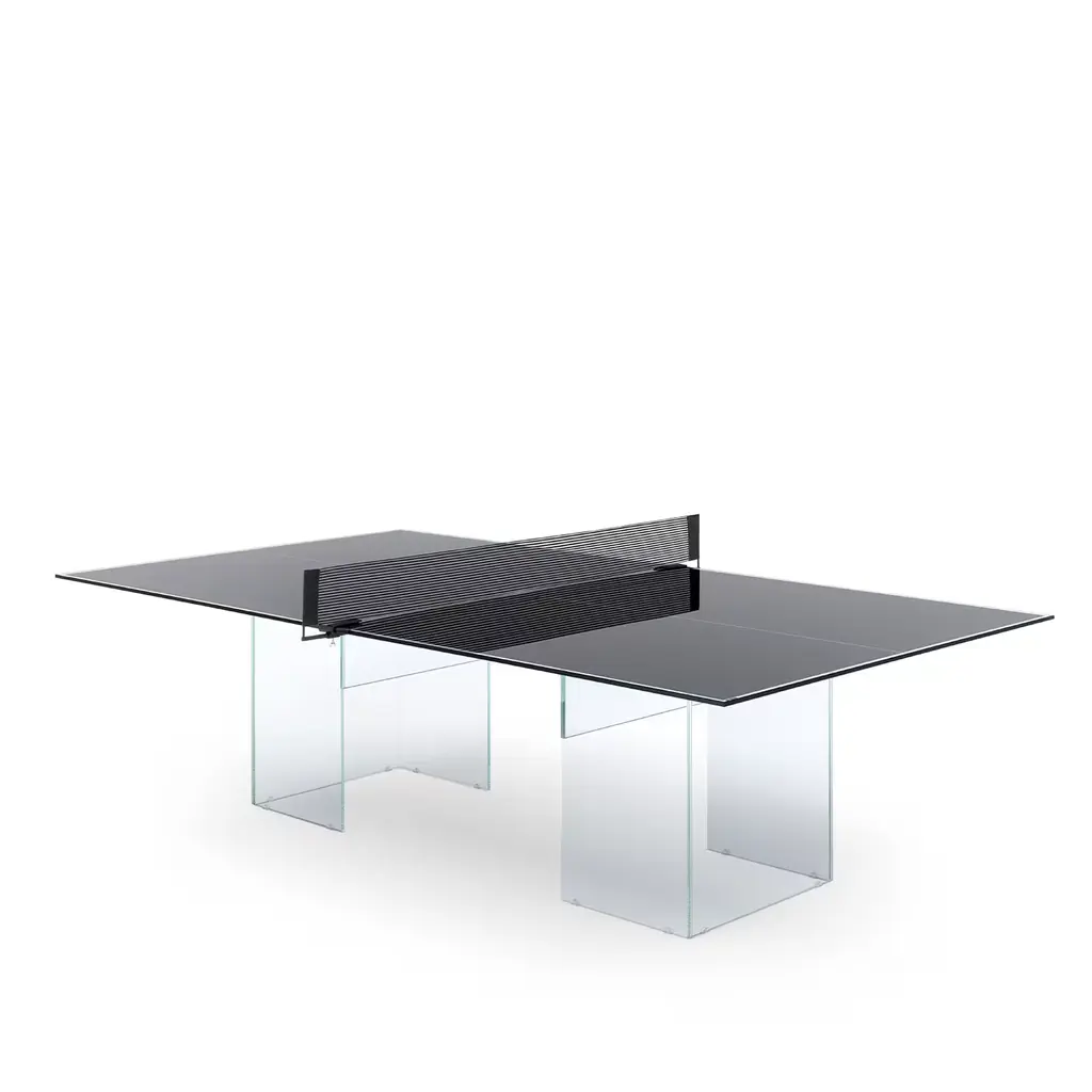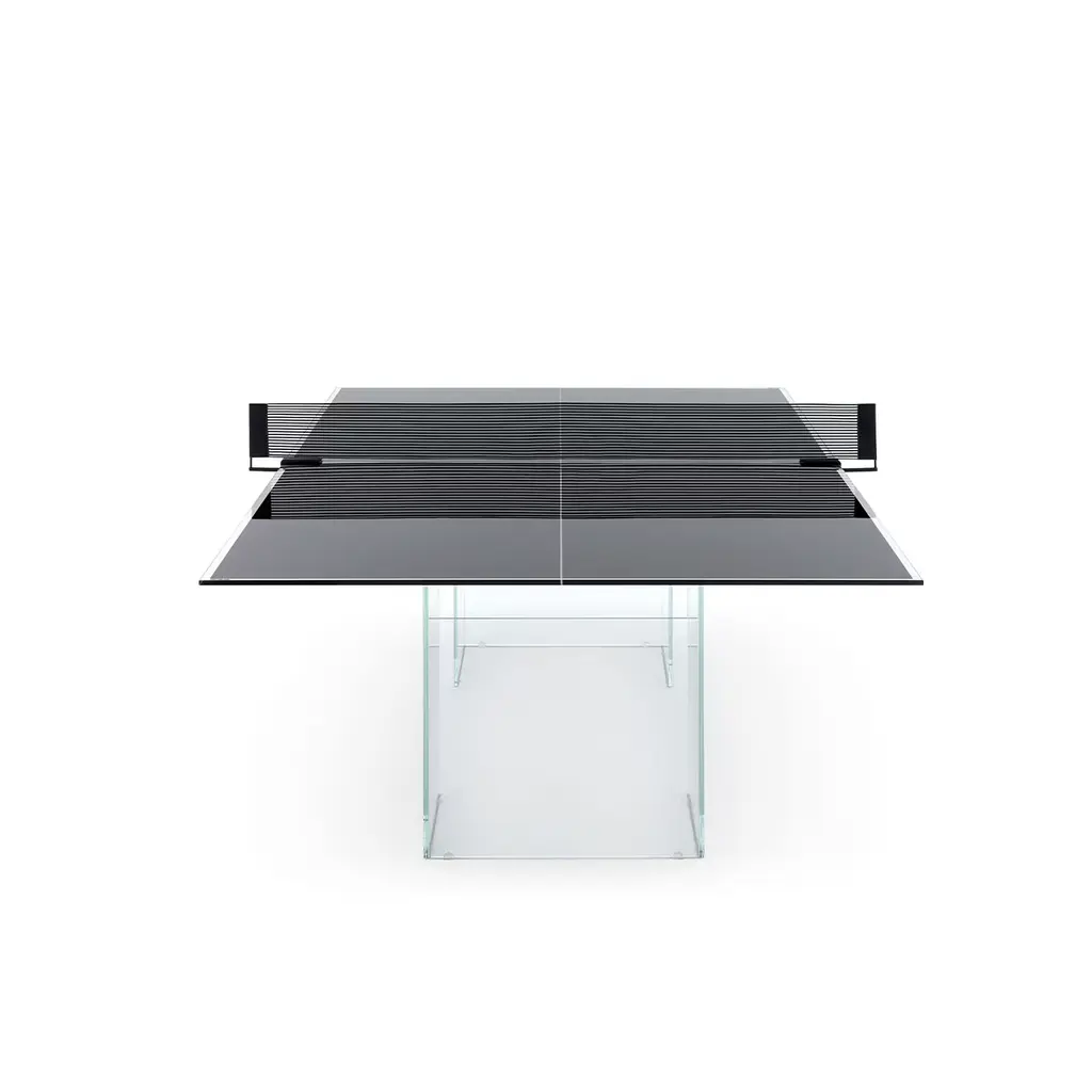 Crafted entirely from glass with a screen-printed top, the innovative Crystal table tennis table seamlessly transforms into an elegant dining table when the game net is removed. Ideal for modern homes, newly designed hotels, and upscale function rooms, it exudes sophistication and versatility. Accessories are included: 2 rackets and 6 balls.