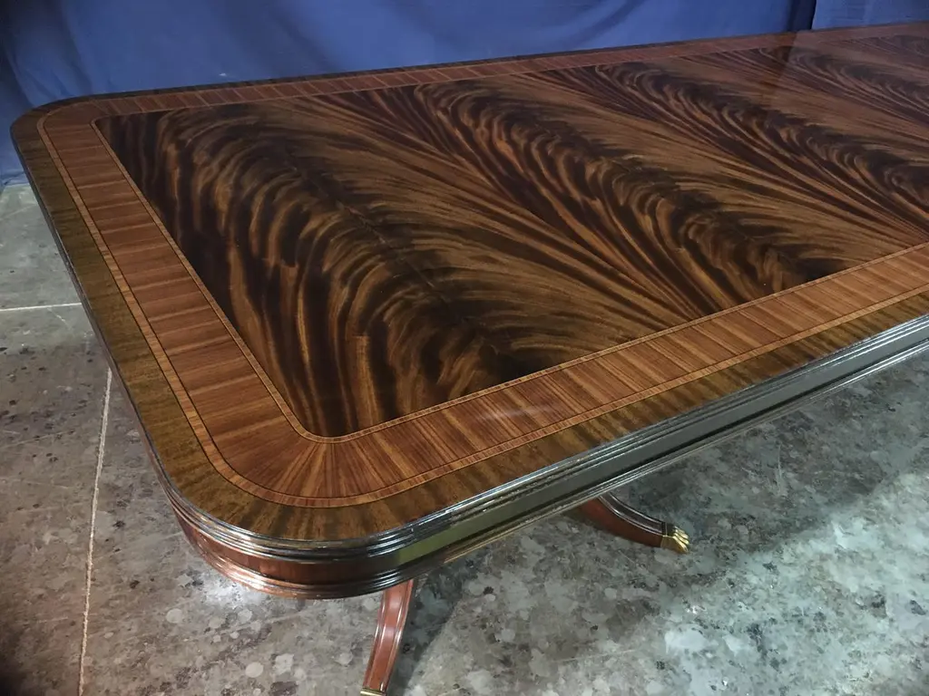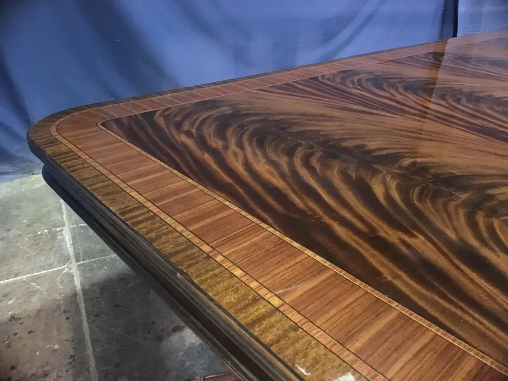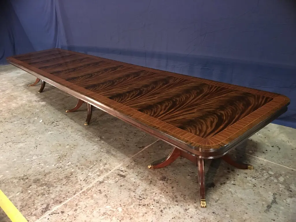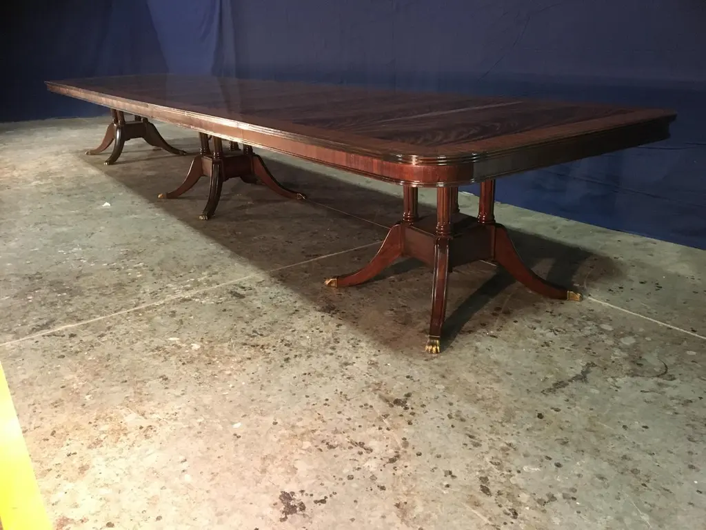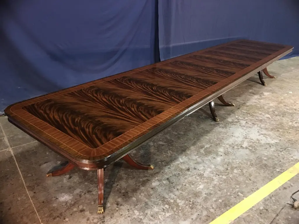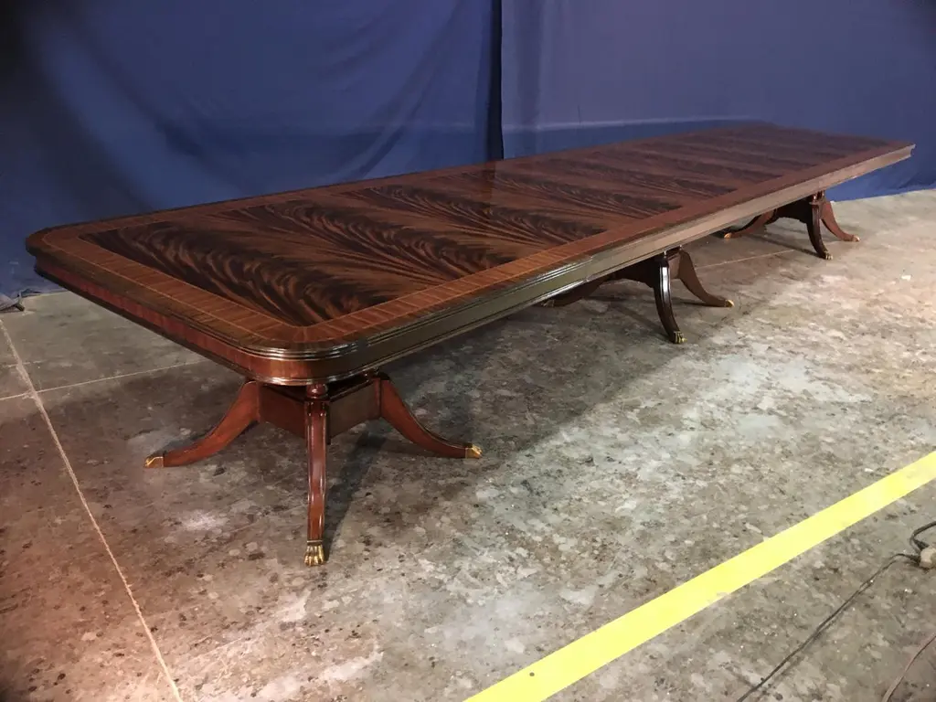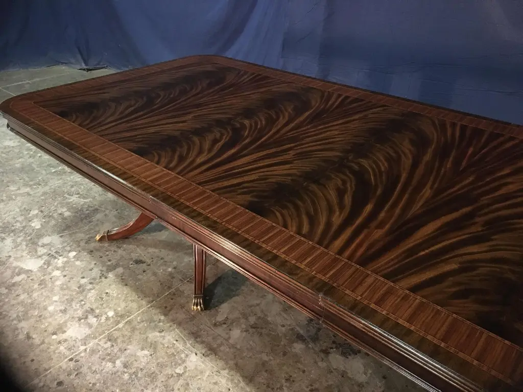 This is a made-to-order large traditional mahogany banquet/dining table made in the Leighton Hall shop. It features a field of slip-matched swirly crotch mahogany from West Africa and satinwood and Santos rosewood borders from South America. It has a hand rubbed and polished semigloss finish. The birdcage style pedestals have four columns with fluted legs which terminate with antique brass lions paw feet. Dimensions: 52 in. x 96 in. with three 48 in. Sections (total length with all three section inserted is 240 in.). This table can be purchased as shown, or it can be customized to your desired size and design. We can make a bench-made, one-of-a-kind table in our shop to your specifications. Lengths of 16, 20, 24, 28, 32 ft. or longer. Widths up to 66 in. Optional borders include: burled walnut, straight grain mahogany, movingue, and more. Optional brass feet: Lions paw or toe caps. Optional brass feet sheen: Polished, antiqued (as shown), and with casters. Other options available. Price and production time may vary depending upon options.