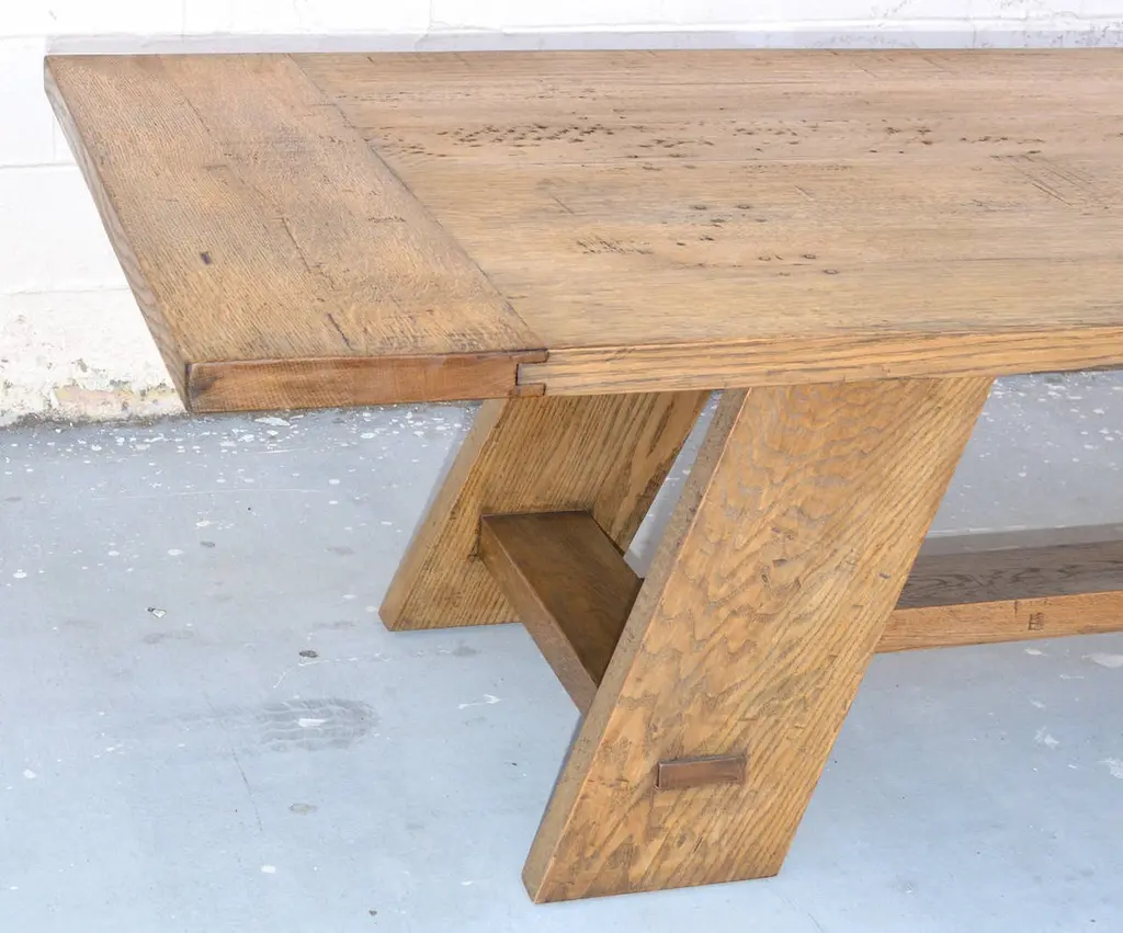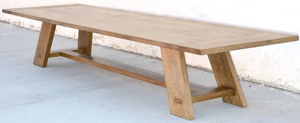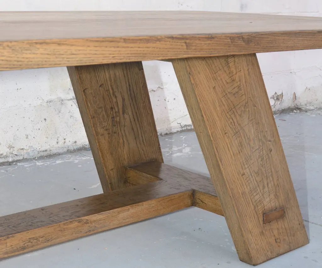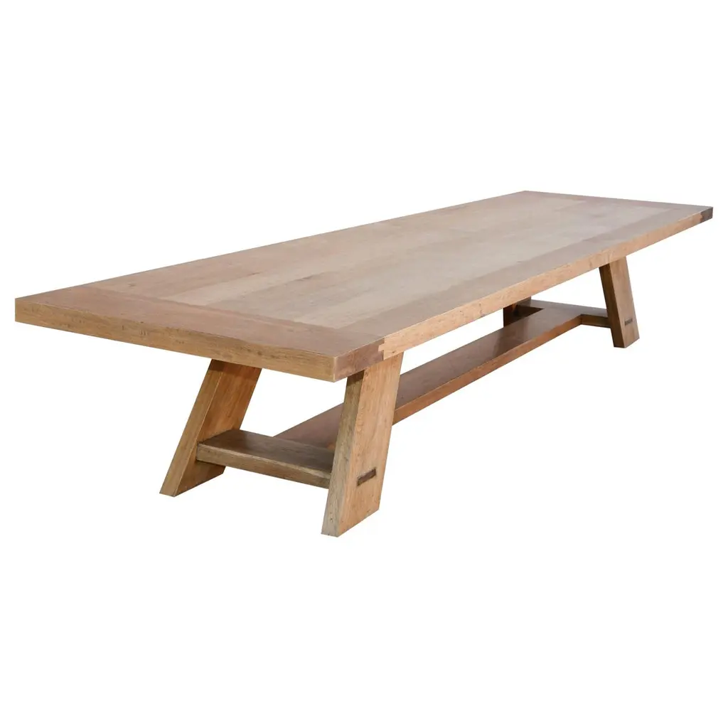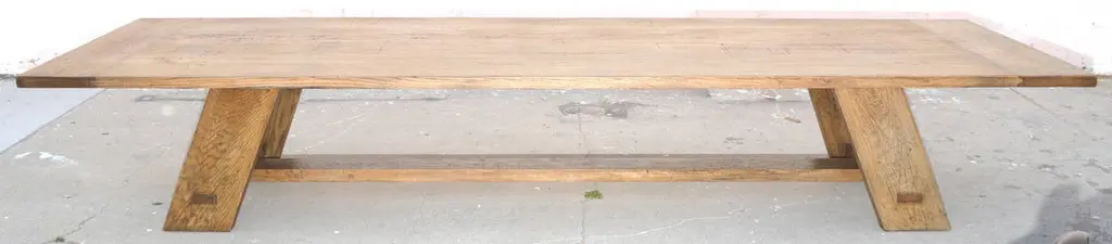 Solid, reclaimed white oak dining table with a modern flair. Will seat 14 as shown. Legs splay in both length and width.Because each table is bench-made in our own Los Angeles workshop you can influence all aspects of design, including size, wood species and finish. We use only traditional carpentry techniques, no nails or metal fasteners of any kind. Just mortise and tenon construction reinforced with hand-cut wooden dowels.If you require customized overhang dimensions please stipulate with order.