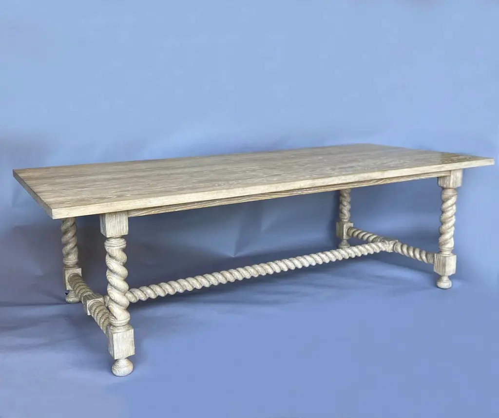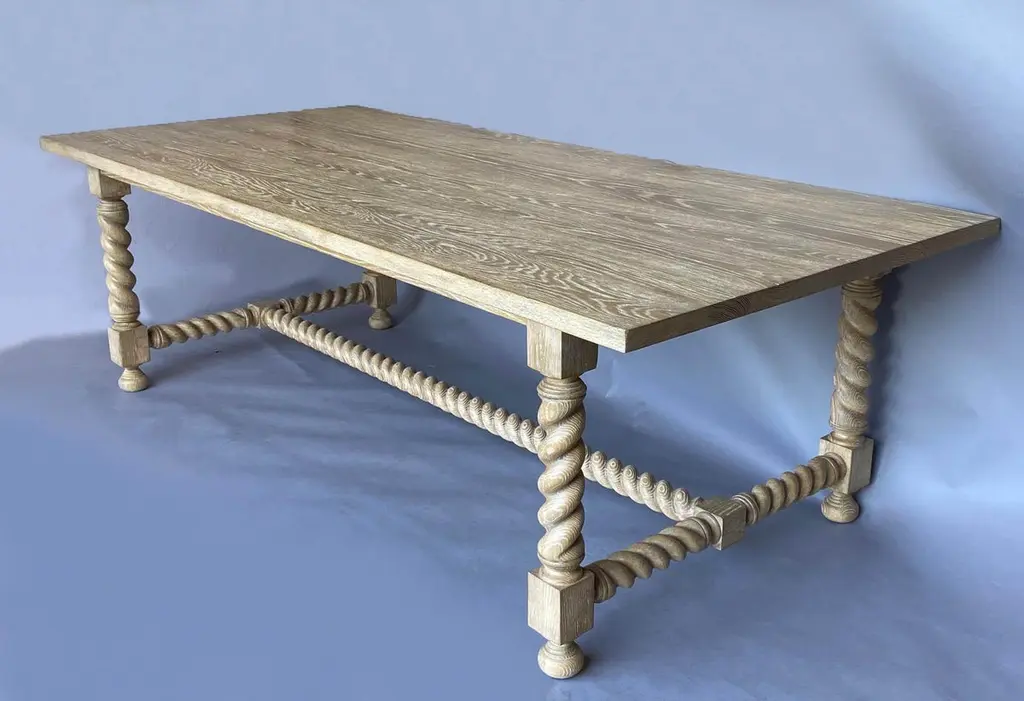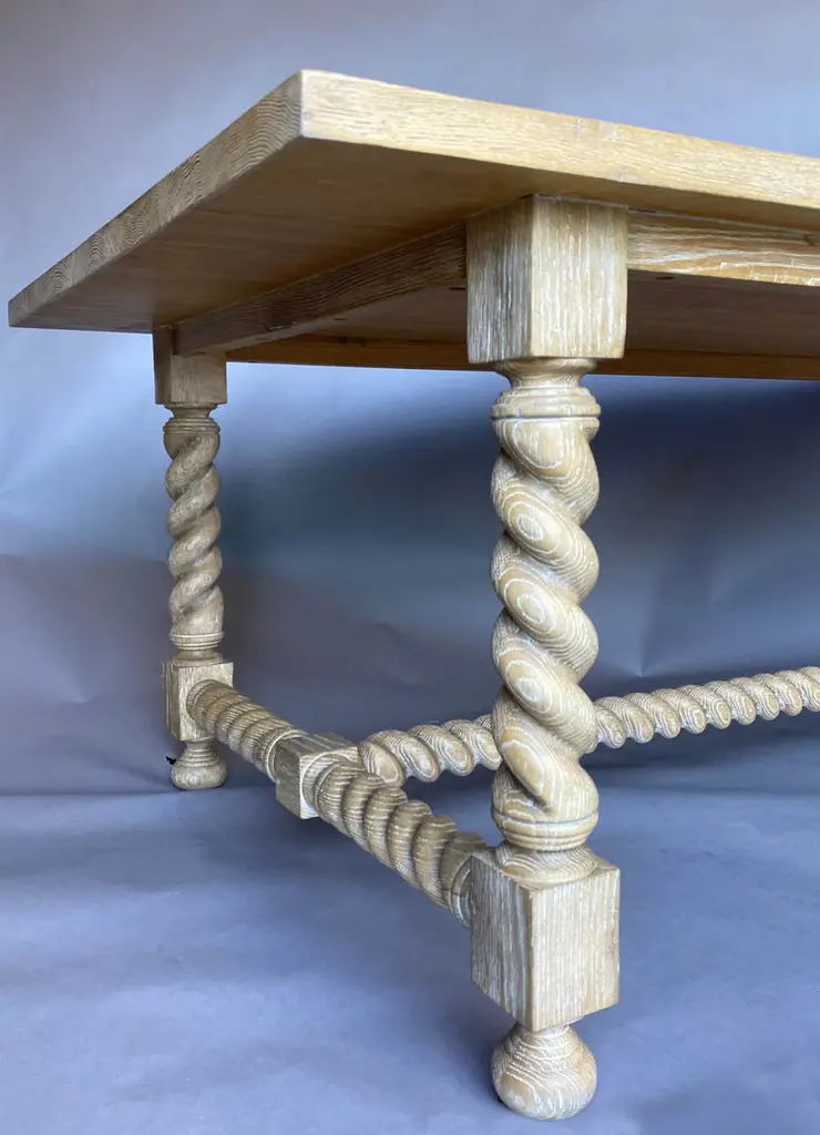 Dos Gallos custom barley twist table seen here in oak with custom finish. Can be made in any size in a variety of finishes. As shown 96 x 44 x 30. All our custom pieces are bench made and hand finished in Los Angeles by Dos Gallos Studio.PRICES ARE SUBJECT TO CHANGE DUE TO FLUCTUATING WOOD AND LABOR PRICES. PLEASE INQUIRE BEFORE PLACING AN ORDERCUSTOM PIECES ARE NON RETURNABLE