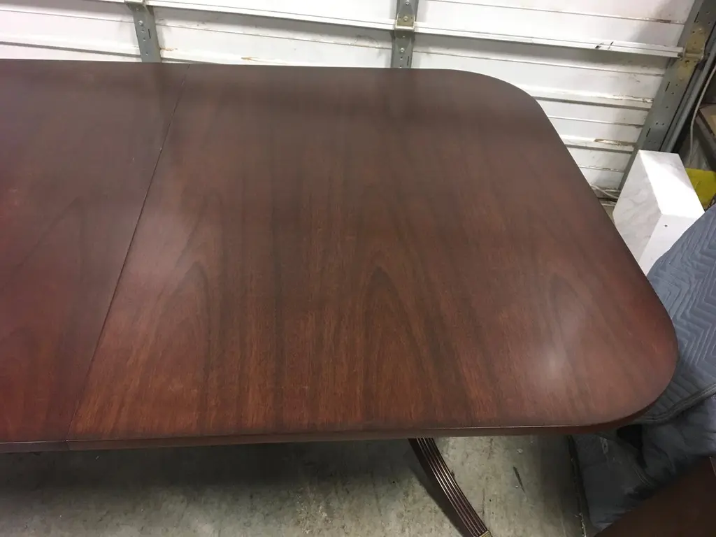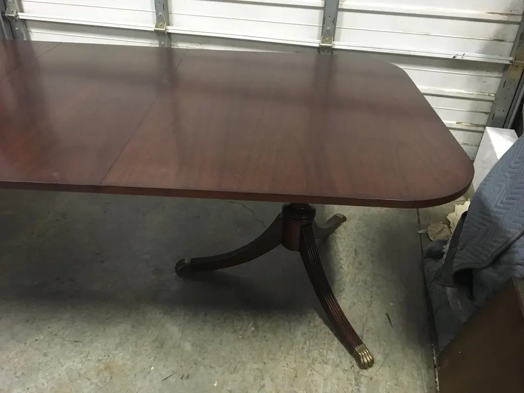 This is a made-to-order traditional cathedral mahogany dining table made in the Leighton Hall shop. It features a field of slip-matched cathedral mahogany. It has a matte finish. The Sheraton style pedestal has three fluted legs which terminate with antique brass lions paw feet. Dimensions: 46 in. x 72 in. with two 22 in. leaves (total length with leaves inserted is 116 in.) This table can be purchased as shown, or it can be customized to you desired size and design. We can make a bench-made, one-of-a-kind table in our shop to your specifications. Lengths of 12, 14, 16, 18, 20 ft. or longer. Widths up to 66 in. Price will vary depending upon options. Estimated production time is 45-75 days.