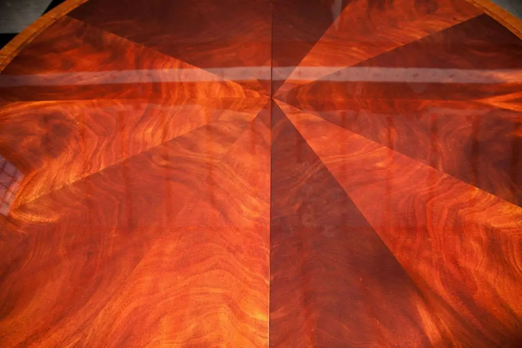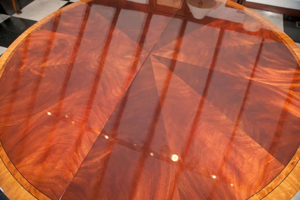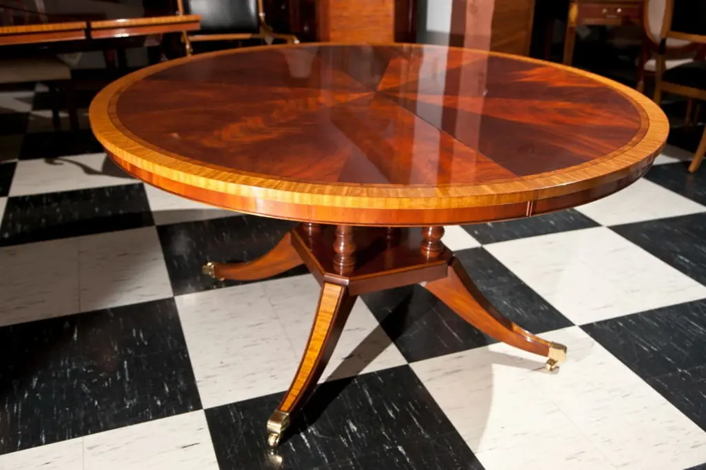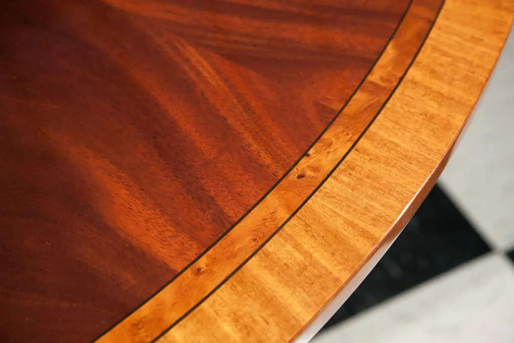 This highly functional 60" diameter dining table can seat an intimate party of four, or expand to 102" long (with its two 21" leaves) to seat a gathering of 10. When closed, the radial cut flame mahogany creates a stunning starburst effect. The double, contrasting banding of yew burl and satinwood do their best to corral visual motion of that grain. Supported by a sturdy, yet graceful, four column Duncan Phyfe style platform pedestal with satinwood band on the legs, this table is also suitable for center hall duty.