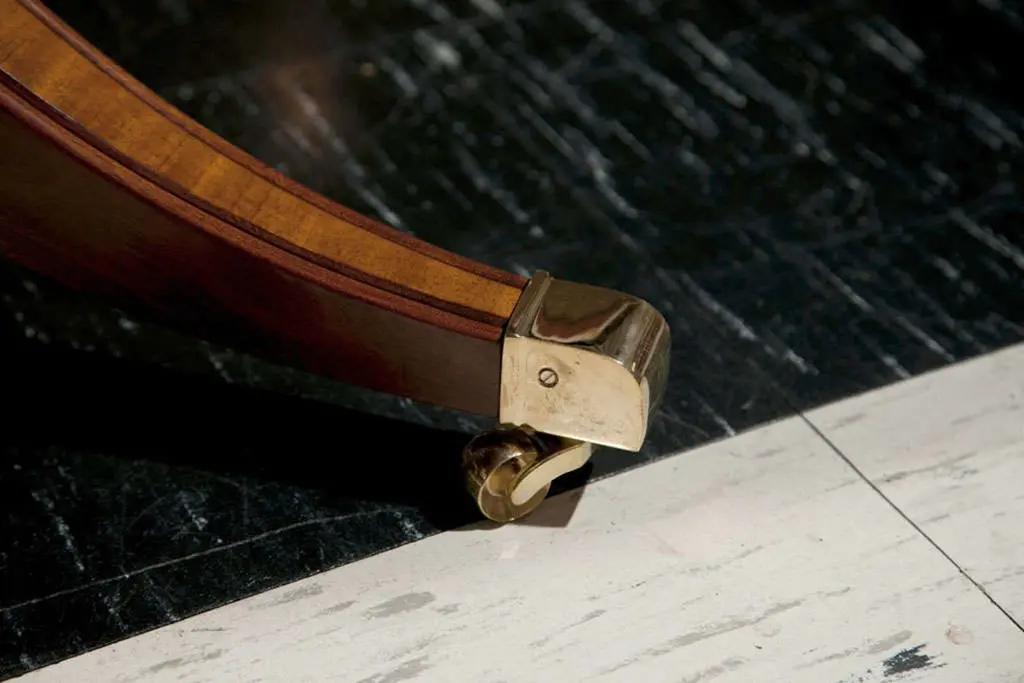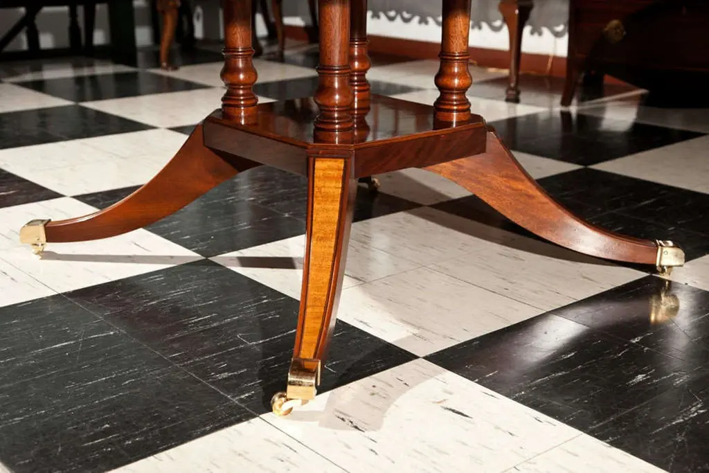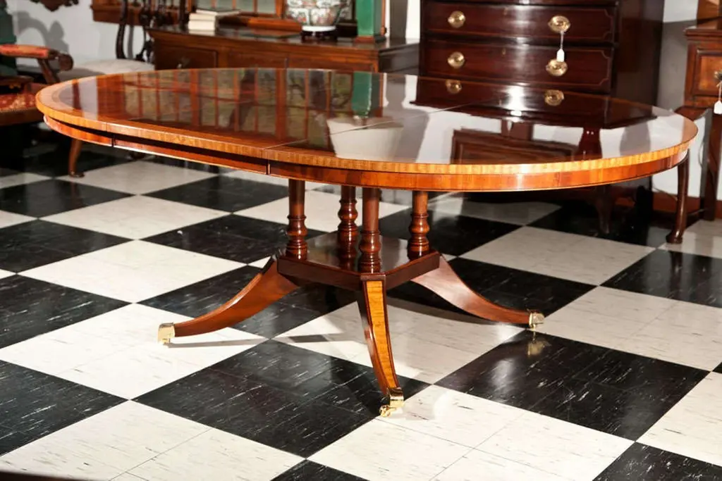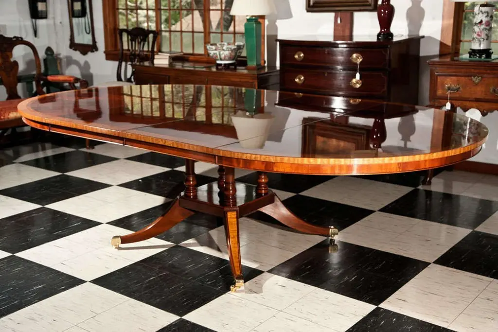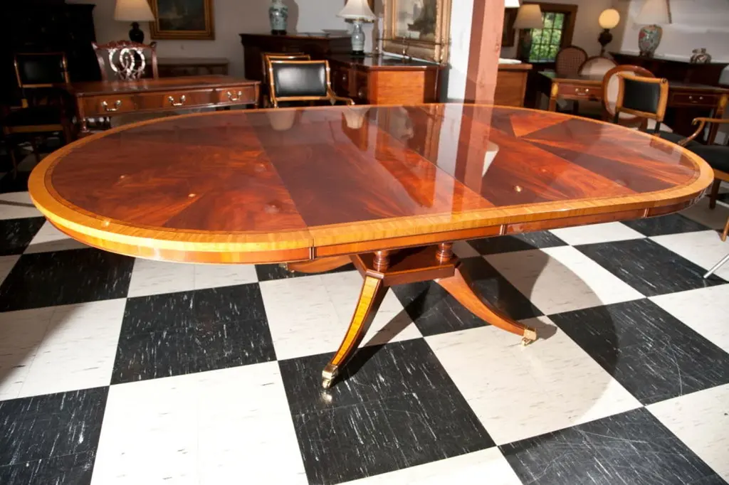 This highly functional 60" diameter dining table can seat an intimate party of four, or expand to 102" long (with its two 21" leaves) to seat a gathering of 10. When closed, the radial cut flame mahogany creates a stunning starburst effect. The double, contrasting banding of yew burl and satinwood do their best to corral visual motion of that grain. Supported by a sturdy, yet graceful, four column Duncan Phyfe style platform pedestal with satinwood band on the legs, this table is also suitable for center hall duty.