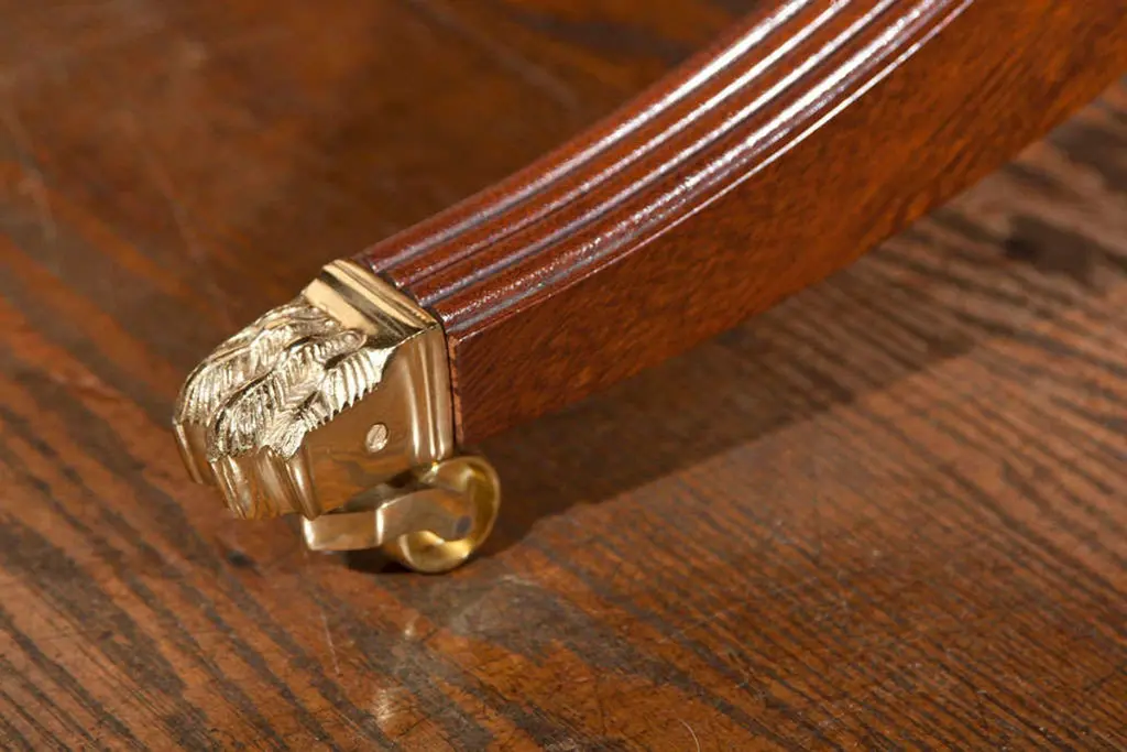 Double pedestal, flame mahogany dining table with satinwood crossbanding, beaded edge, mahogany apron. Cannon turned single column pedestals with reeded legs ending in brass "paw" toecaps with casters. The two 20" leaves extend the length to 128 inches. Also available in 54" widths as well as three-pedestal with two-leaf configuration.