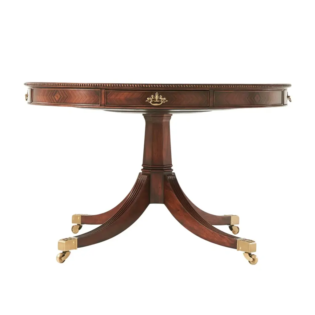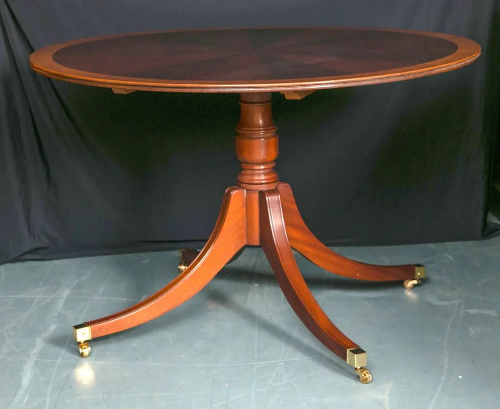 Created in the style of tables from the 18th century, this circular, mahogany starburst table is supported by a single column pedestal with four splay legs ending in brass toe caps and casters. Banded in satinwood and having a reeded edge, this table will seat four rather comfortably and six in a pinch. The style makes it a great option for a small apartment dining room, or for use as a center hall table in a larger home. Also available with 22" leaf and apron.