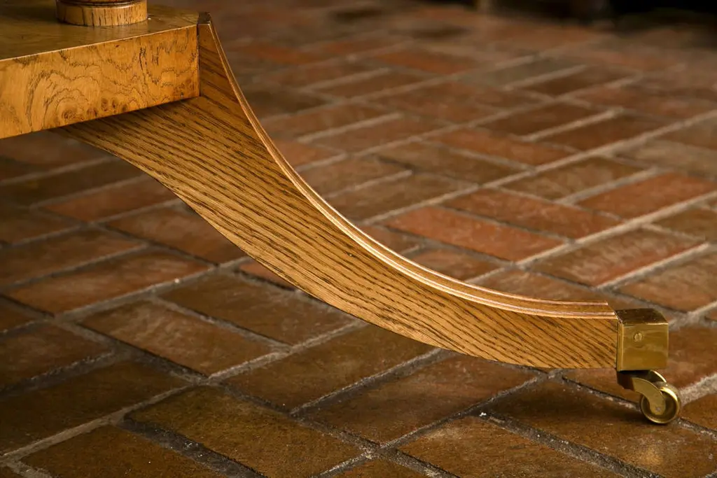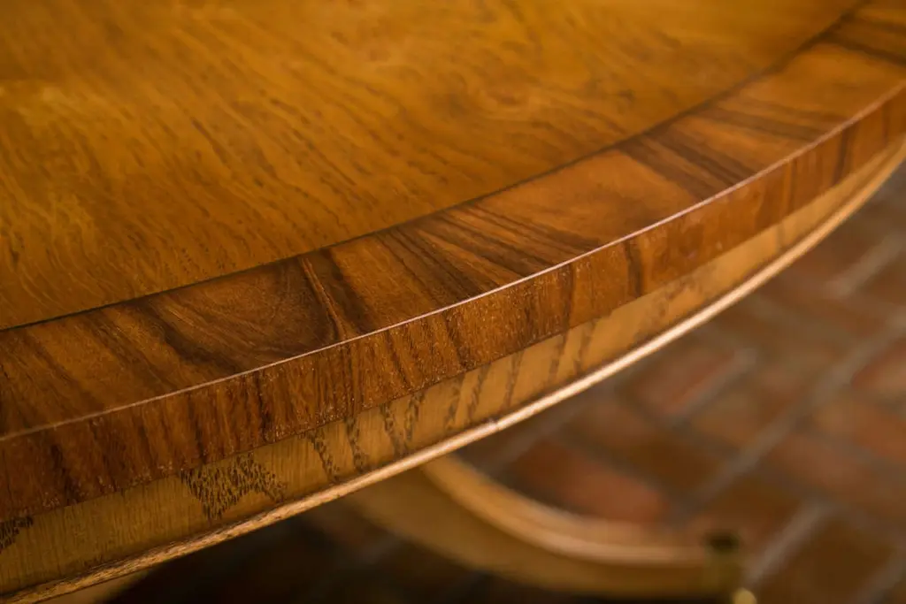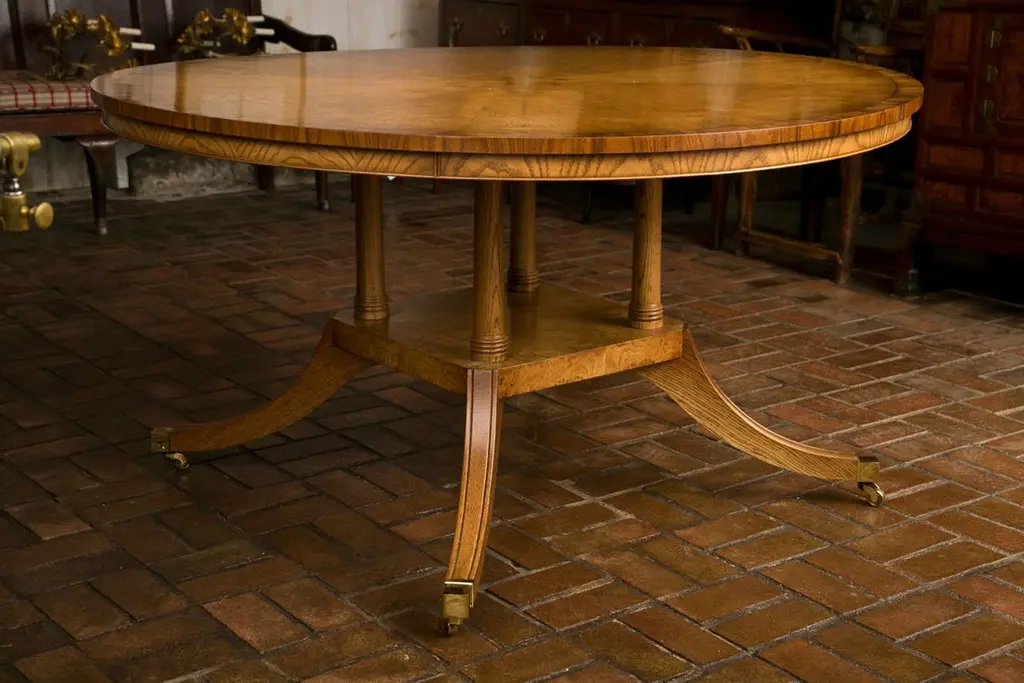 Expert meld of country and formal, this table marries two ideologies and makes them get along. Segmented pollard, or burled, oak covers the top and is visually anchored by a cross band of rosewood. Supported by a Duncan Phyfe style platform pedestal base, this table is suited for duty in a center hall or dining room. Measures: 60".