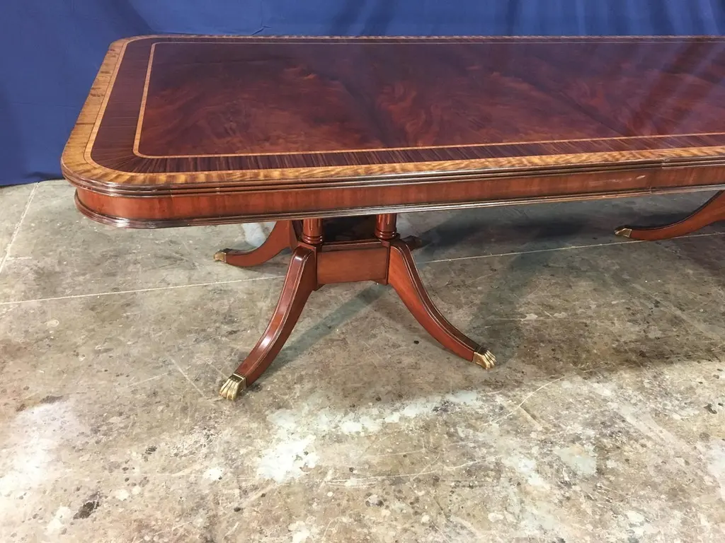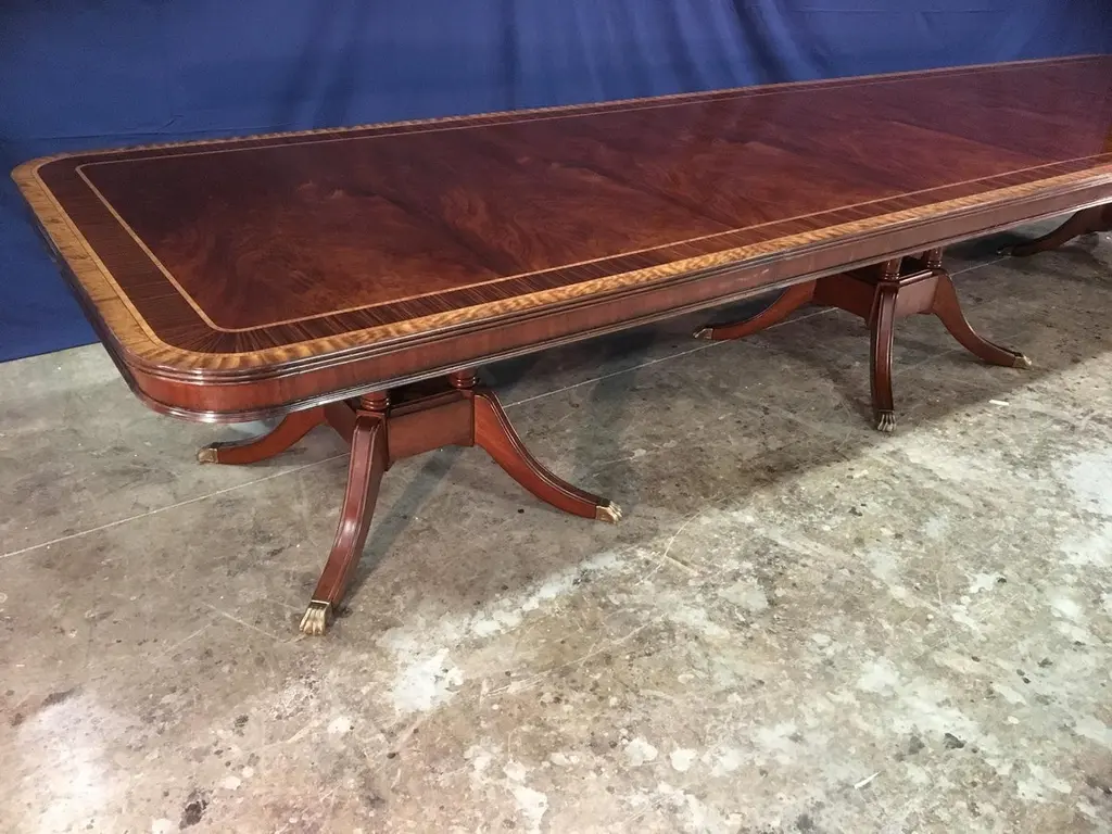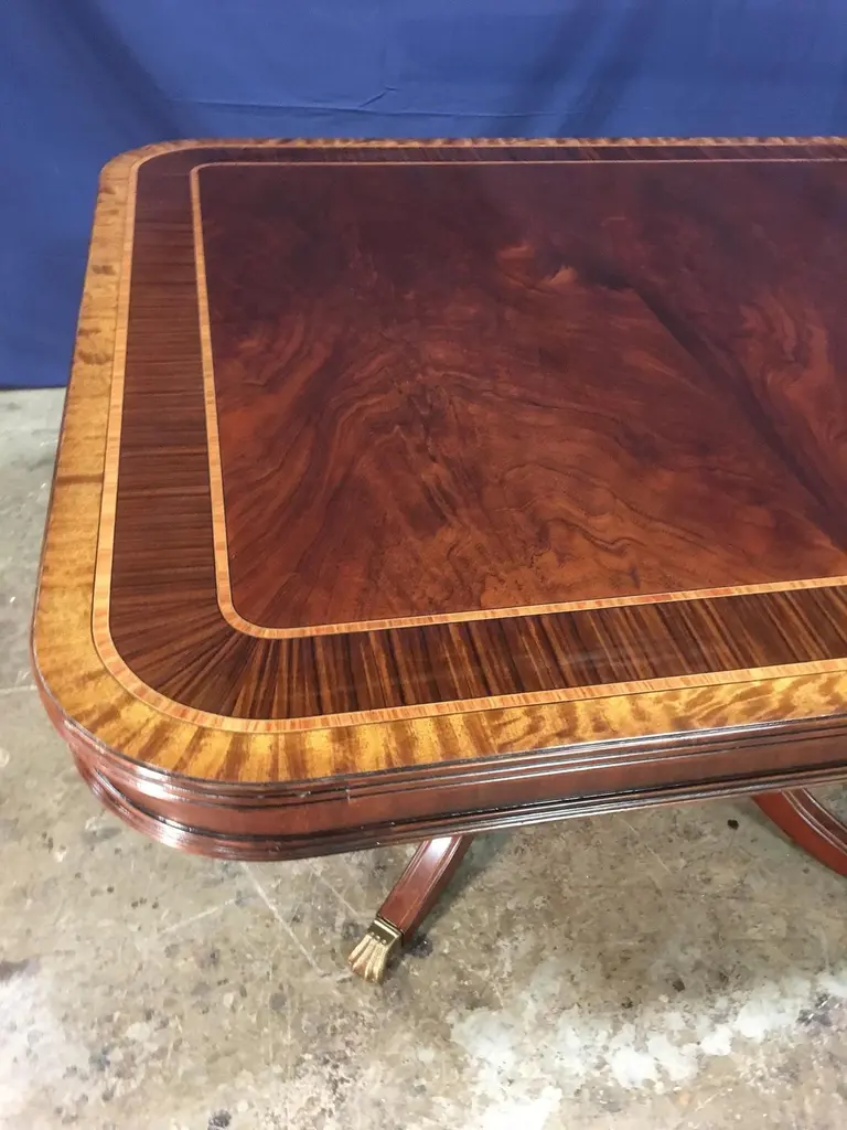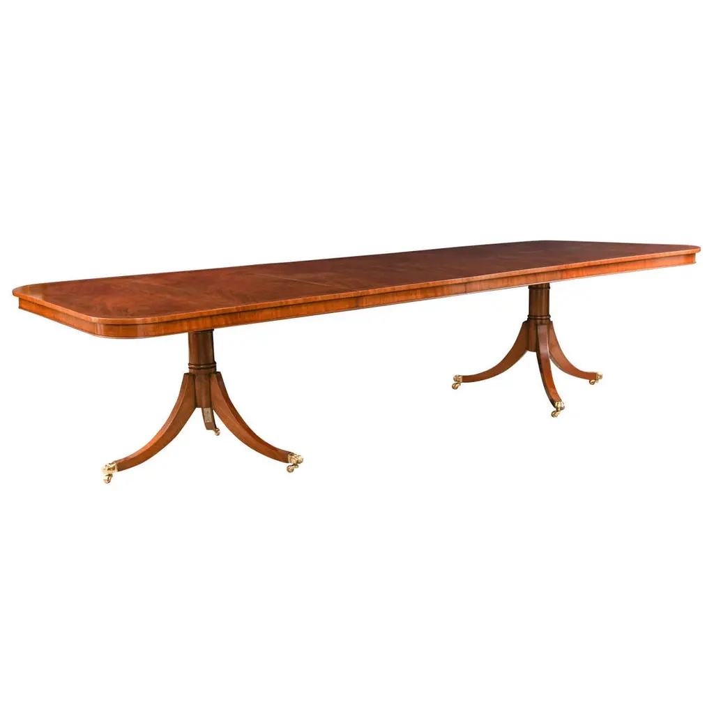 This is a made-to-order large traditional mahogany banquet/dining table made in the Leighton Hall shop. It features a field of slip-matched swirly crotch mahogany from west Africa and satinwood and santos rosewood borders from South America. It has a hand rubbed and polished semigloss finish. The birdcage style pedestals have four columns with fluted legs which terminate with antique brass lions paw feet. Dimensions: 52 in. x 96 in. with two 48 in. Leaves (total length with leaves inserted is 192 in.) This table can be purchased as shown, or it can be customized to your desired size and design. We can make a bench-made, one-of-a-kind table in our shop to your specifications. Lengths of 16, 20, 24, 28, 32 ft. or longer. Widths up to 66 in. Optional borders include: burled walnut, straight grain mahogany, movingue, and more. Optional brass feet: Lions paw or toe caps. Optional brass feet sheen: shiny/polished, antiqued as shown), heavily antiqued, and with casters. Other options available. Price will vary depending upon options.