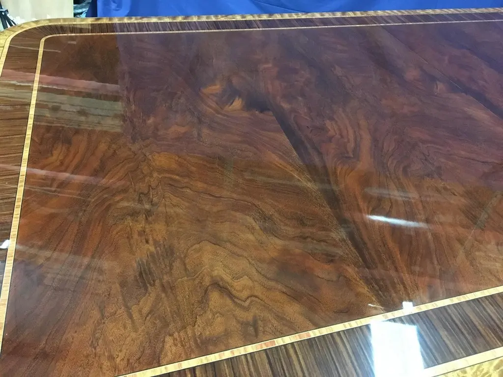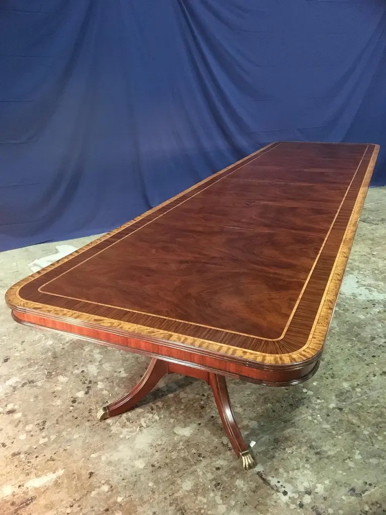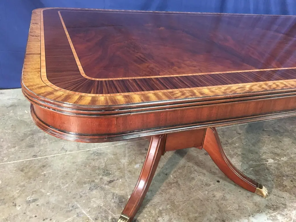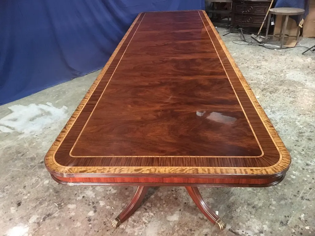 This is a made-to-order large traditional mahogany banquet/dining table made in the Leighton Hall shop. It features a field of slip-matched swirly crotch mahogany from west Africa and satinwood and santos rosewood borders from South America. It has a hand rubbed and polished semigloss finish. The birdcage style pedestals have four columns with fluted legs which terminate with antique brass lions paw feet. Dimensions: 52 in. x 96 in. with two 48 in. Leaves (total length with leaves inserted is 192 in.) This table can be purchased as shown, or it can be customized to your desired size and design. We can make a bench-made, one-of-a-kind table in our shop to your specifications. Lengths of 16, 20, 24, 28, 32 ft. or longer. Widths up to 66 in. Optional borders include: burled walnut, straight grain mahogany, movingue, and more. Optional brass feet: Lions paw or toe caps. Optional brass feet sheen: shiny/polished, antiqued as shown), heavily antiqued, and with casters. Other options available. Price will vary depending upon options.