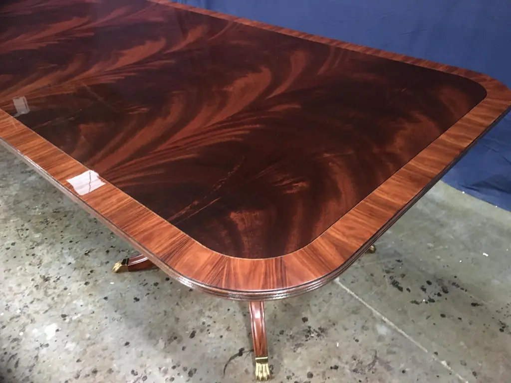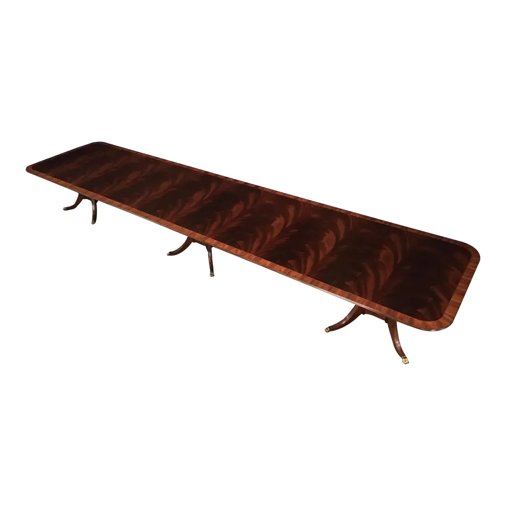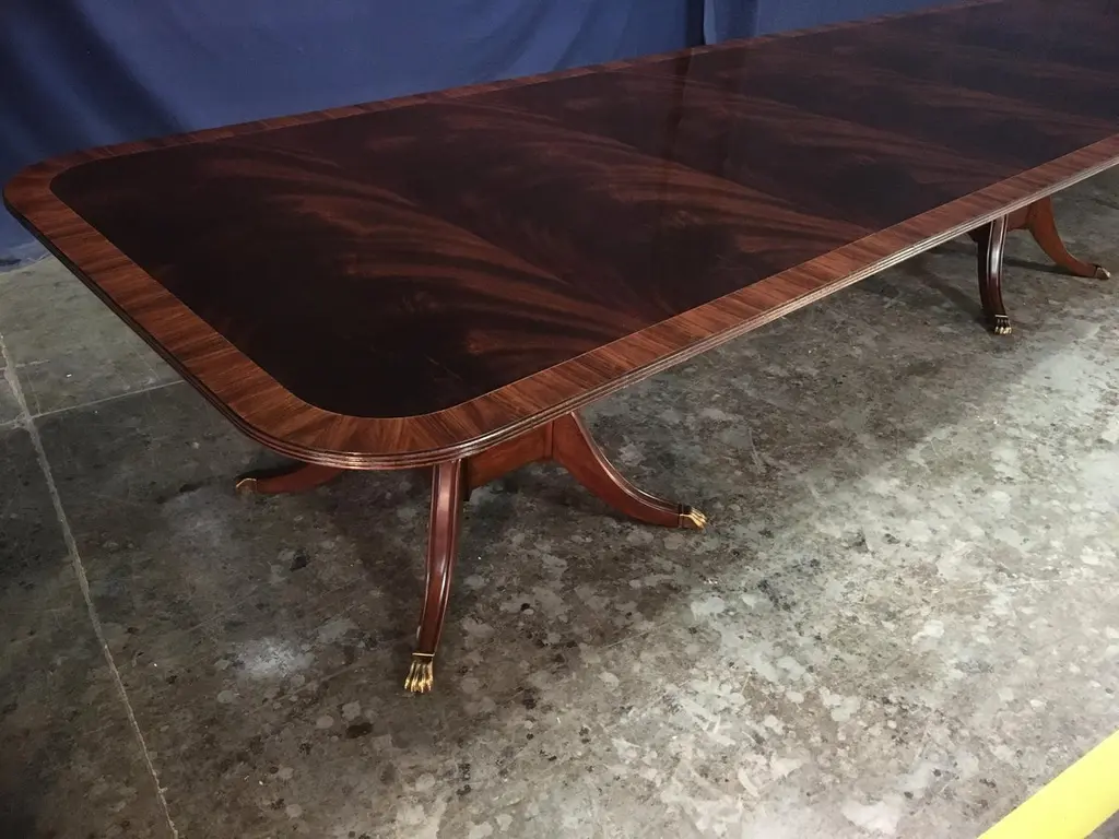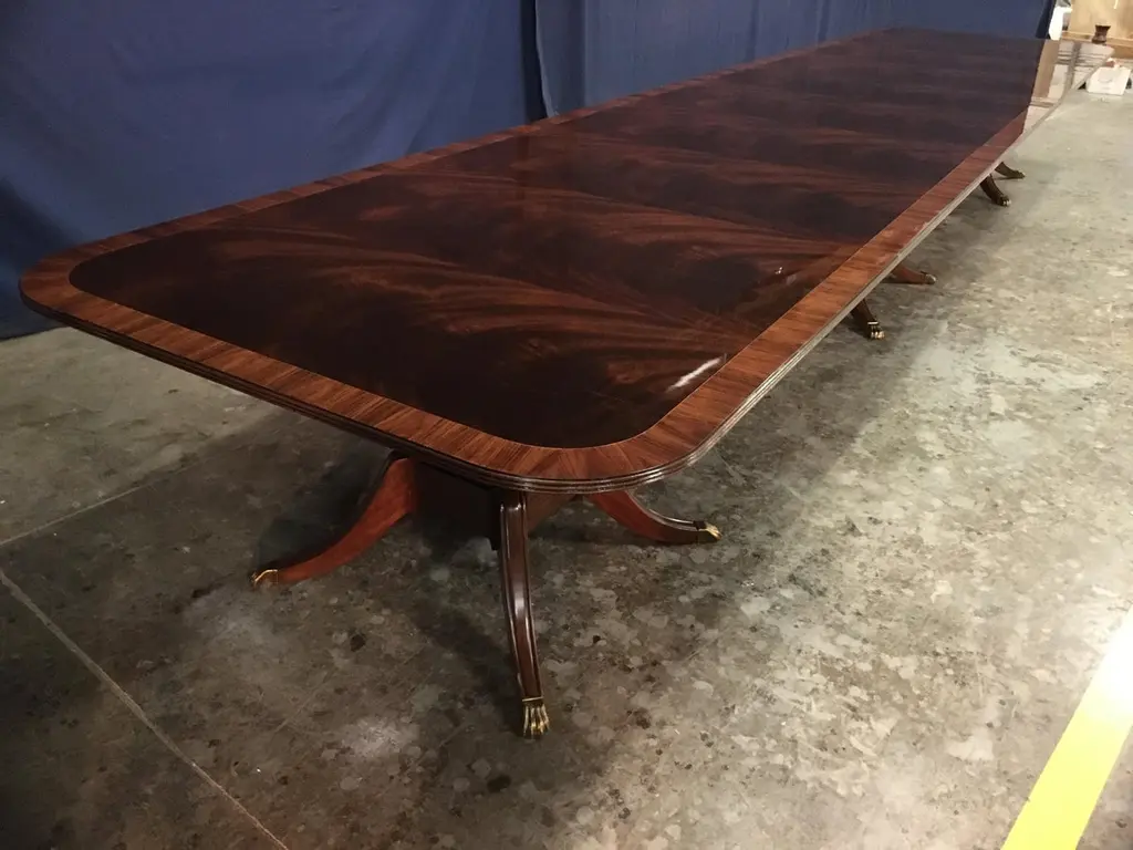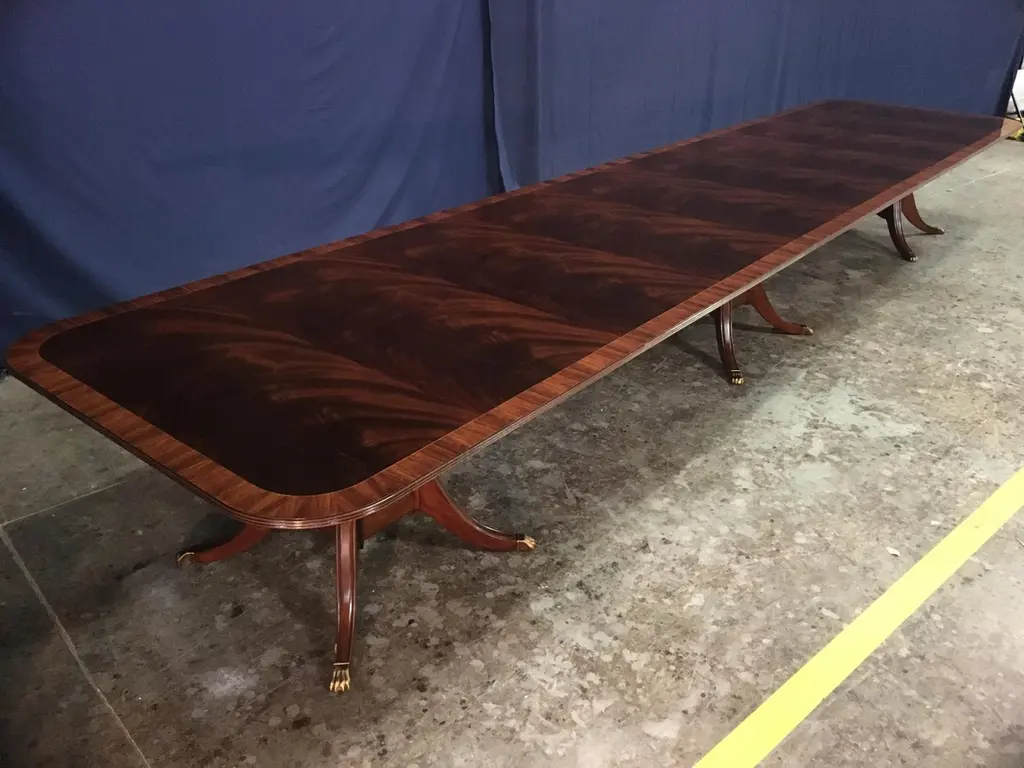 This is a made-to-order large traditional mahogany banquet/dining table made in the Leighton Hall shop. It features a field of slip-matched swirly crotch mahogany from West Africa and a Santos Rosewood border. It has a hand rubbed and polished semigloss finish. The birdcage style pedestals have four columns with fluted legs which terminate with antique brass lions paw feet. Dimensions: 54 in. x 96 in. with three 48 in. Sections (total length with all three section inserted is 240 in.). This table can be purchased as shown, or it can be customized to your desired size and design. We can make a bench-made, one of a kind table in our shop to your specifications. Lengths of 16, 20, 24, 28, 32 ft. or longer. Widths up to 66 in. Optional borders include: burled walnut, straight grain mahogany, movingue, and more. Optional brass feet: Lions paw or toe caps. Optional brass feet sheen: Polished, antiqued (as shown), and with casters. Other options available. Price and production time may vary depending upon options.