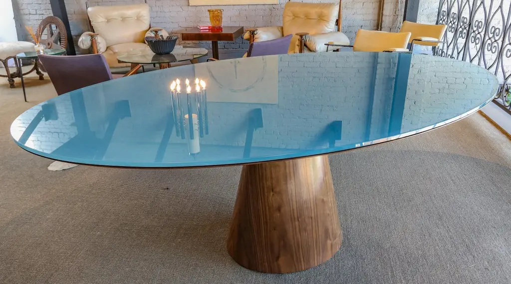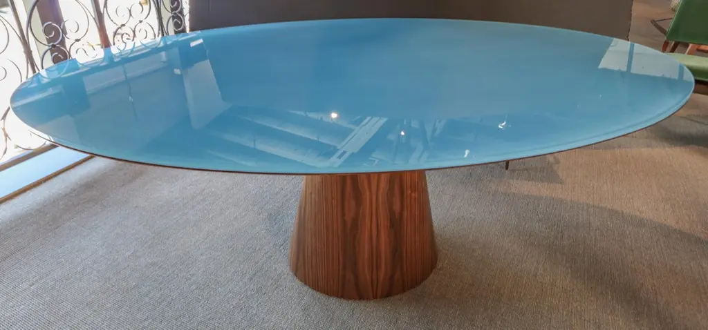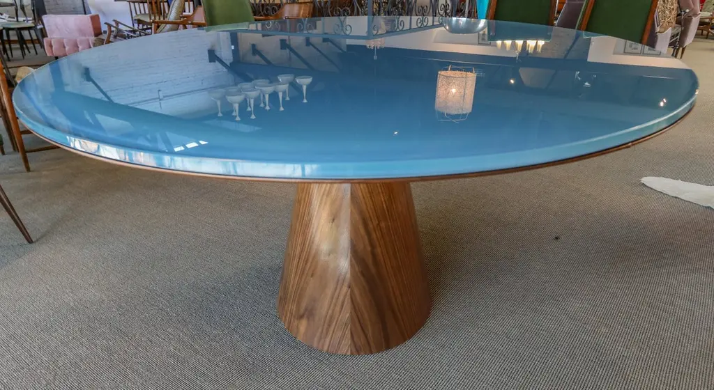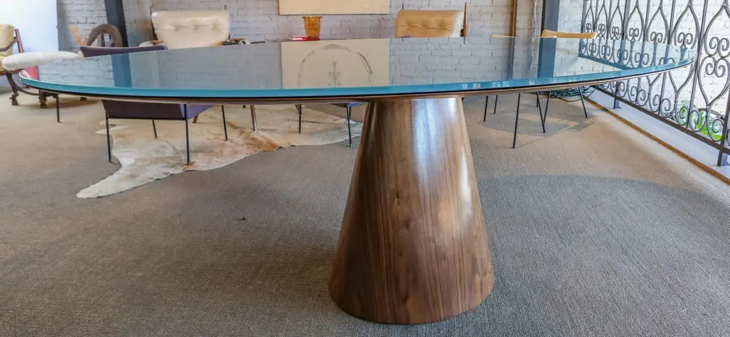 Custom oval dining table with pedestal leg made in American walnut with blue reverse painted glass top. Made in Los Angeles by Adesso Imports.Can be done in different woods, finishes and sizes.