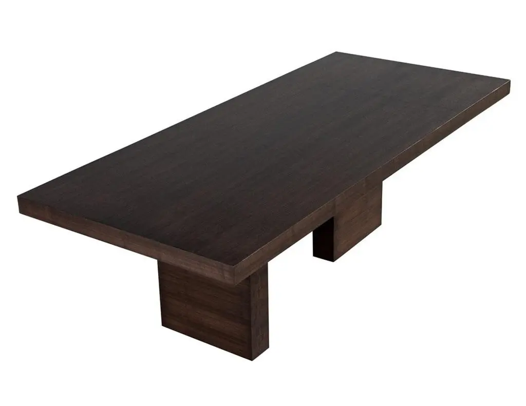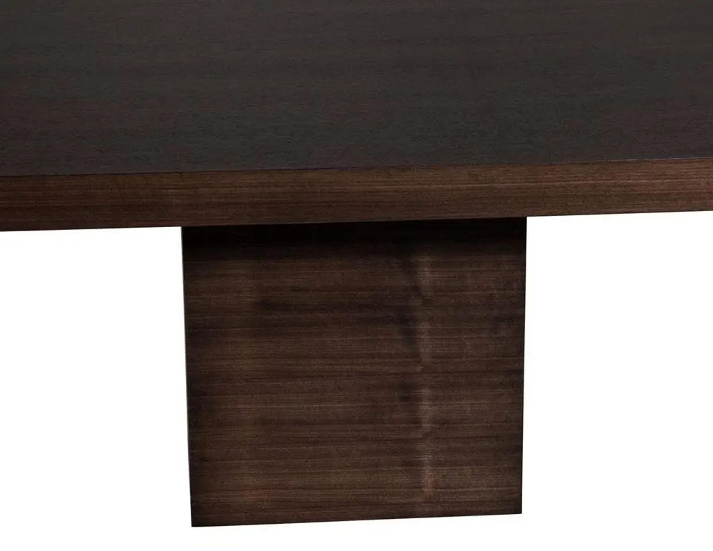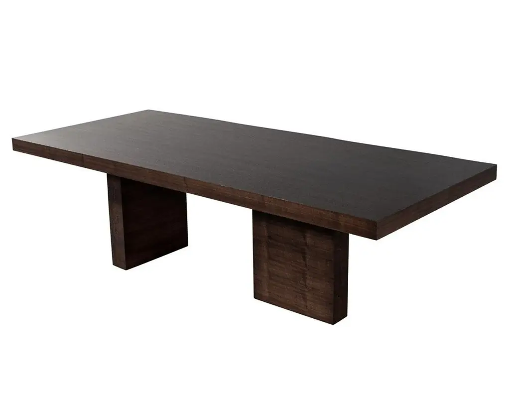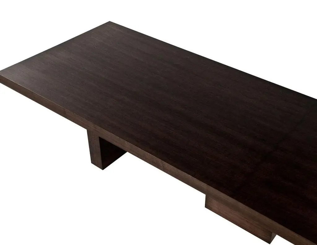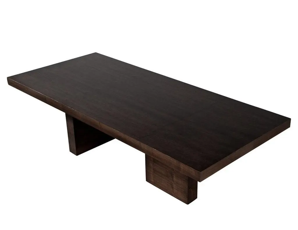 Custom modern walnut dining table with column pedestals by Carrocel. Hand crafted and made to order, simplistic modern styling with clean grain walnut pattern. Thick top with rectangular column pedestals. Finished in a satin dark espresso walnut. Price includes complimentary curb side delivery to the continental USA.