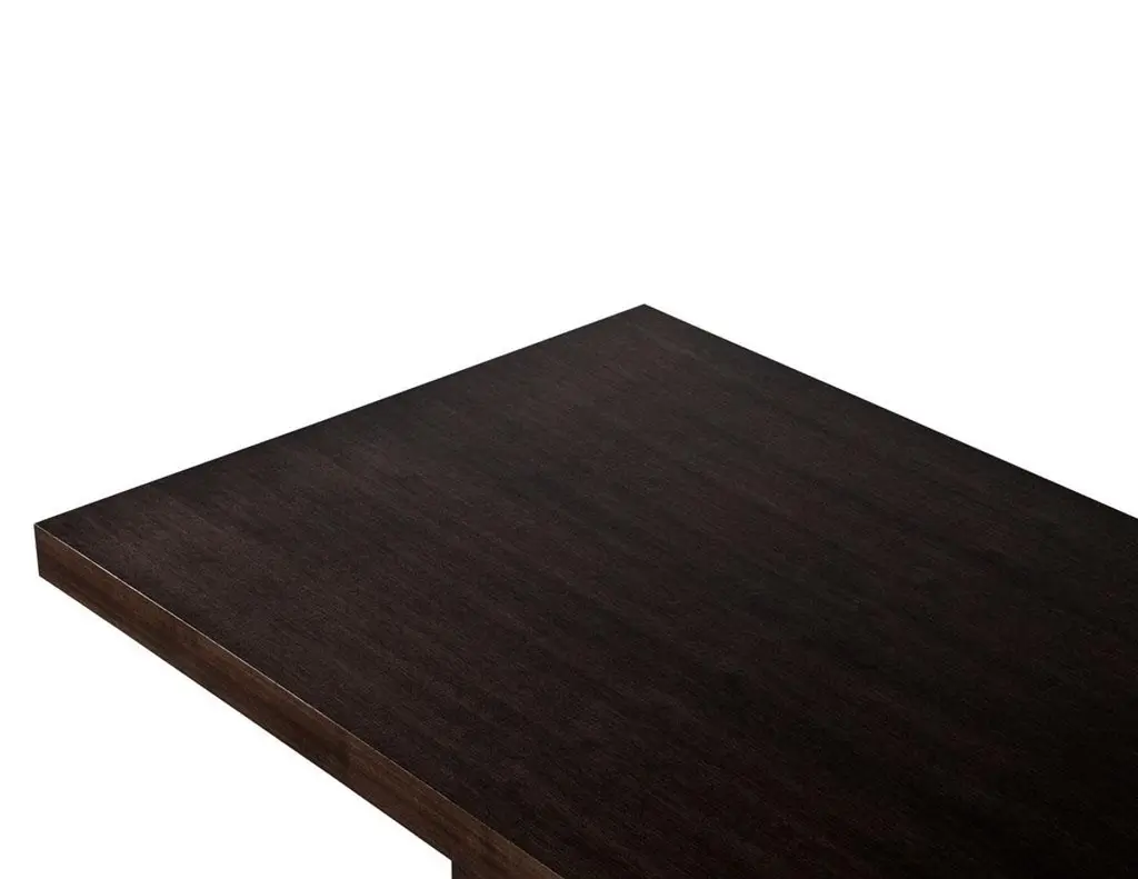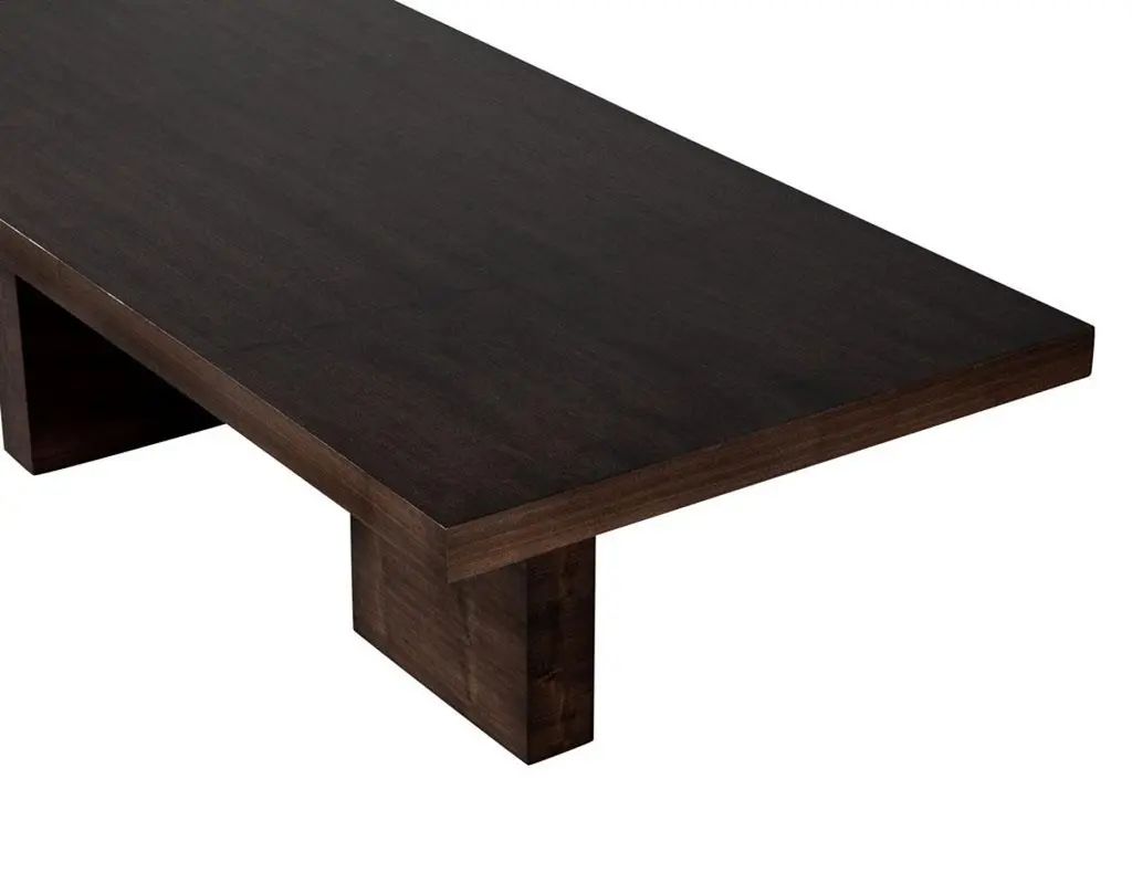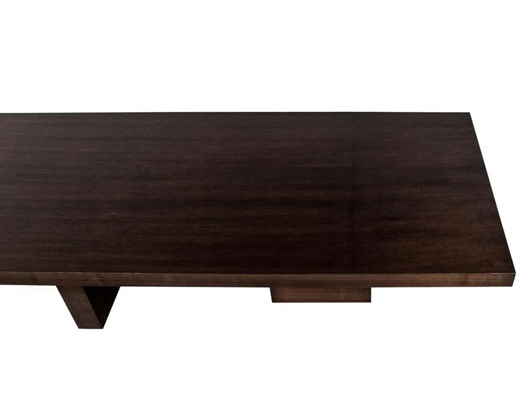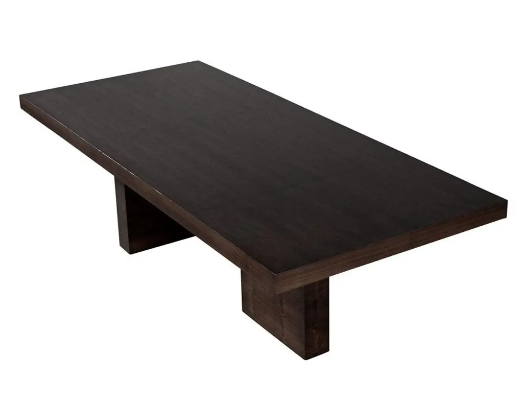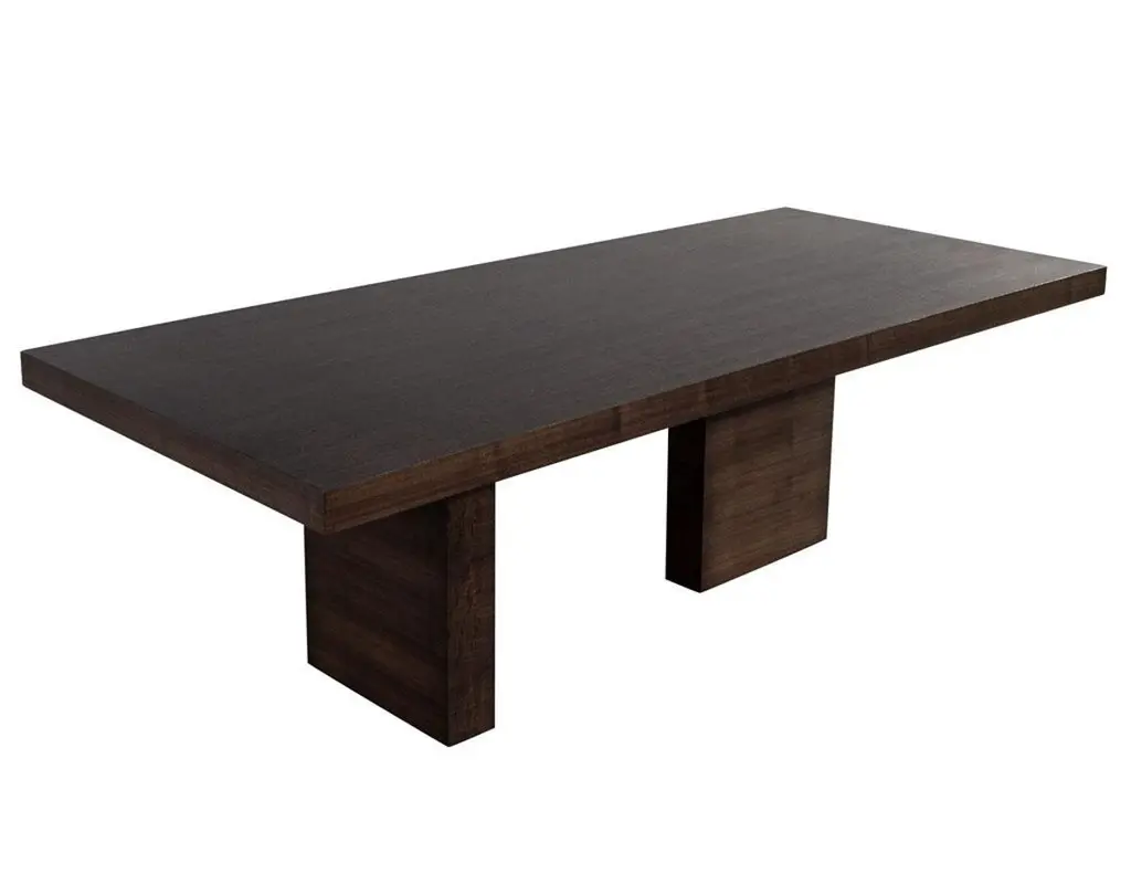 Custom modern walnut dining table with column pedestals by Carrocel. Hand crafted and made to order, simplistic modern styling with clean grain walnut pattern. Thick top with rectangular column pedestals. Finished in a satin dark espresso walnut. Price includes complimentary curb side delivery to the continental USA.
