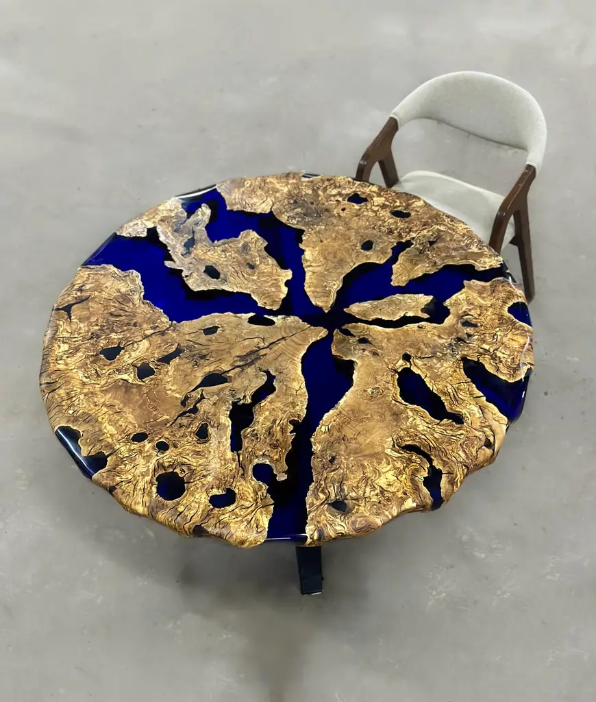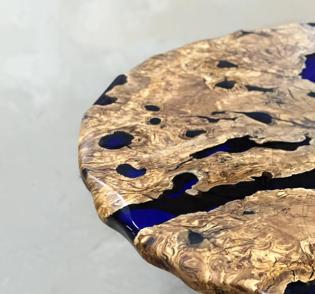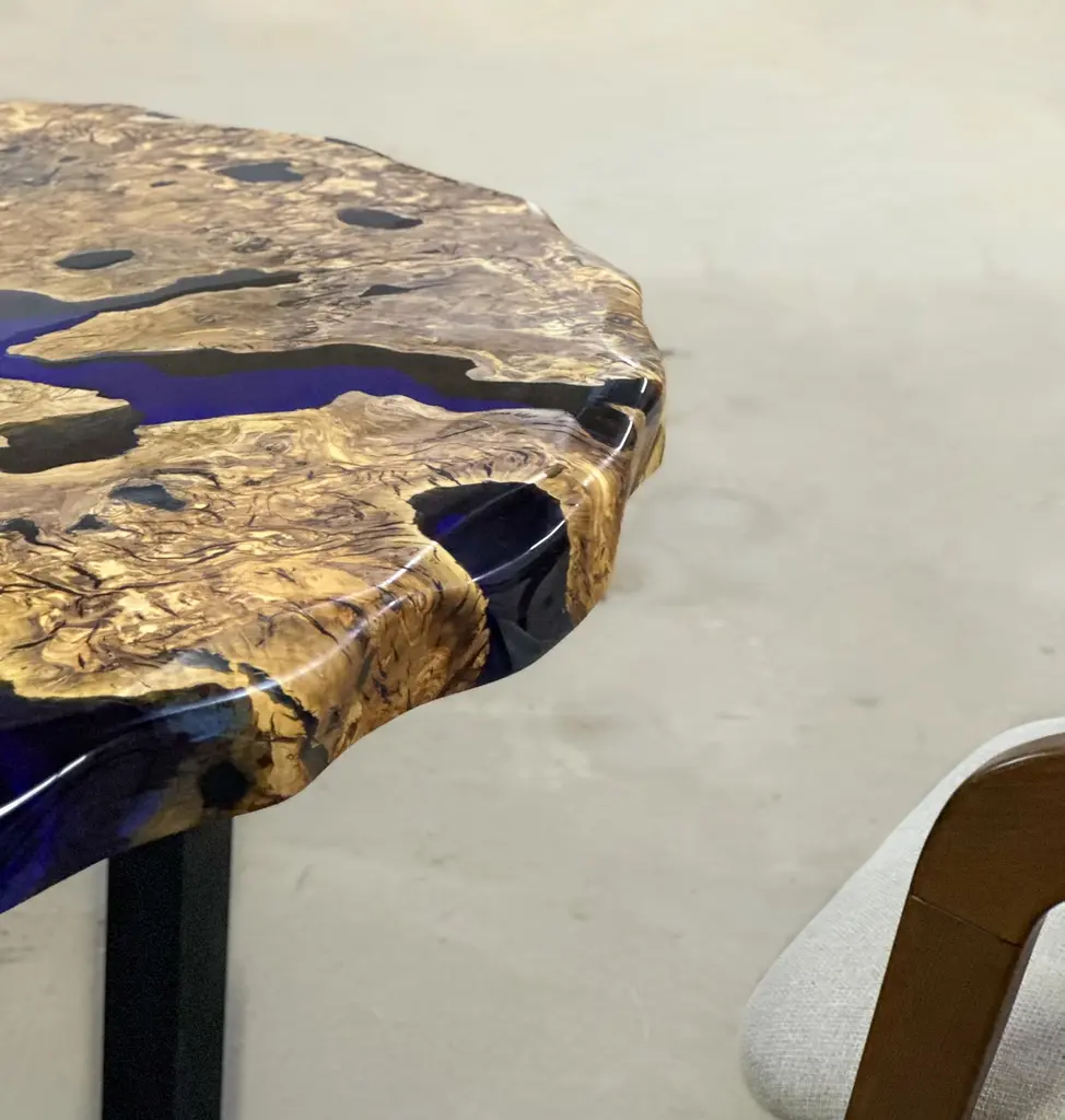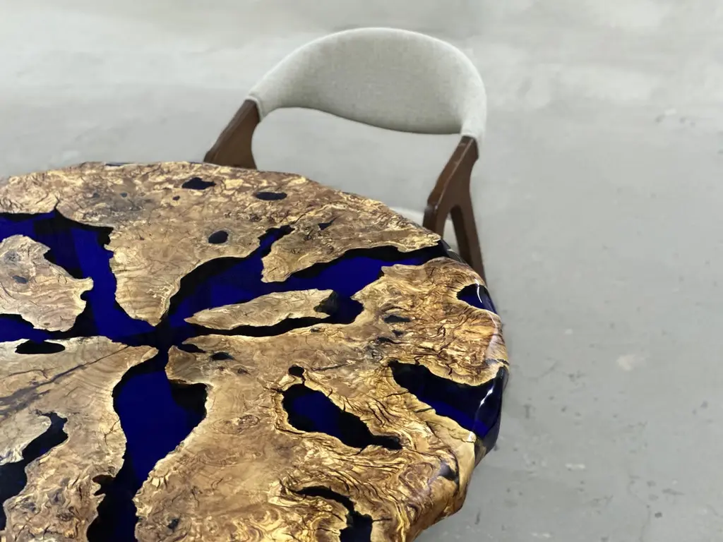 Olive Custom Blue Epoxy Resin Round Dining Table This table is made of 500 years old olive wood. The grains and texture of the wood describe what a natural olive woods looks like.It can be used as a dining table or as a conference table. Suitable for indoor use.All of our tables are made of from natural woods. Therefore, each one has to be different with its own unique shape. The epoxy used in the production of the table has been appreciated by all our customers so far with its transparency. The epoxy color can be matt or glossy.The table legs are made of wood & metal. We have different leg options. The table legs can be made as you wish.For more information, please contact us.