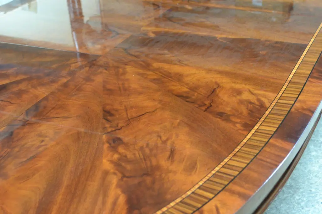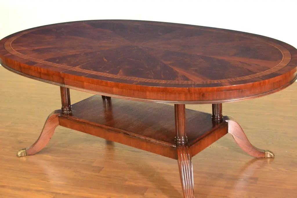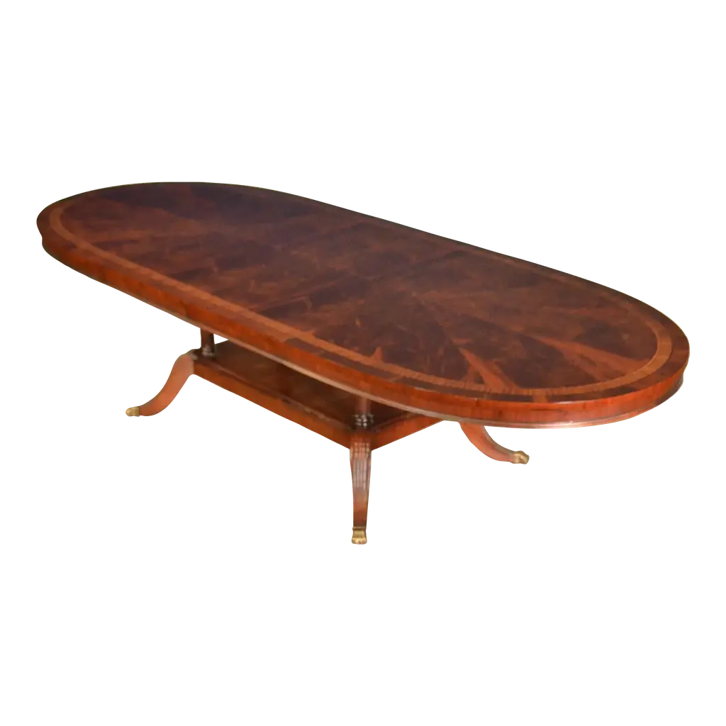 This is made-to-order oval traditional mahogany dining table made in the Leighton Hall shop. It features a radial cut field of west African swirly crotch mahogany and two borders of santos rosewood and crotch mahogany. The top has a hand rubbed and polished semigloss finish. The large birdcage pedestal has fluted legs which terminate with antique brass lions paw feet. The table also features fold down legs on each end for added support when all three leaves are inserted.Dimensions: 84 in long; 50 in wide, 30.5 in. high. This table has three 22 in. leaves. With the leaves inserted it becomes a oval table 150 in. long.It is available with optional finishes and optional feet.
